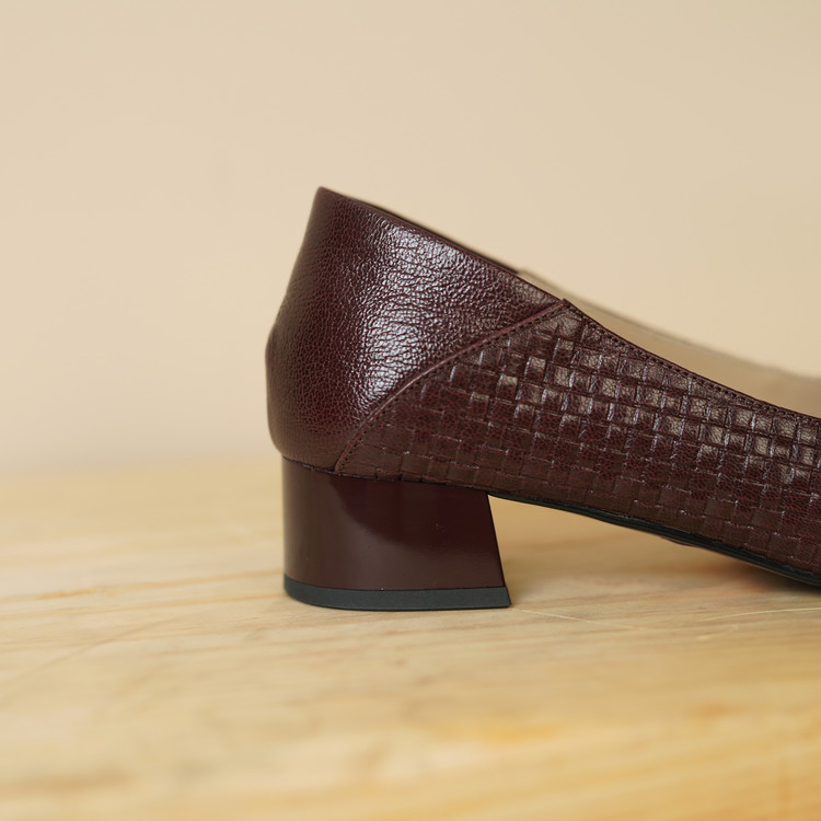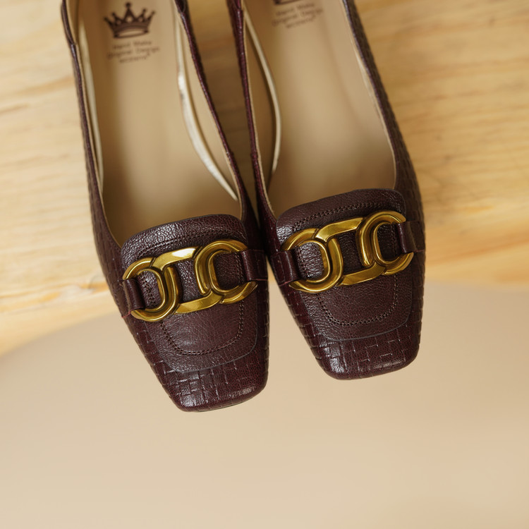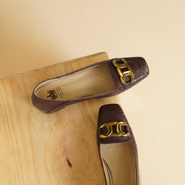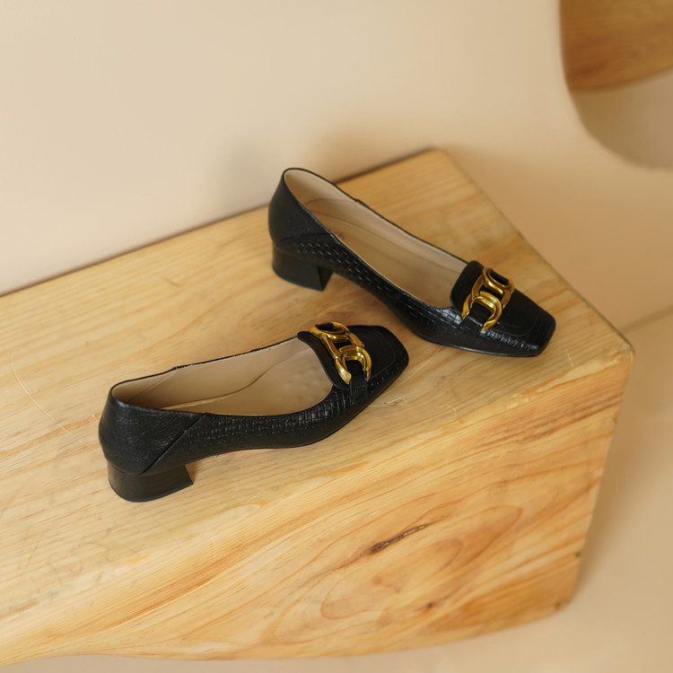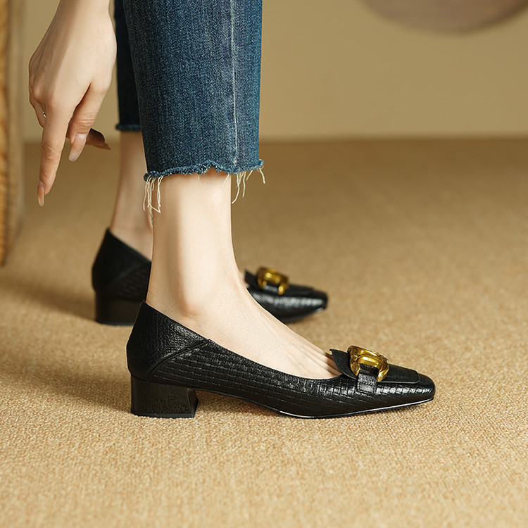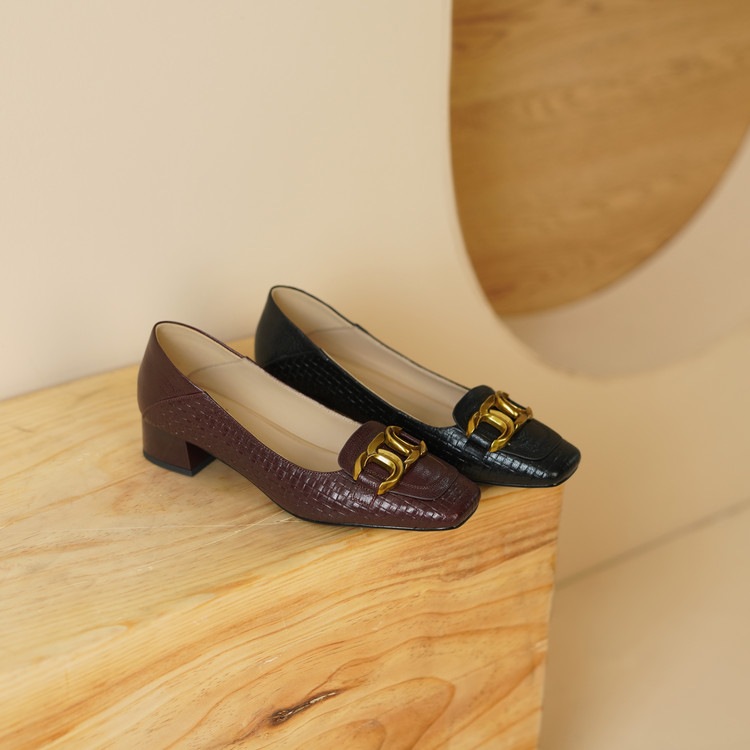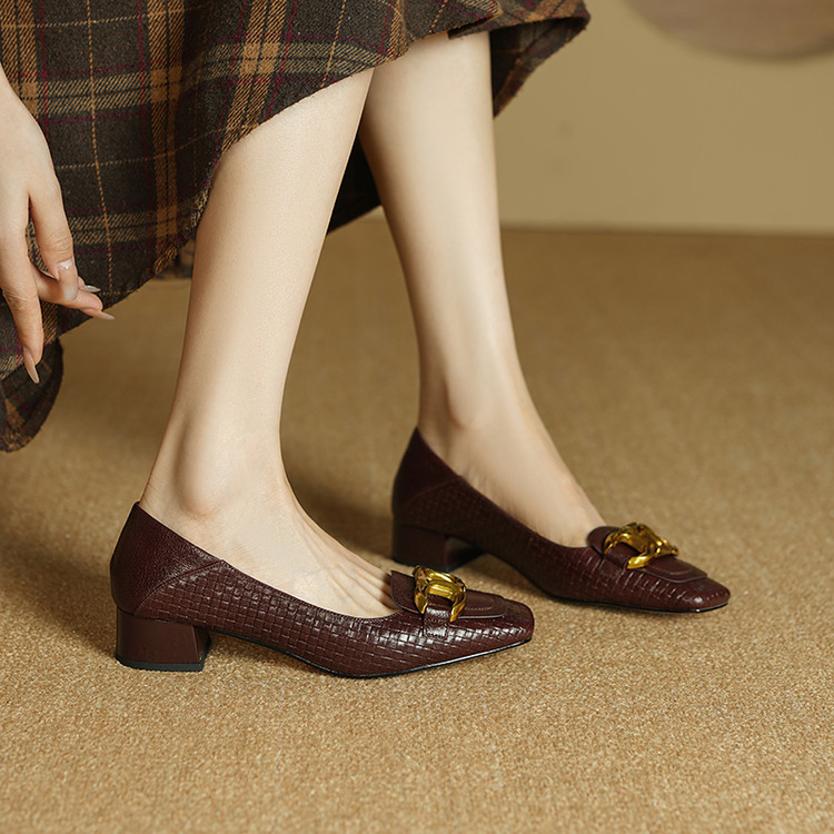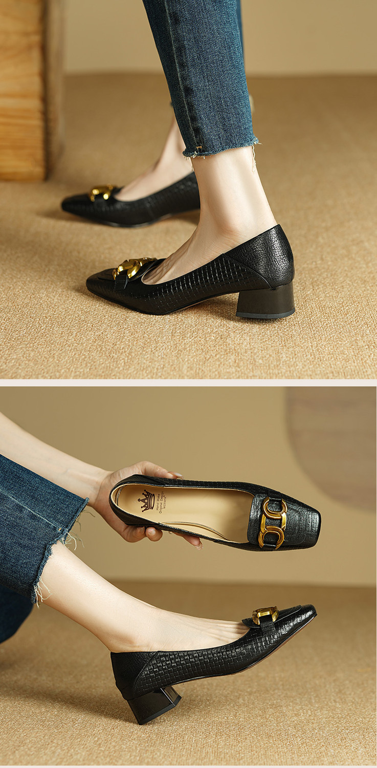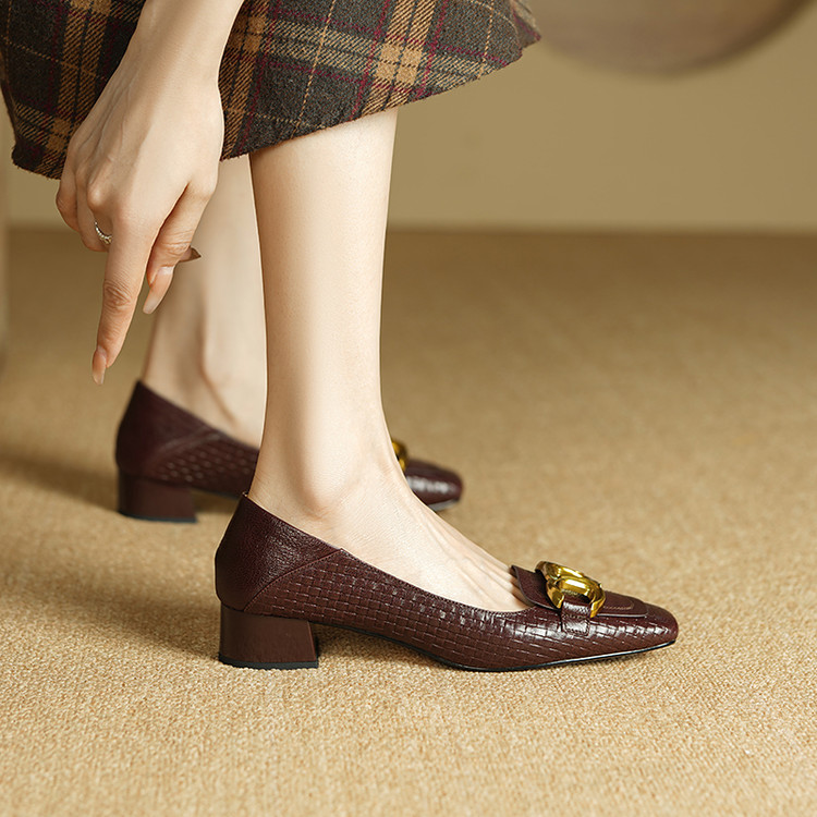【预售5天】秋季新款方头单鞋女浅口中跟鞋粗跟金属方扣复古棕色XKDY&X5660