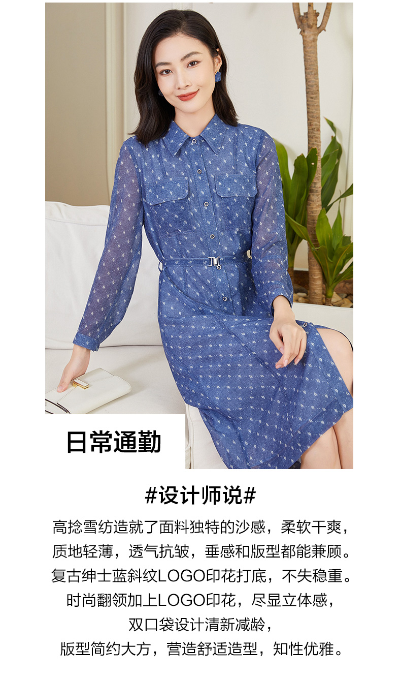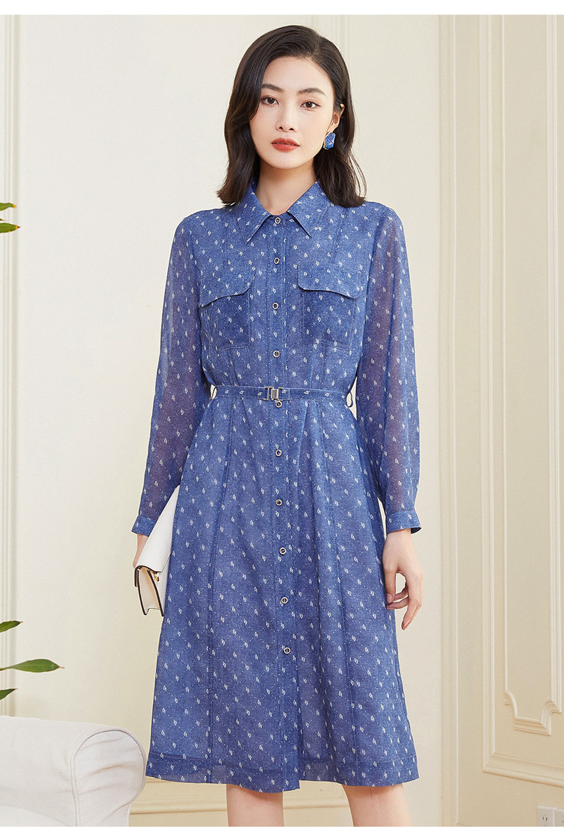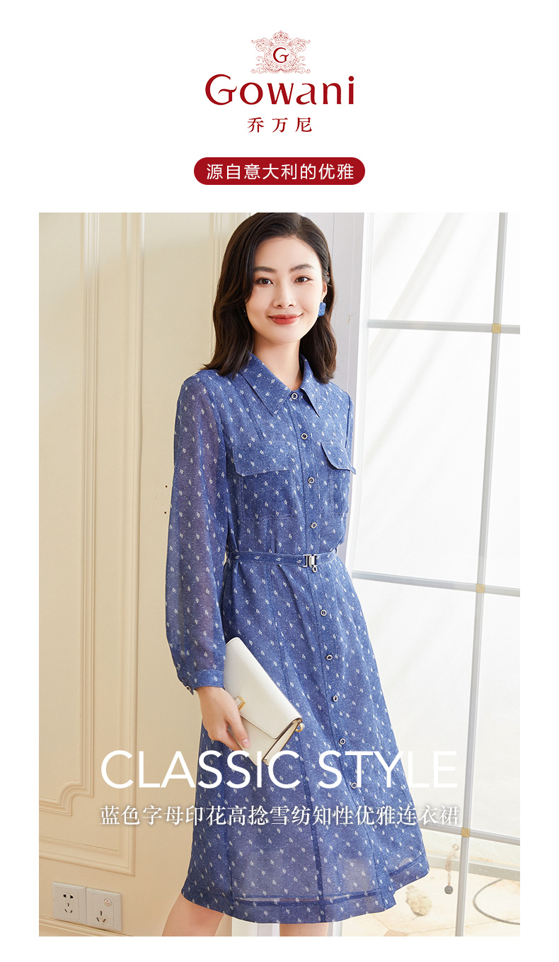 乔万尼春新款蓝色印花修身优雅气质长袖雪纺连衣裙EF3E885