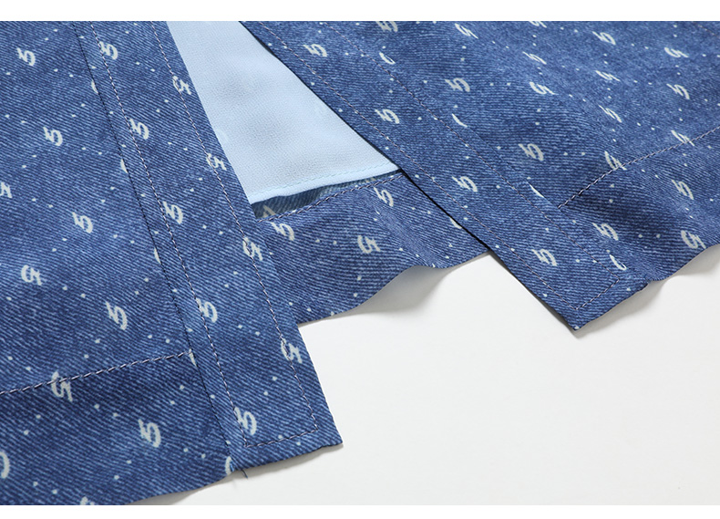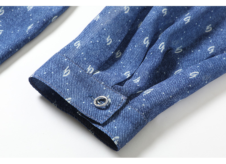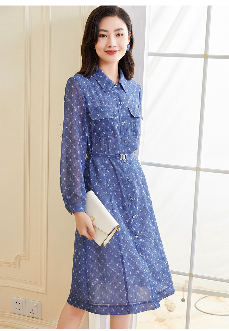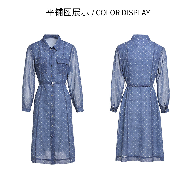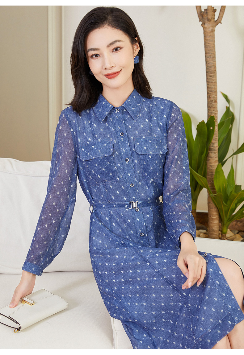 乔万尼春新款蓝色印花修身优雅气质长袖雪纺连衣裙EF3E885