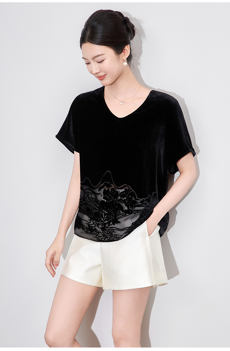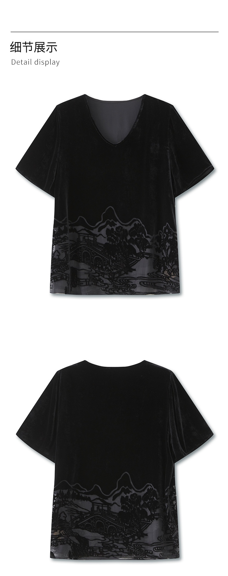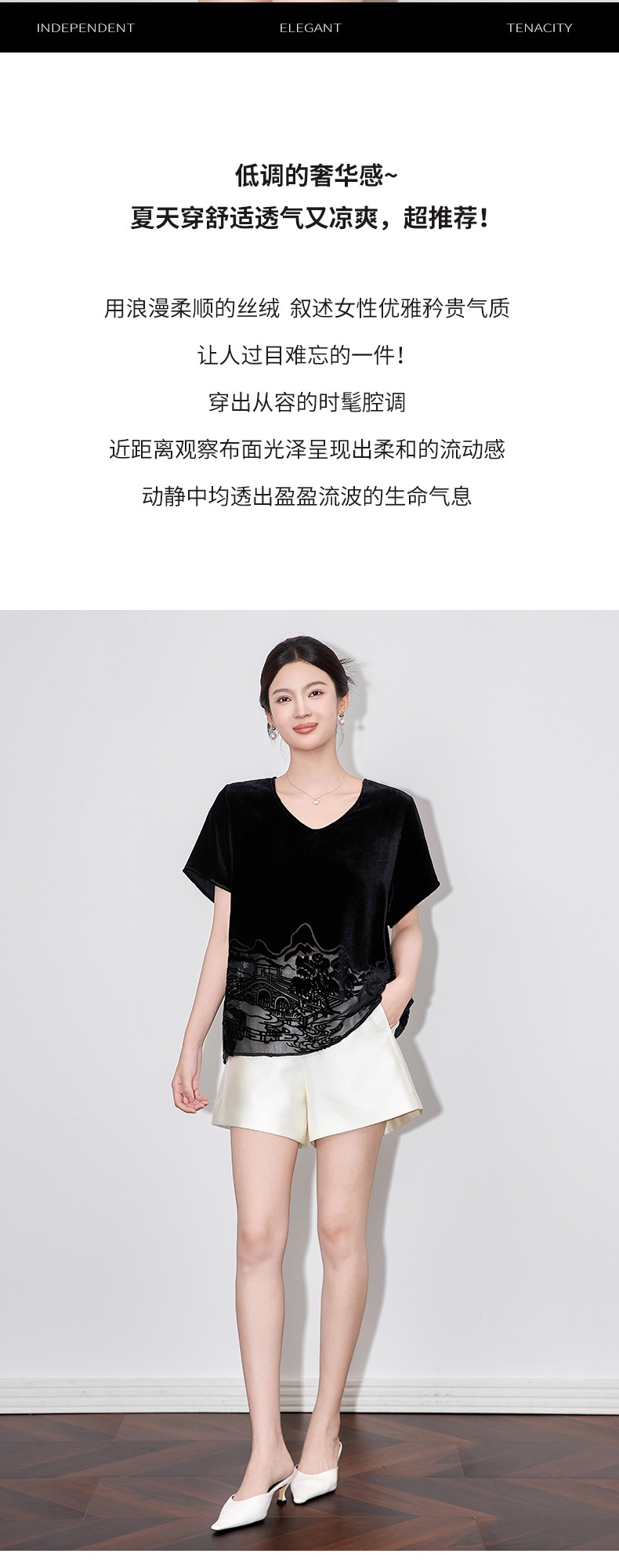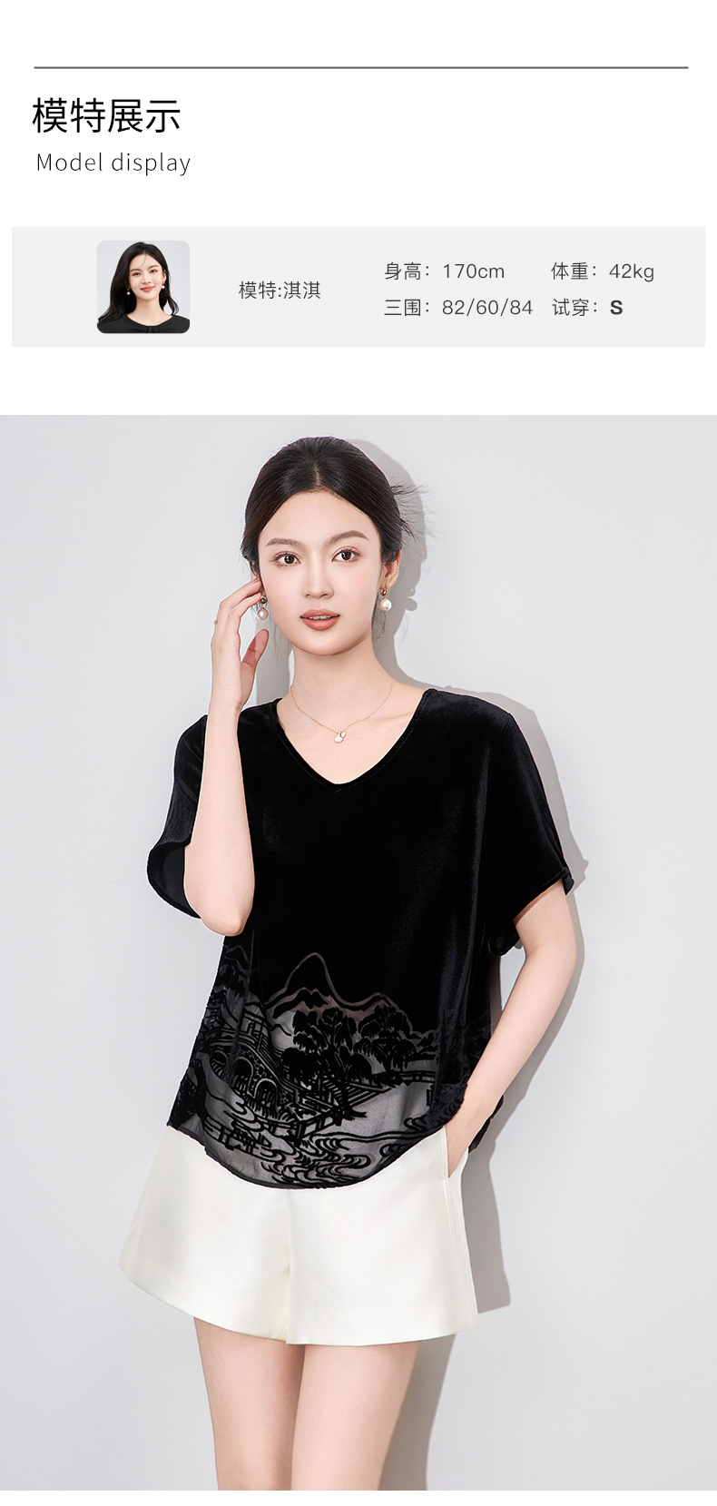 「高货wl」全新升级【铂金会员321/天猫429/差价108】(42010)洛诗琳国风高品质时髦洋气V领山水画烧花真丝丝绒上衣女