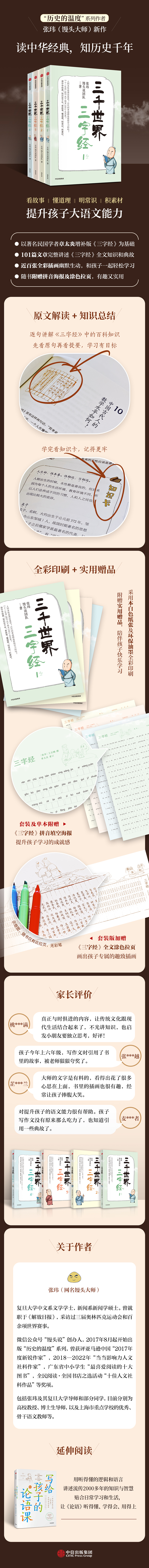 “历史的温度”系列作者张玮(馒头师)携馒头说团队推出的国学启蒙读物,用故事讲述《三字经》里蕴藏的知识和典故。以著名民国学者章太炎增补版《三字经》为基础,共101篇文章,完整讲述《三字经》中从为人到处世,从文学到常识,从天文到地理,从哲学到历史,从元典到名人的道理和典故。