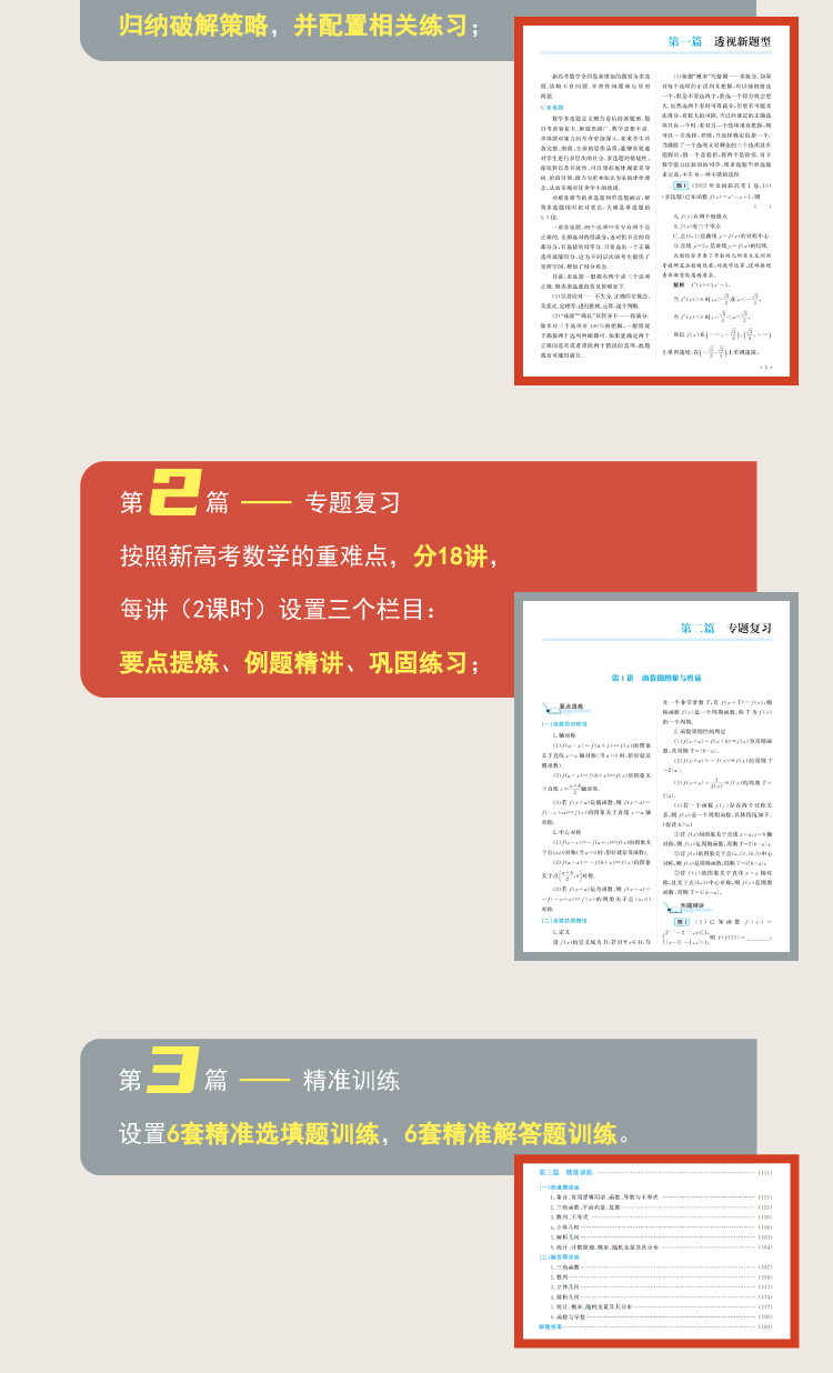 第二篇,专题复习——按照新高考数学的重难点,分18讲,每讲(2课时)设置三个栏目:要点提炼、例题精讲、巩固练习;