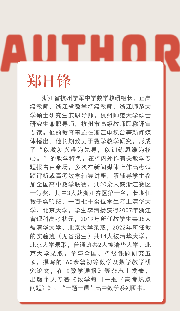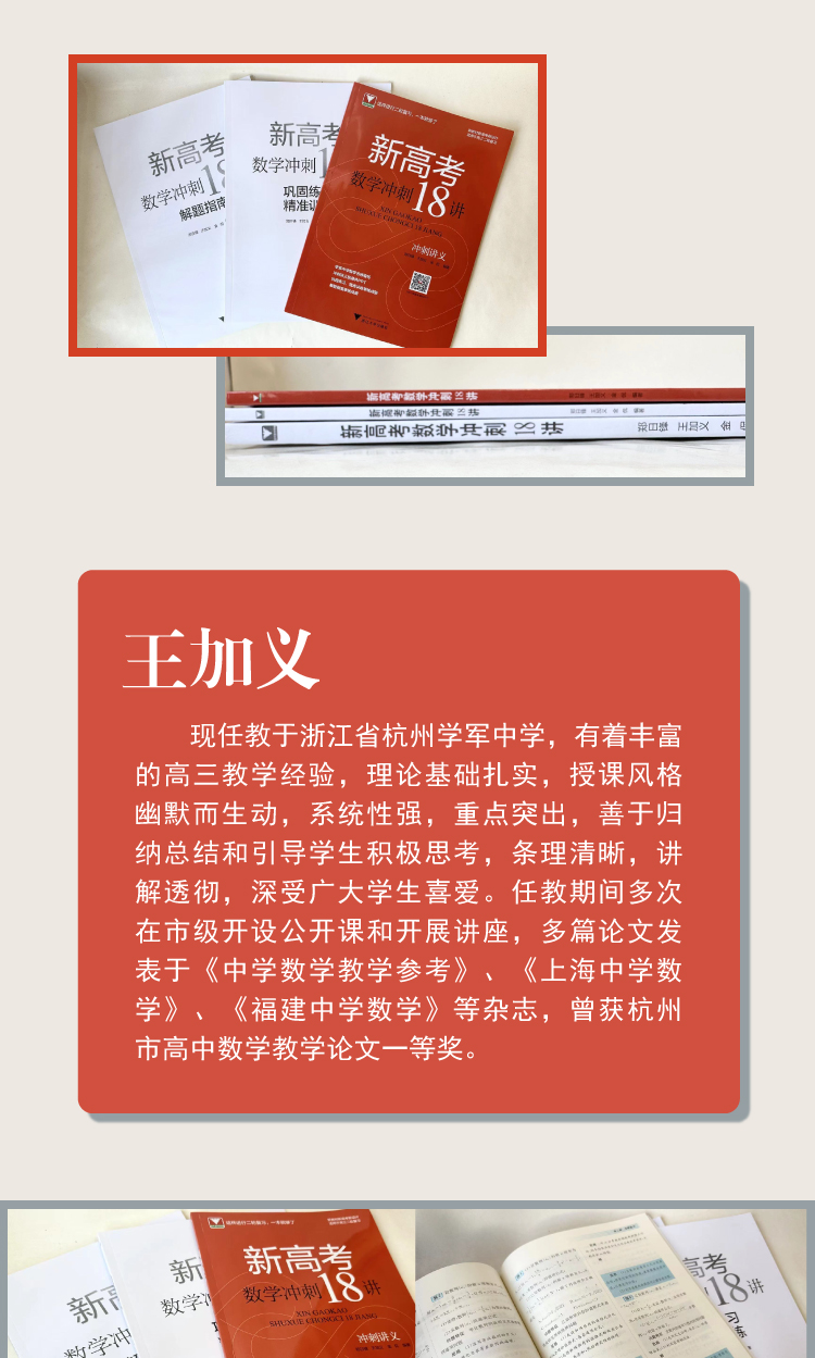 现任教于浙江省杭州学军中学,有着丰富的高三教学经验,理论基础扎实,授课风格幽默而生动,系统性强,重点突出,善于归纳总结和引导学生积极思考,条理清晰,讲解透彻,深受广大学生喜爱。任教期间多次在市级开设公开课和开展讲座,多篇论文发表于《中学数学教学参考》、《上海中学数学》、《福建中学数学》等杂志,曾获杭州市高中数学教学论文一等奖。