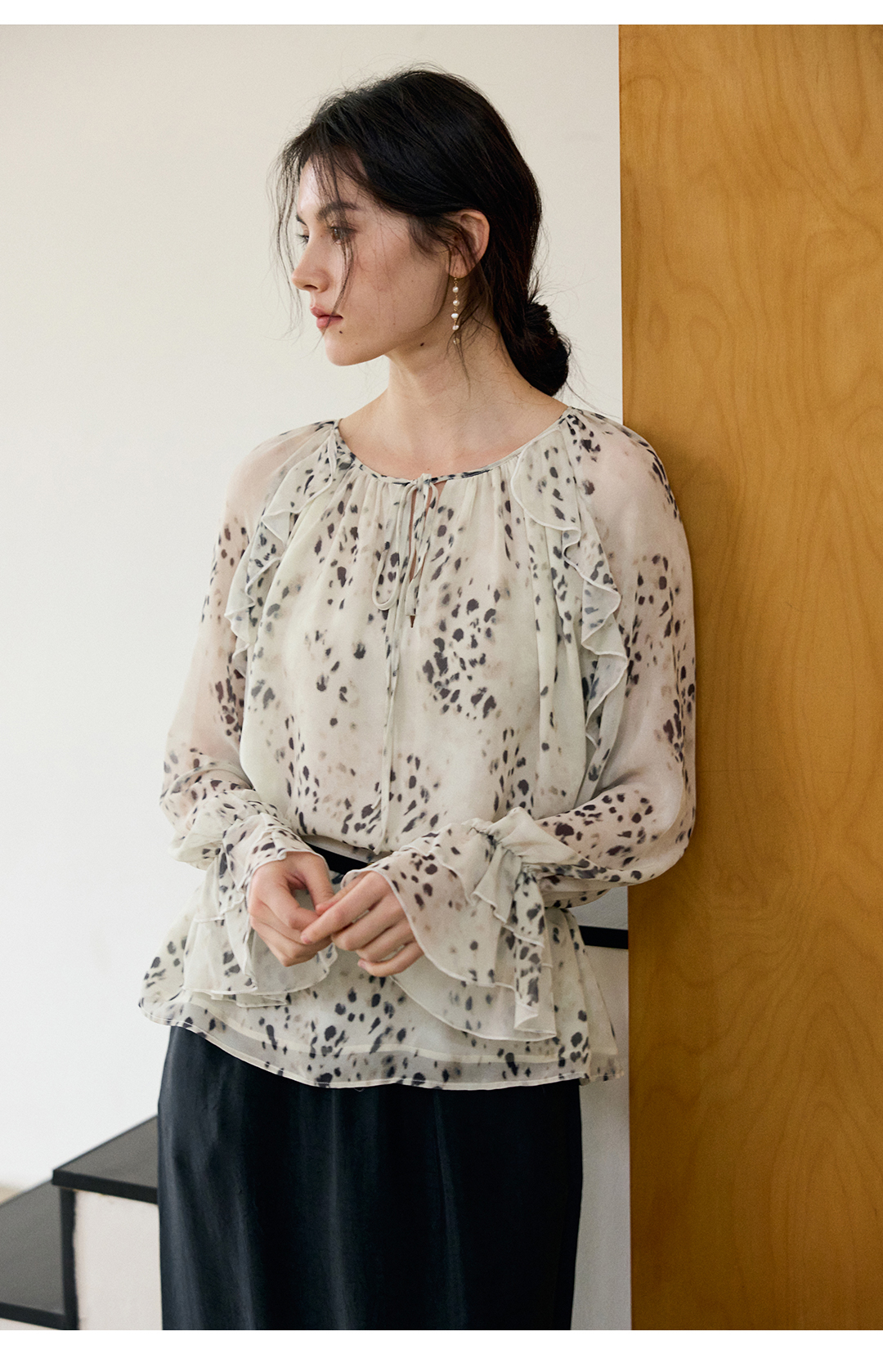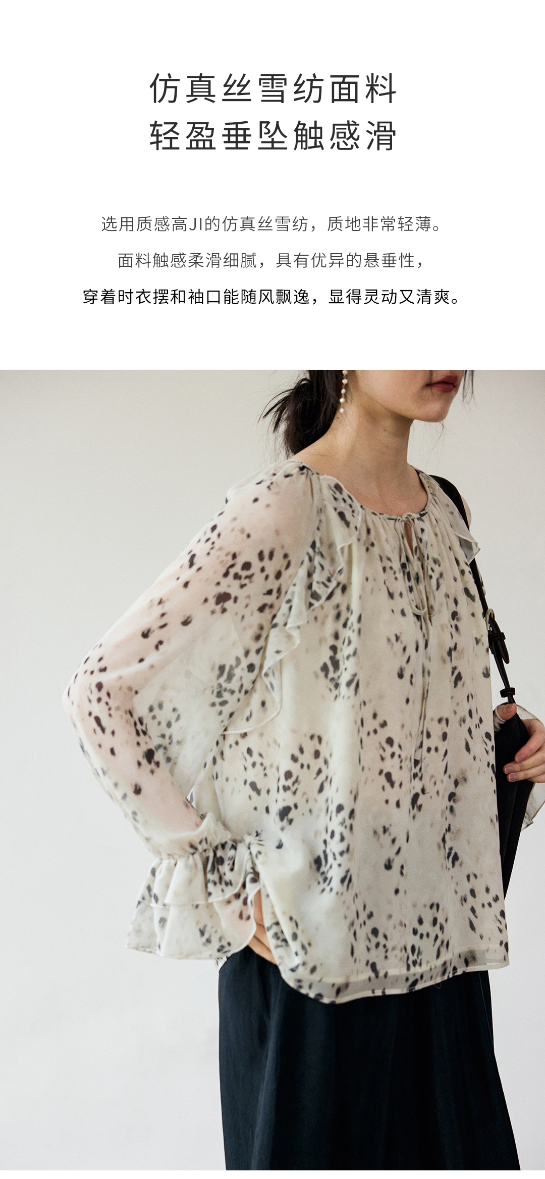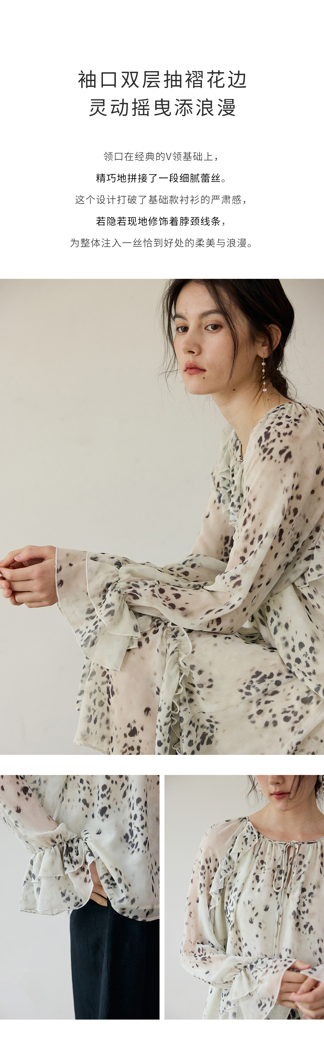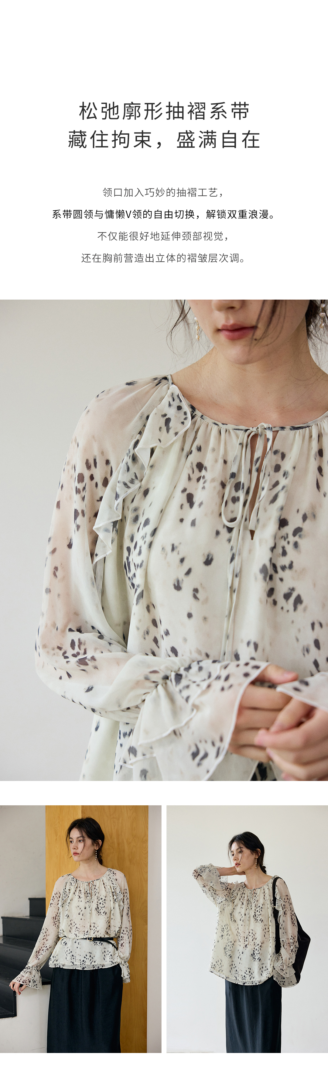 花边抽绳宽松印花衬衫