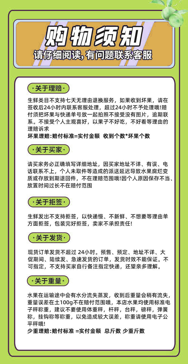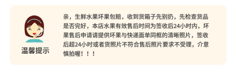 【温馨提示】坏果包赔,生鲜食品类不支持7天无理由退换货;不支持拦截、拒收等;如产品有质量问题,请在签收24小时内将产品+快递单拍照反馈客服处理。