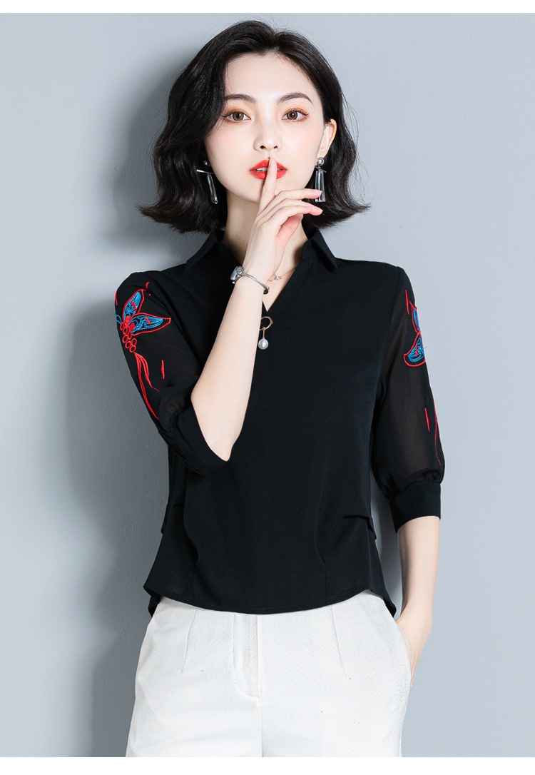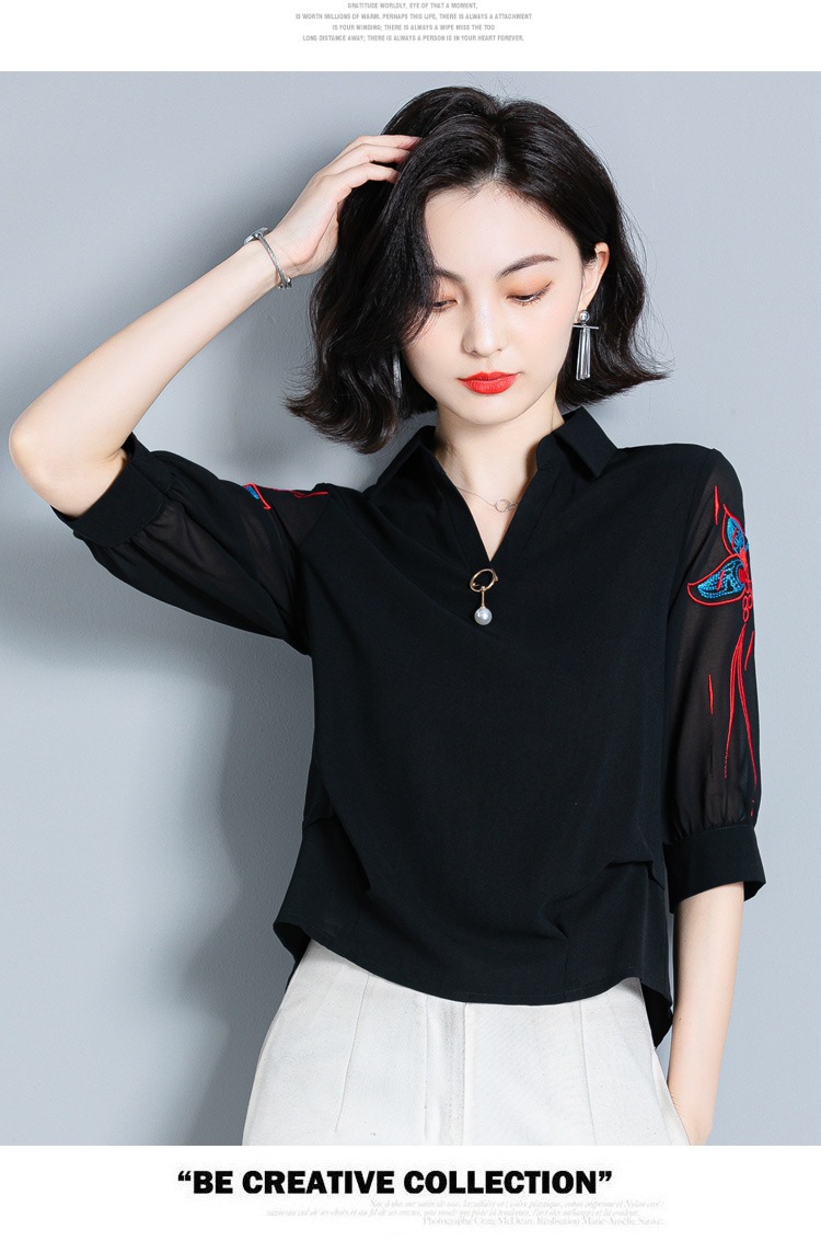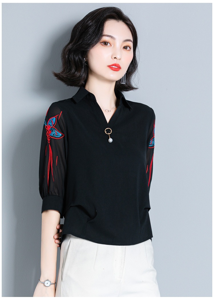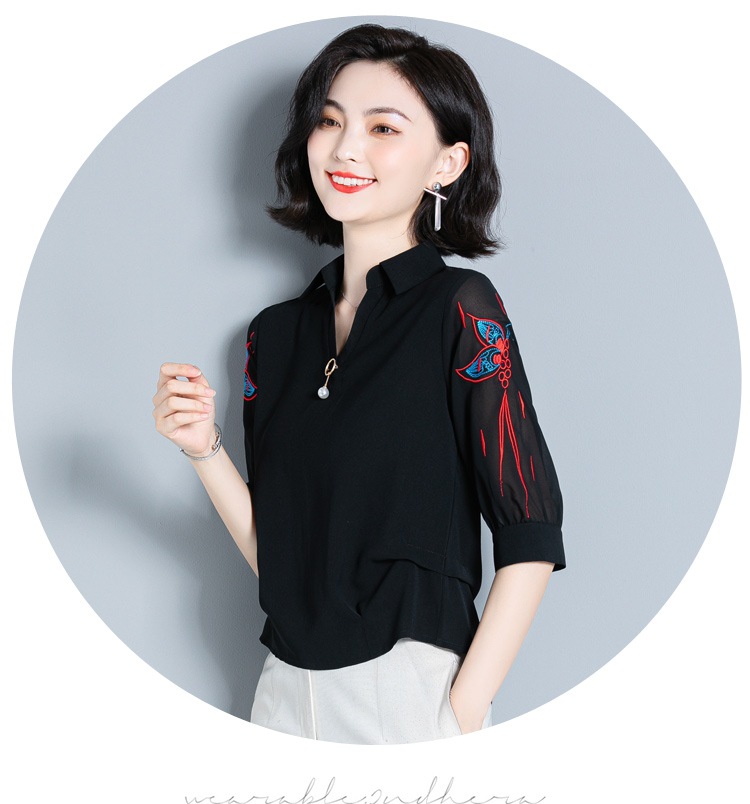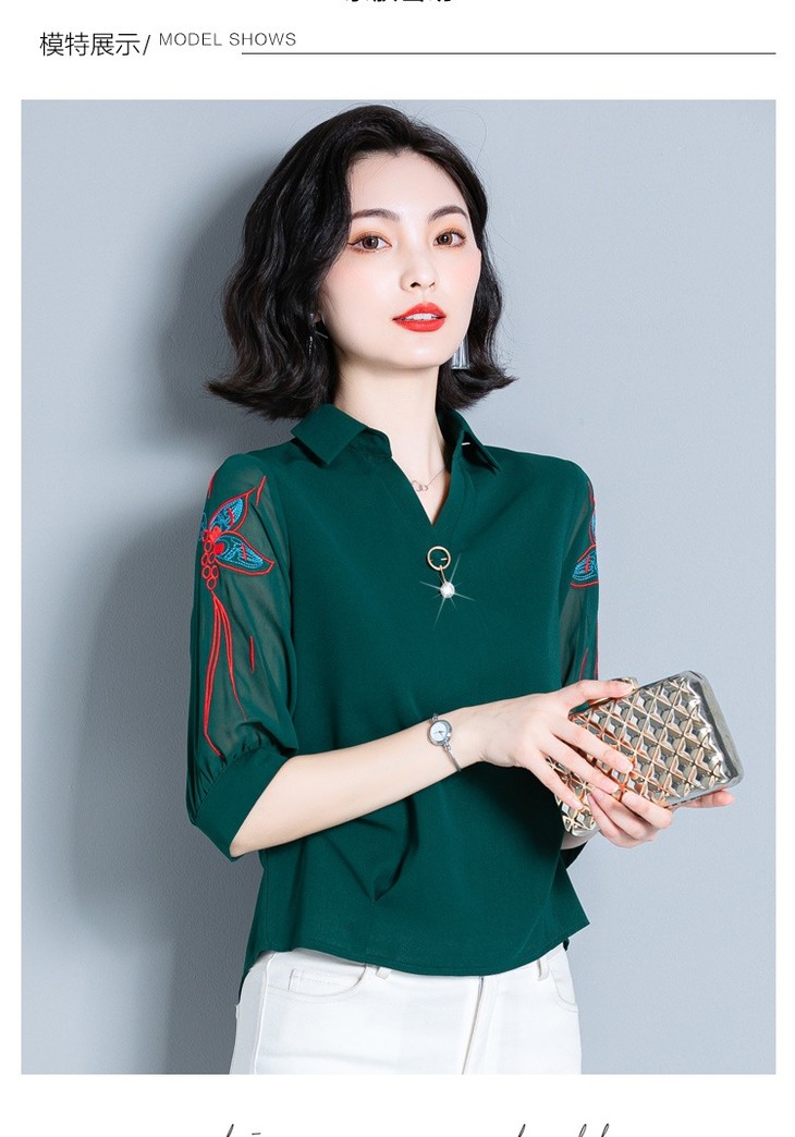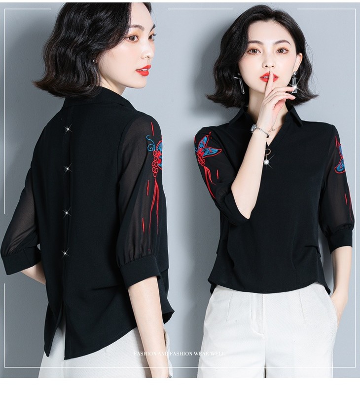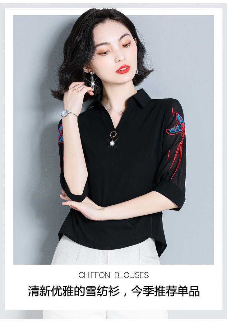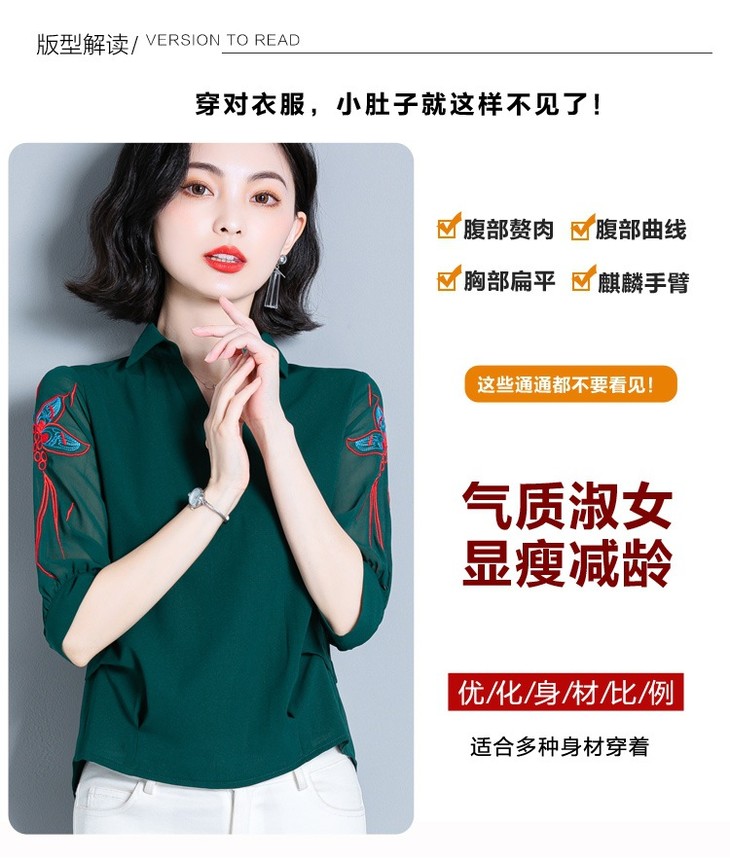 HT8631新款时尚气质宽松绣花七分袖百搭雪纺衫