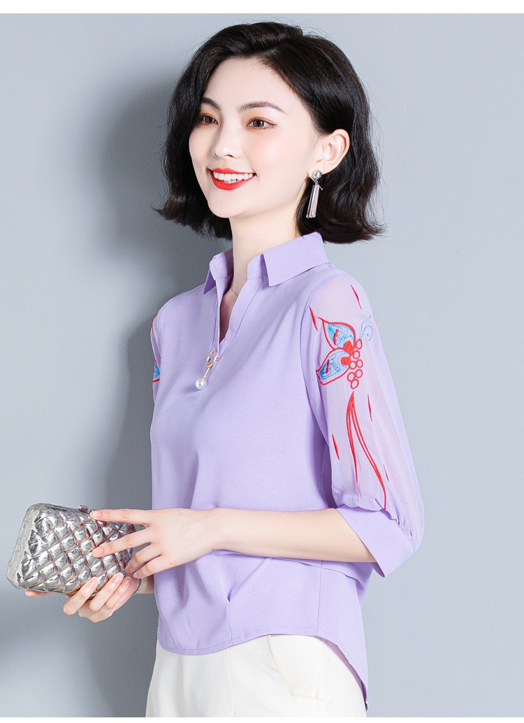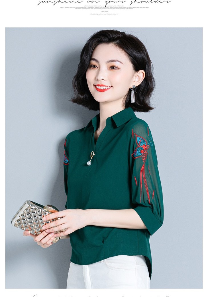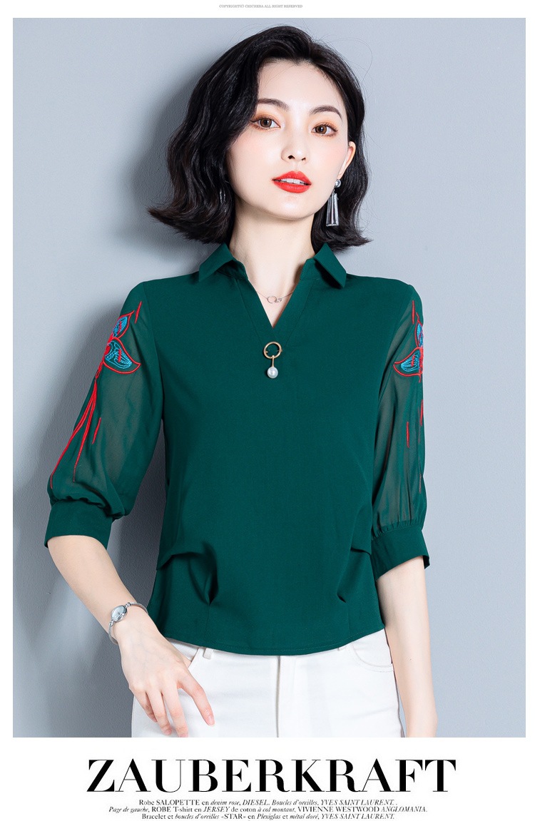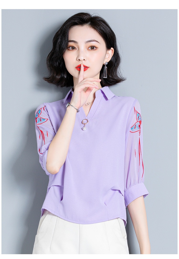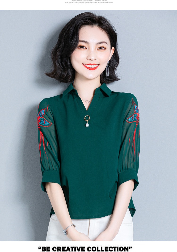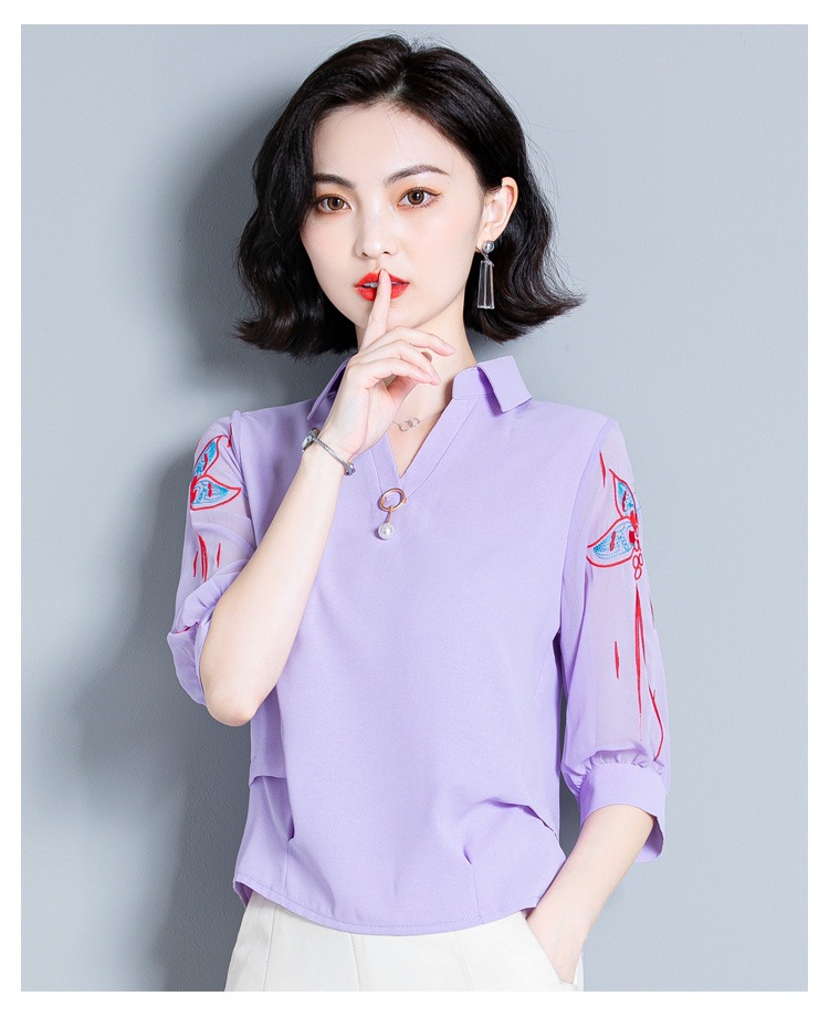 HT8631新款时尚气质宽松绣花七分袖百搭雪纺衫
