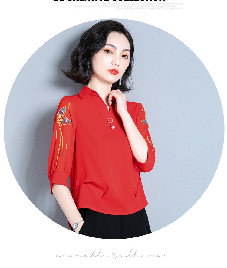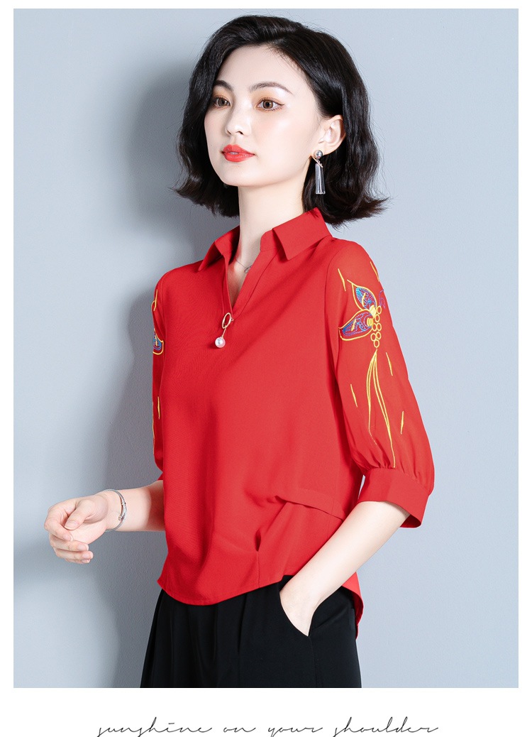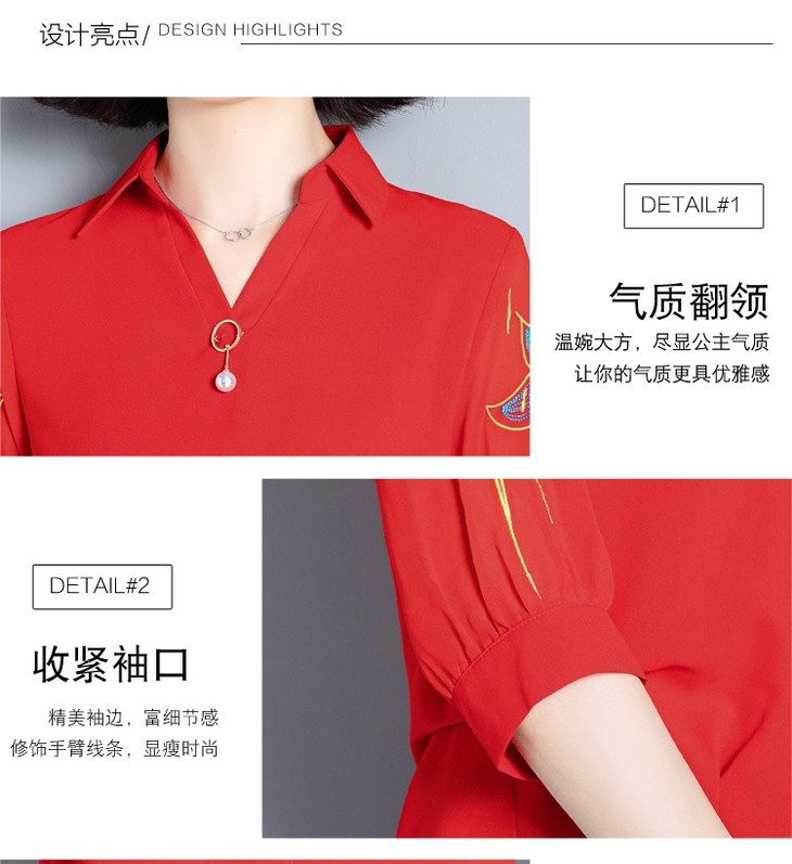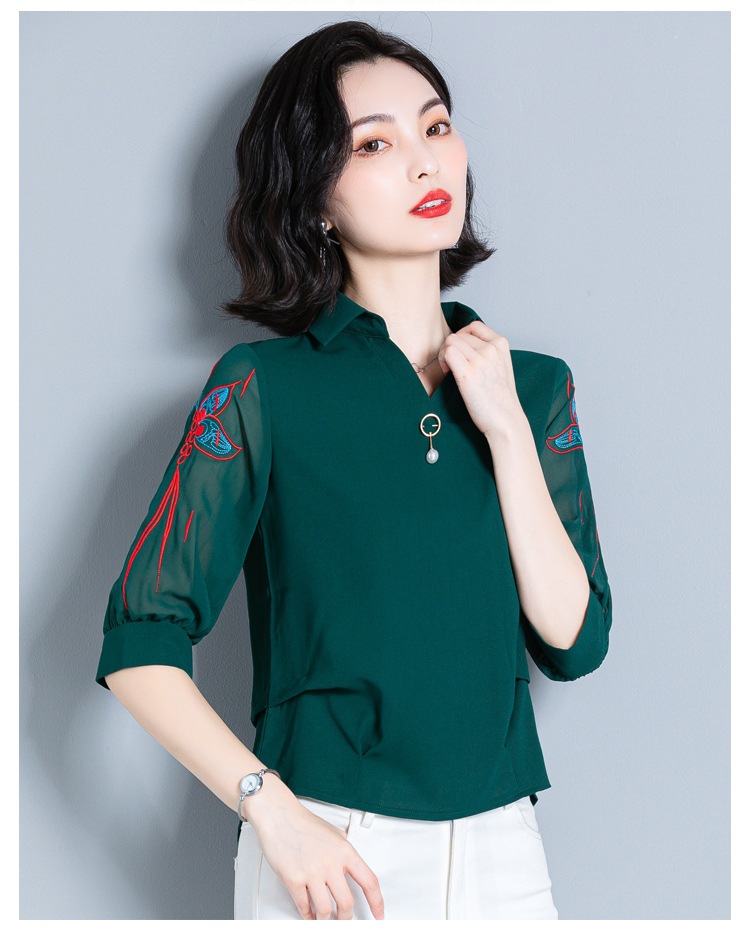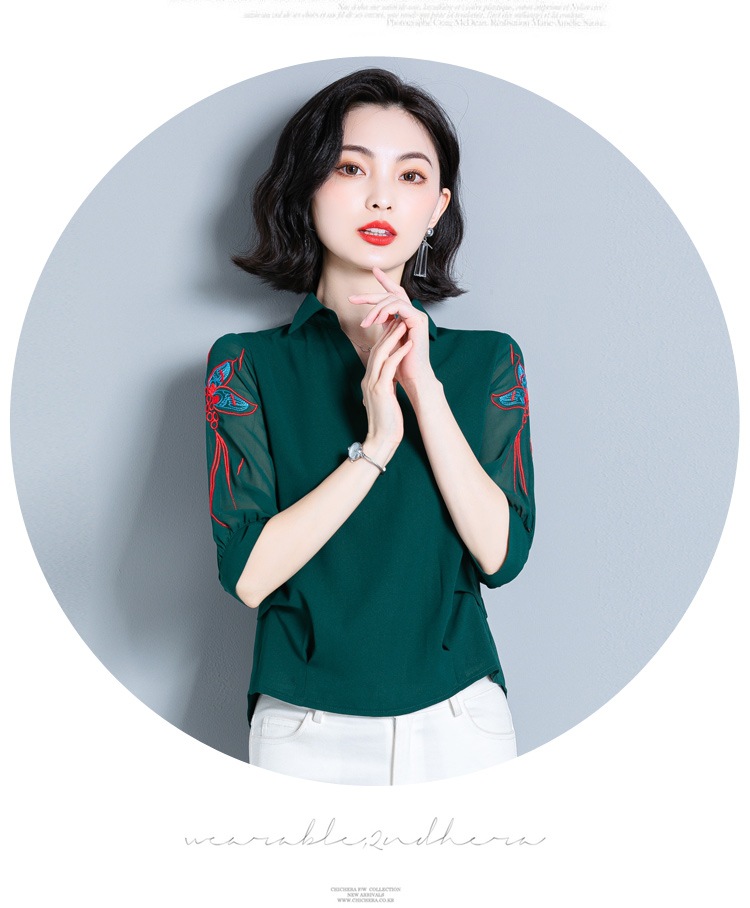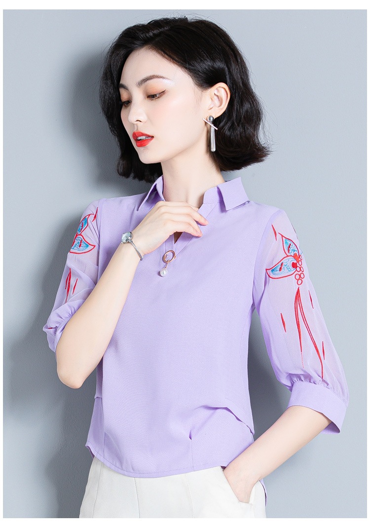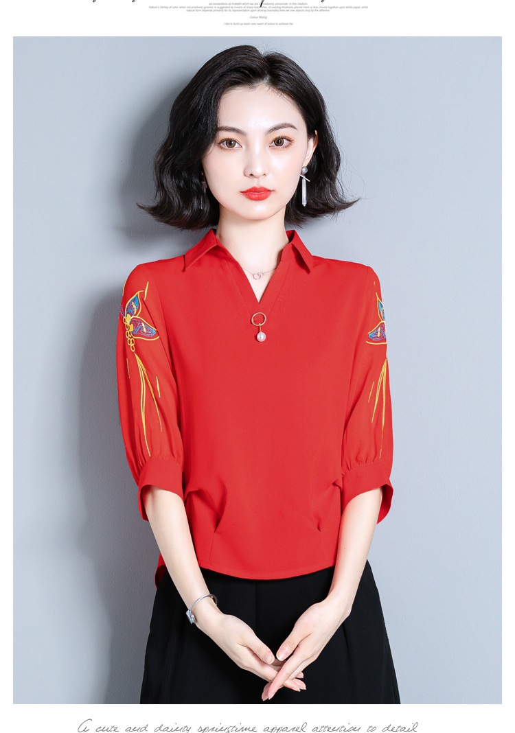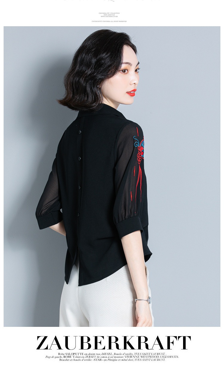 HT8631新款时尚气质宽松绣花七分袖百搭雪纺衫