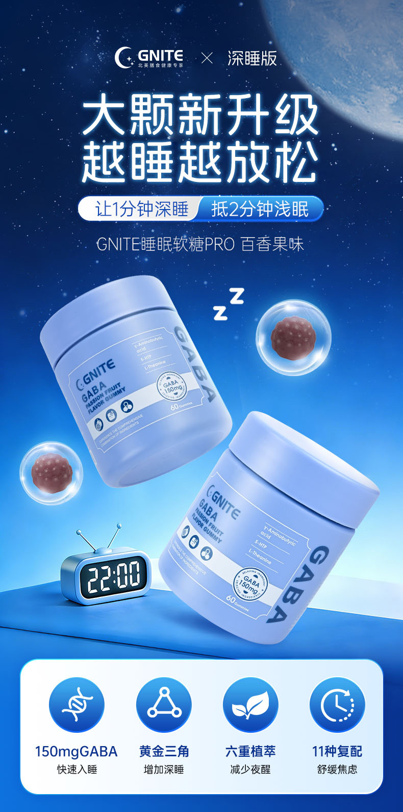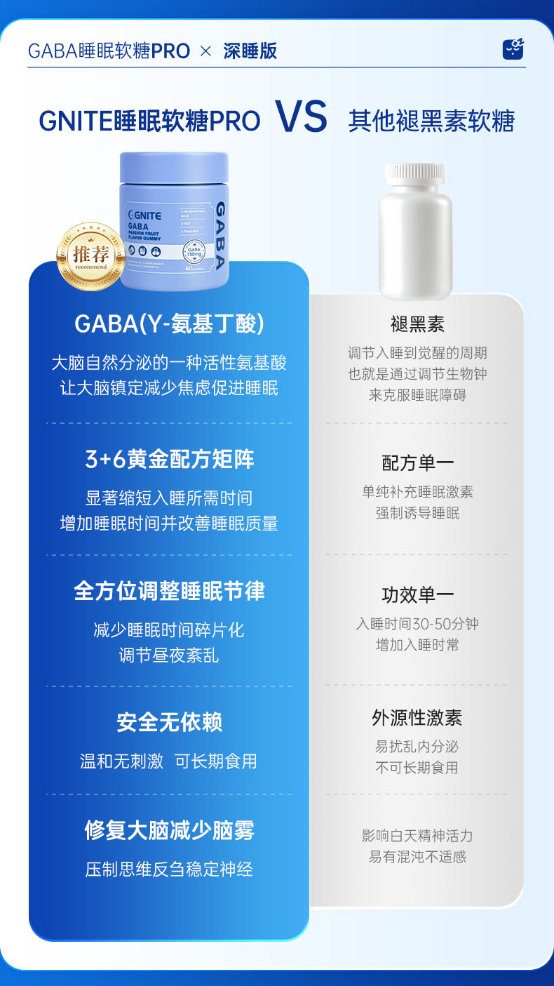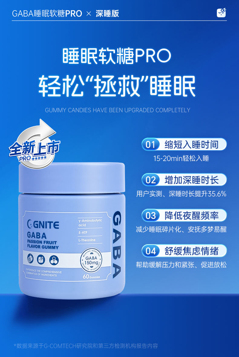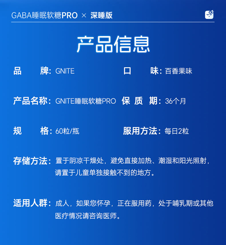 【保税仓】美国GNITE GABA睡眠软糖pro 百香果味 60粒/瓶 深睡版 150mg GABA/粒