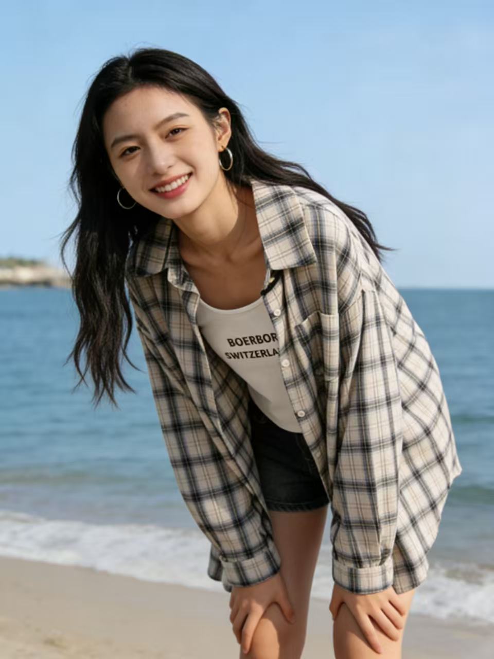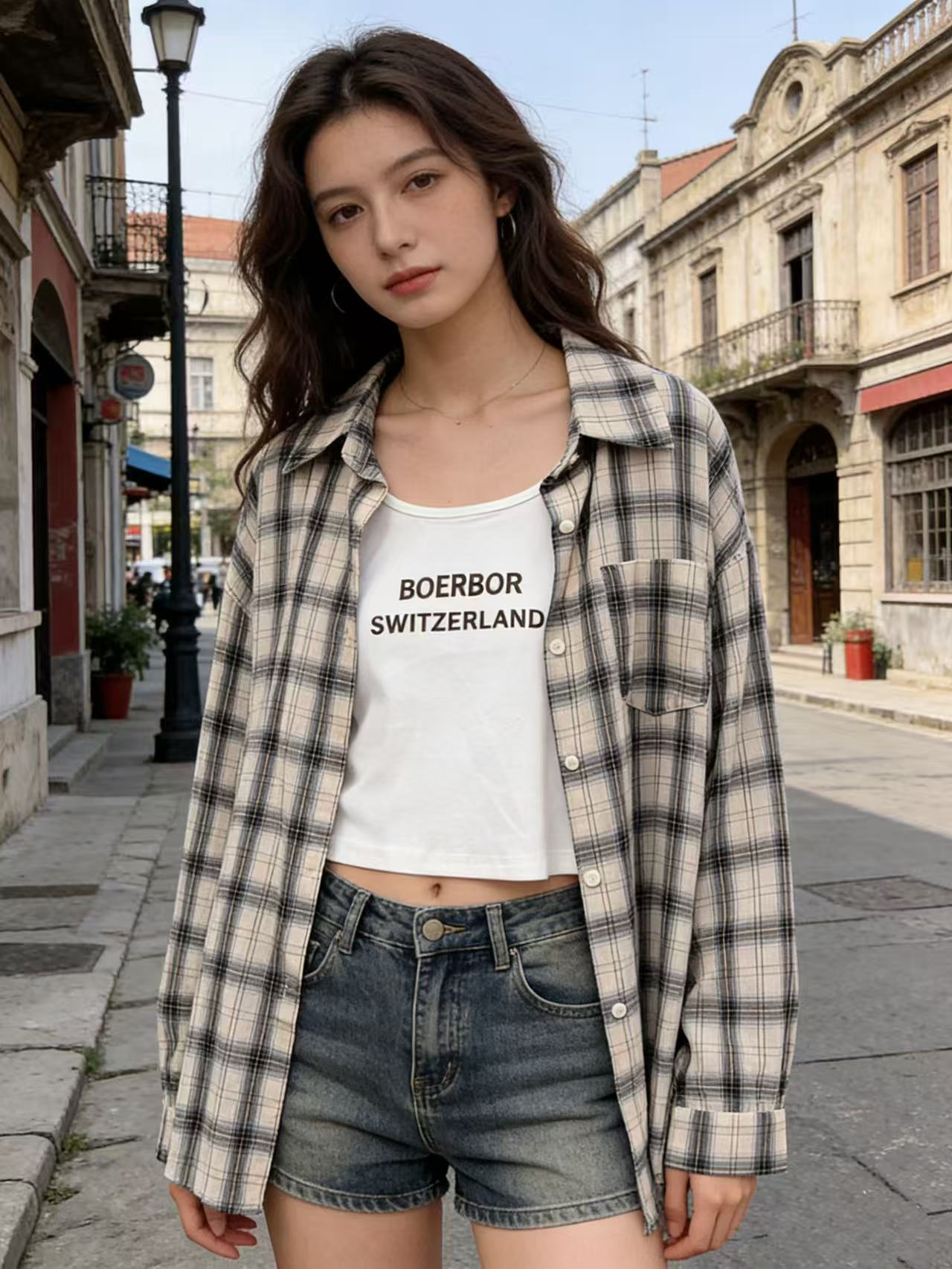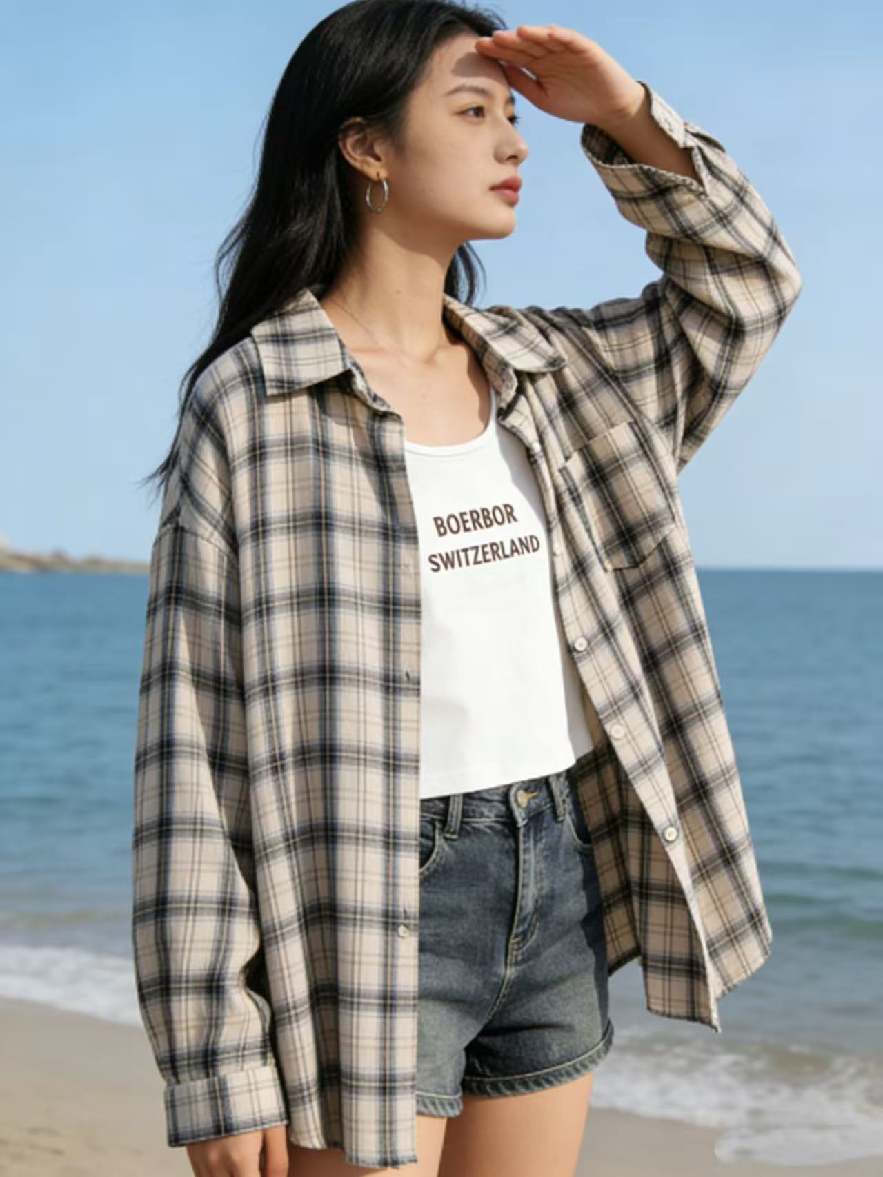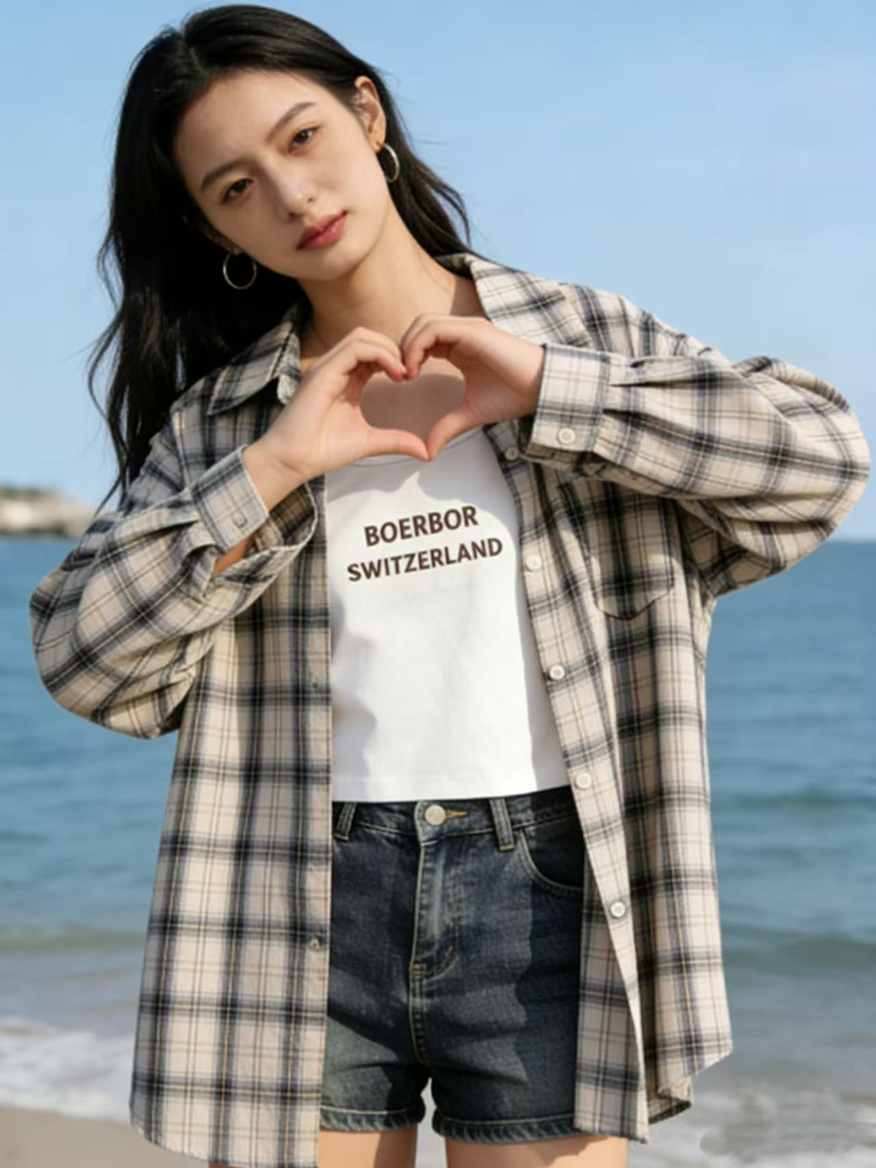 418良粉节|2026 活动爆款 品牌促【自营】衣周期 (两件套)9127春夏薄款~100%棉浅蓝灰格子衬衫➕背心套装上衣-喜出