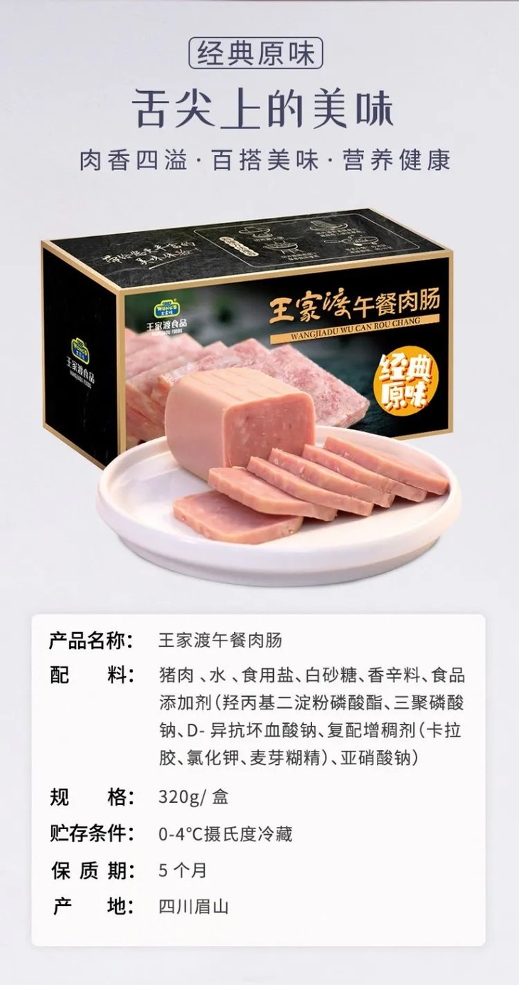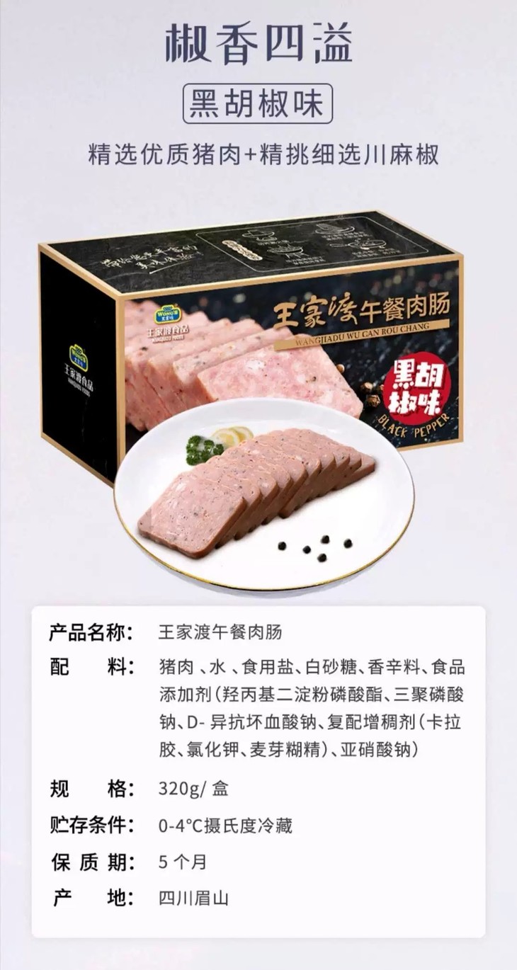 【送新鲜】320g王家渡午餐肉肠(黑胡椒味/原味) 肉香四溢 百搭美味 营养健康