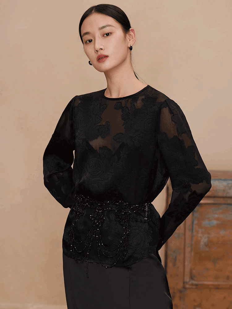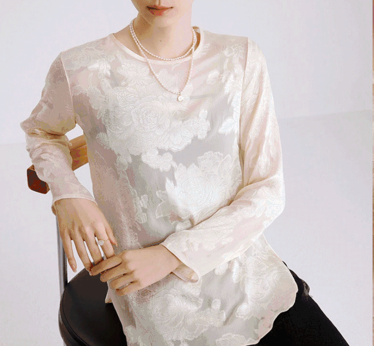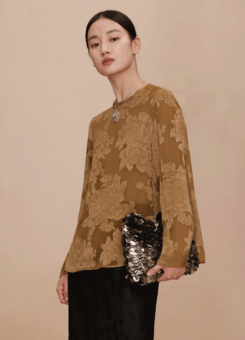 掌柜想用一件【LONGNVFAIR新中式牡丹烧花圆领衬衣】来讲讲。