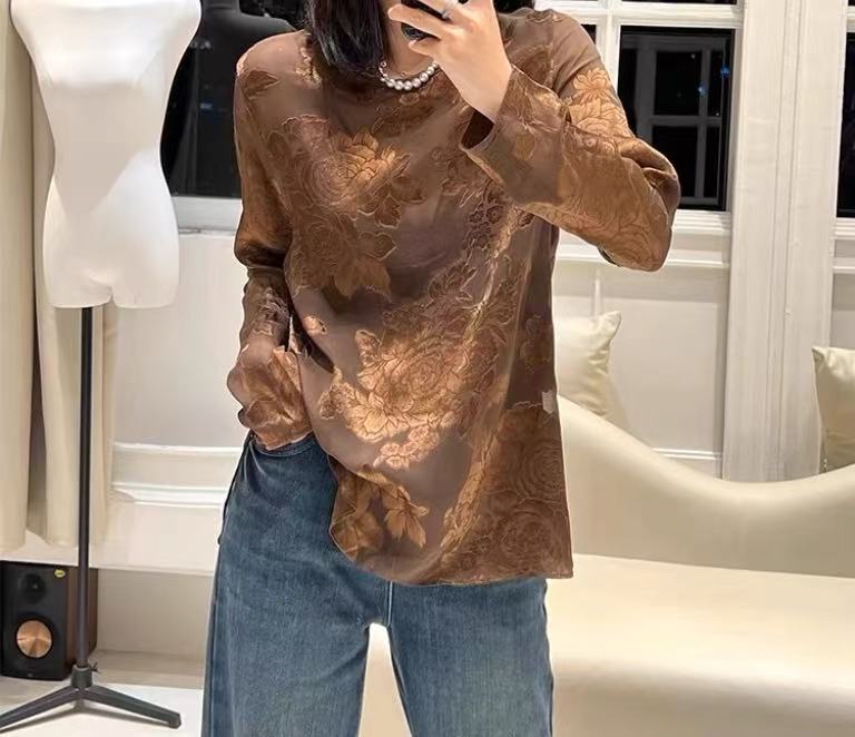 LONGNVFAIR新中式牡丹烧花圆领衬衣,牡丹花的东方元素,烧花工艺,优雅提升气质【72小时发货】