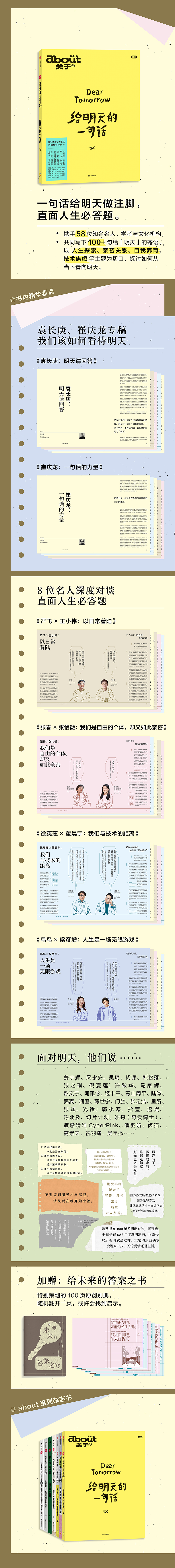 一句话给「明天」做注脚,直面人生答题。「about关于」第7本杂志书《给明天的一句话》,携手袁长庚、崔庆龙、严飞、王小伟、张春、张怡微、徐英瑾、鸟鸟等打造一系列深度文章、对谈及专访,从自我养育、亲密关系、技术焦虑、人生探索等议题切入,用语言帮助大家找到心中的答案。此外更有许鞍华、马家辉、梁永安、吴琦、倪夏莲、张之琪、闫佩伦、卤猫、吴呈杰等近百位名人、学者、文化工作者一起畅谈给明天的一句话,传递面对未来的勇气。