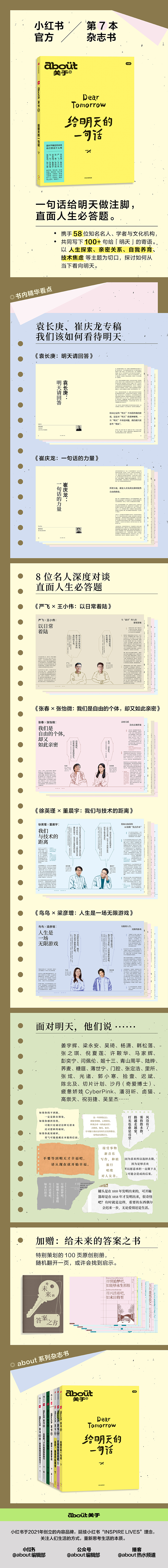 “about 关于”系列MOOK是一套由小红书官方出品的MOOK杂志书,旨在延续“Inspire Lives”的理念,关注并记录人们的生活方式以及对生活本质的深刻思考。截至目前,“about 关于”系列已出版了6册,每本书围绕一个特定的主题展开,通过细致的访谈、丰富的图文内容以及实用的指南,引领读者探索不同领域的精彩与深度。本书是生活类读物“about关于”系列第7册,一句话给「明天」做注脚,直面人生答题。