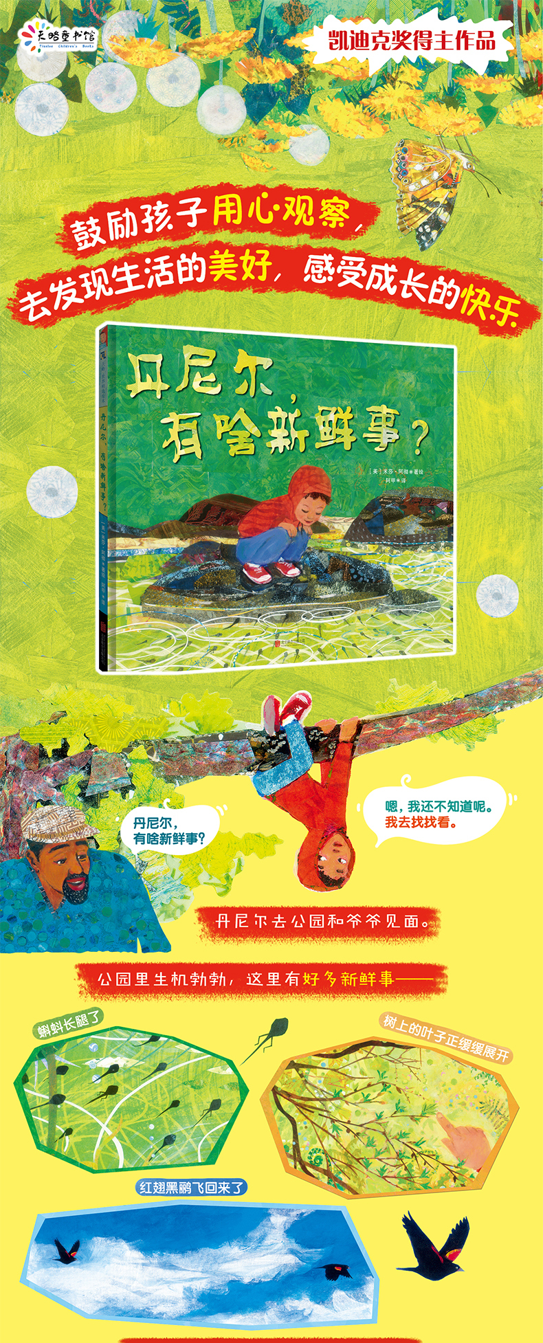 公园里生机勃勃,处处都有新鲜事 —— 红翅黑鹂飞回来了,小鸭子孵出来了,蝌蚪长出了腿,香蒲让种子随风播撒,树上的叶子正缓缓展开…… 丹尼尔呢?他有啥新鲜事?