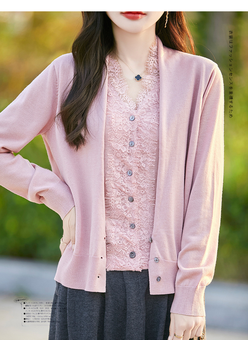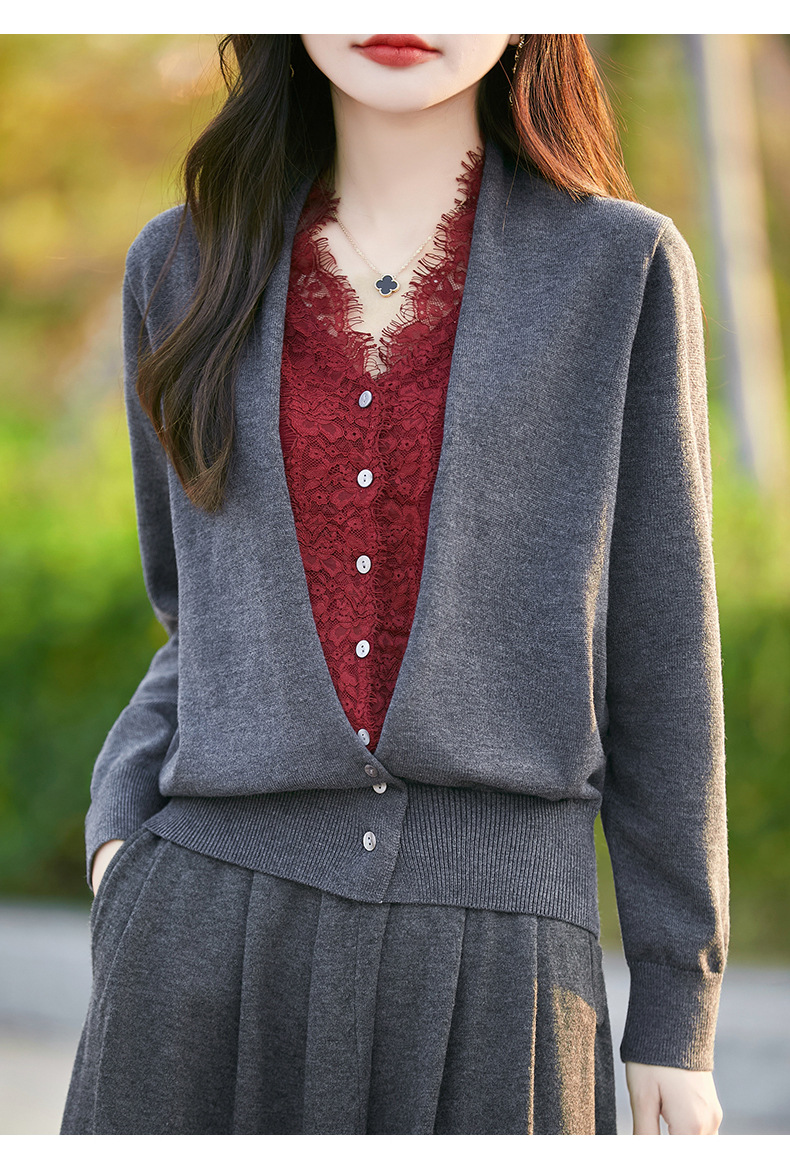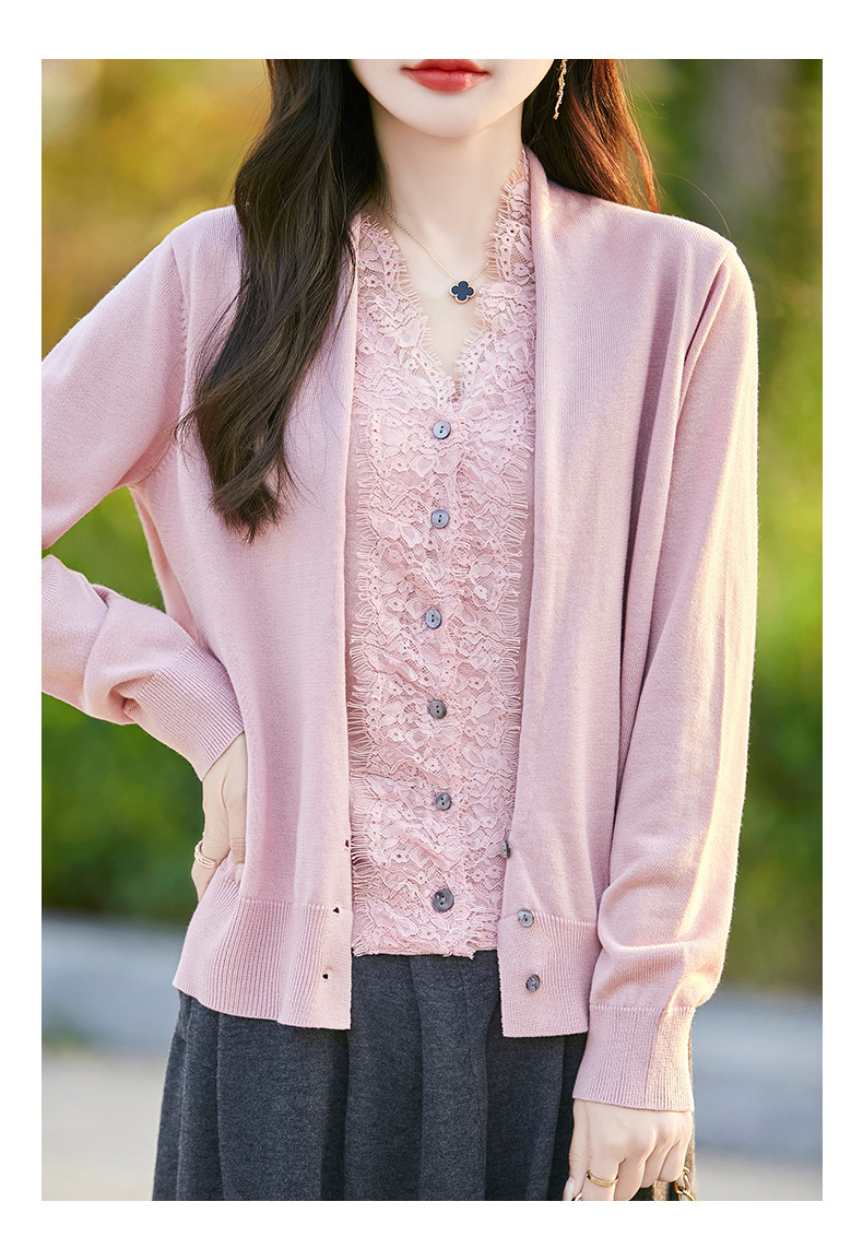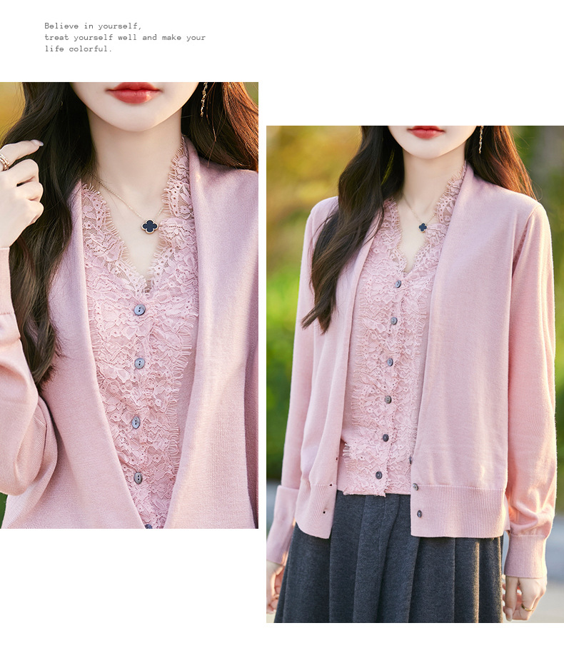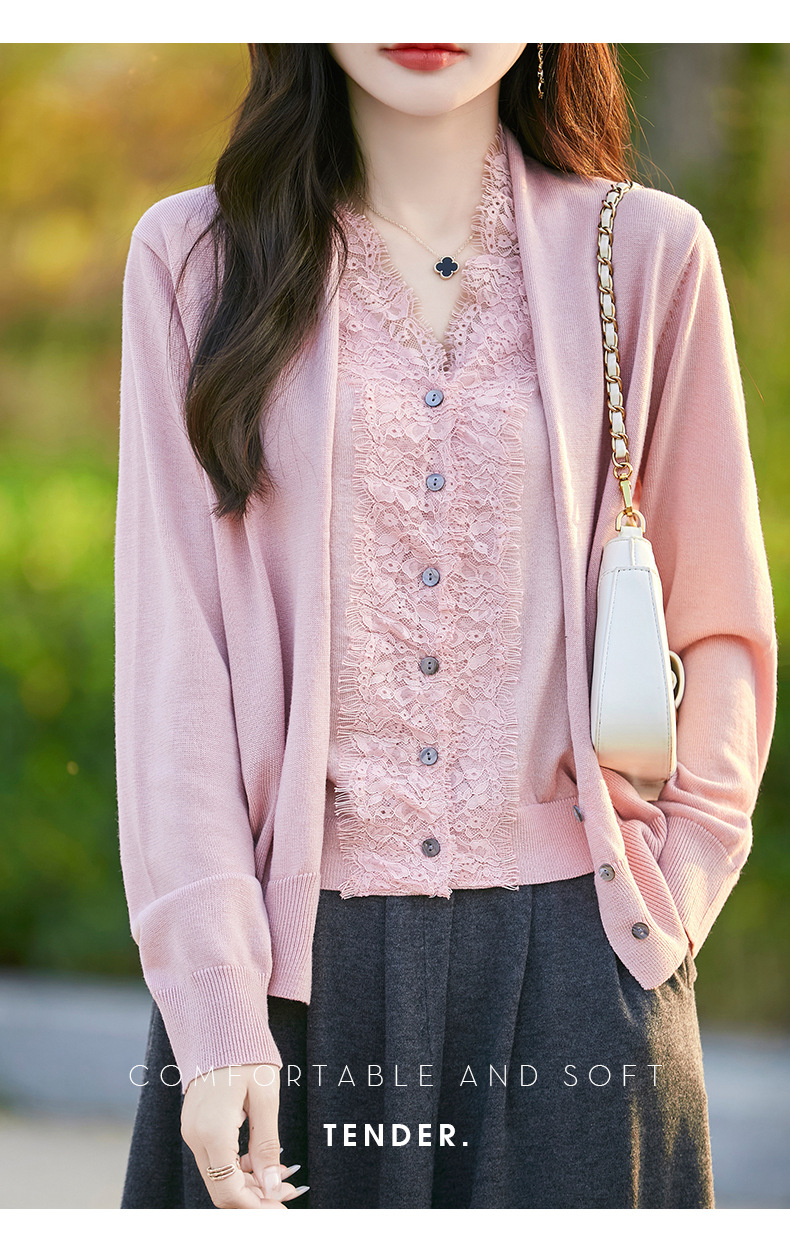 雀说蕾丝拼接假两件针织开衫女新款精纺羊毛长袖保暖打底毛衣上衣 ALWNS-3370-60