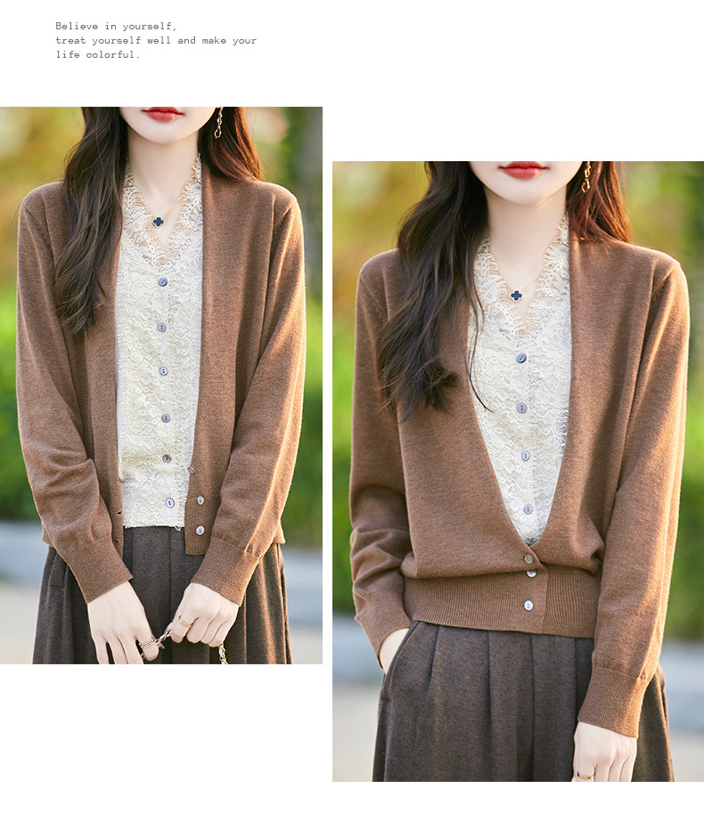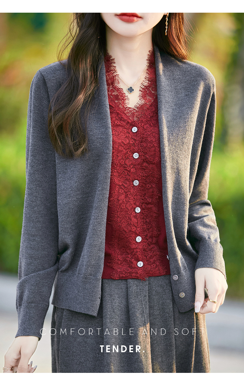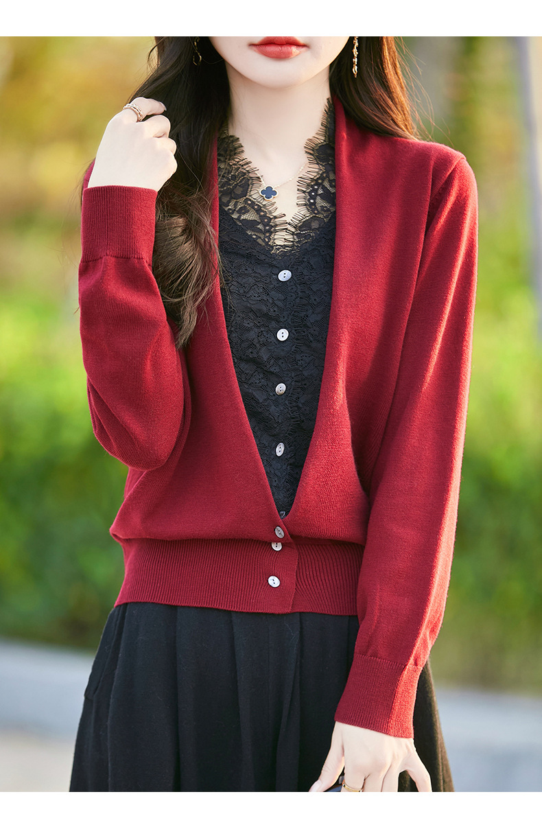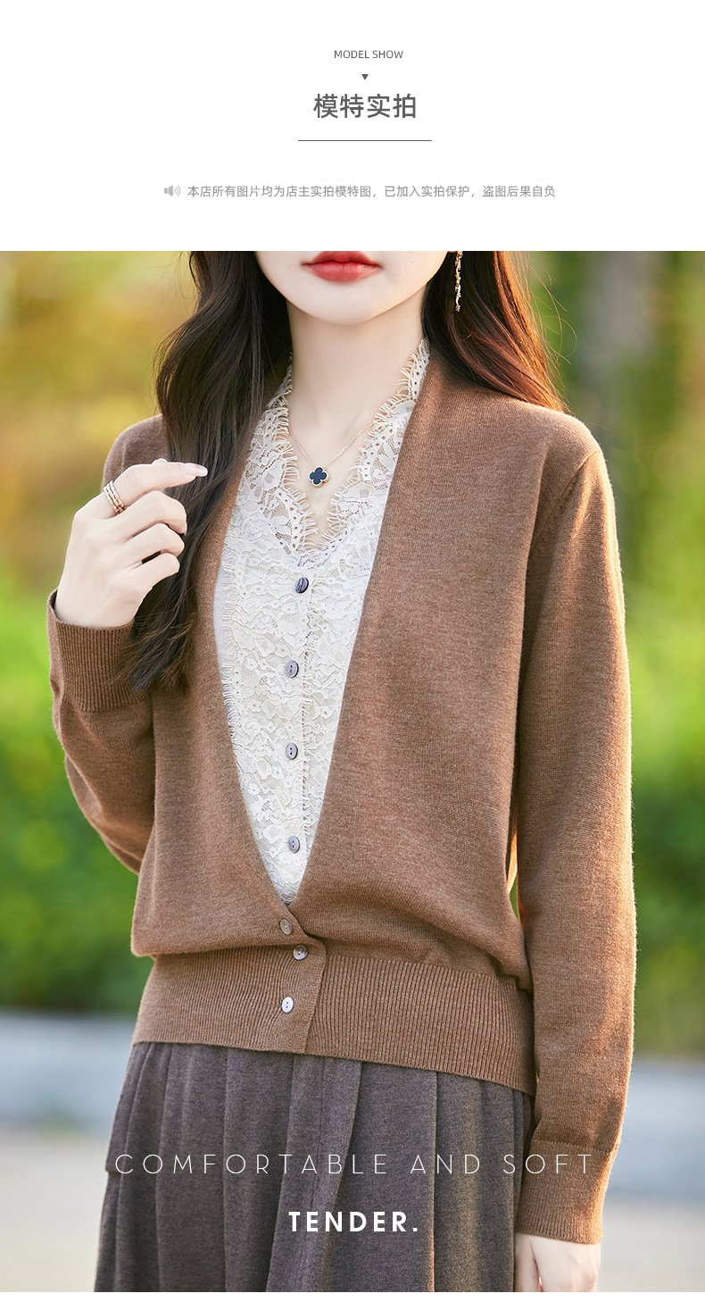 雀说蕾丝拼接假两件针织开衫女新款精纺羊毛长袖保暖打底毛衣上衣 ALWNS-3370-60