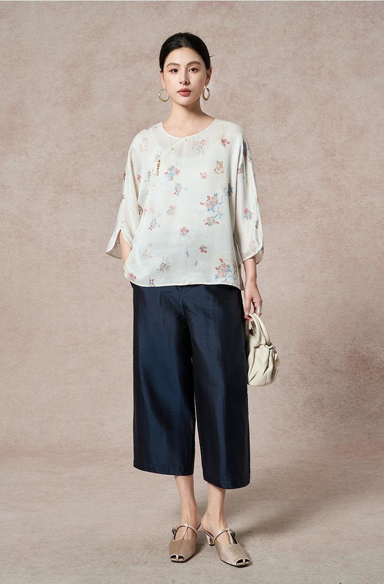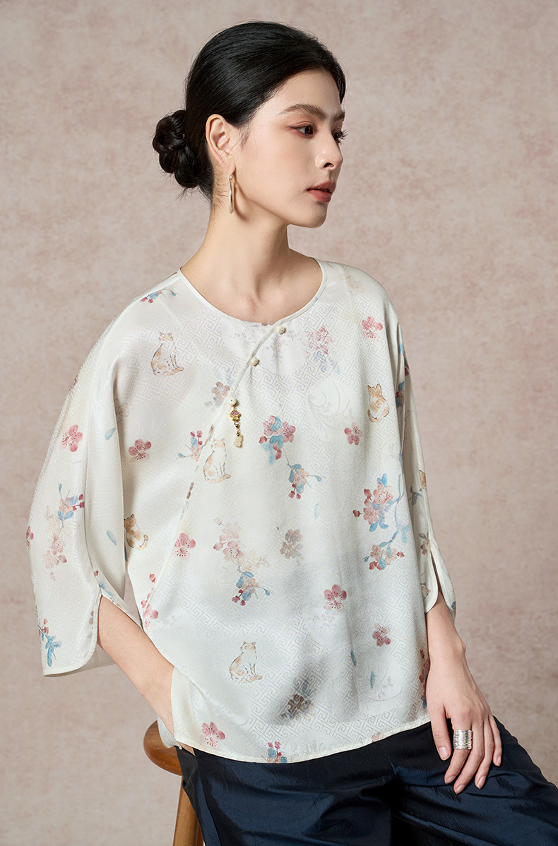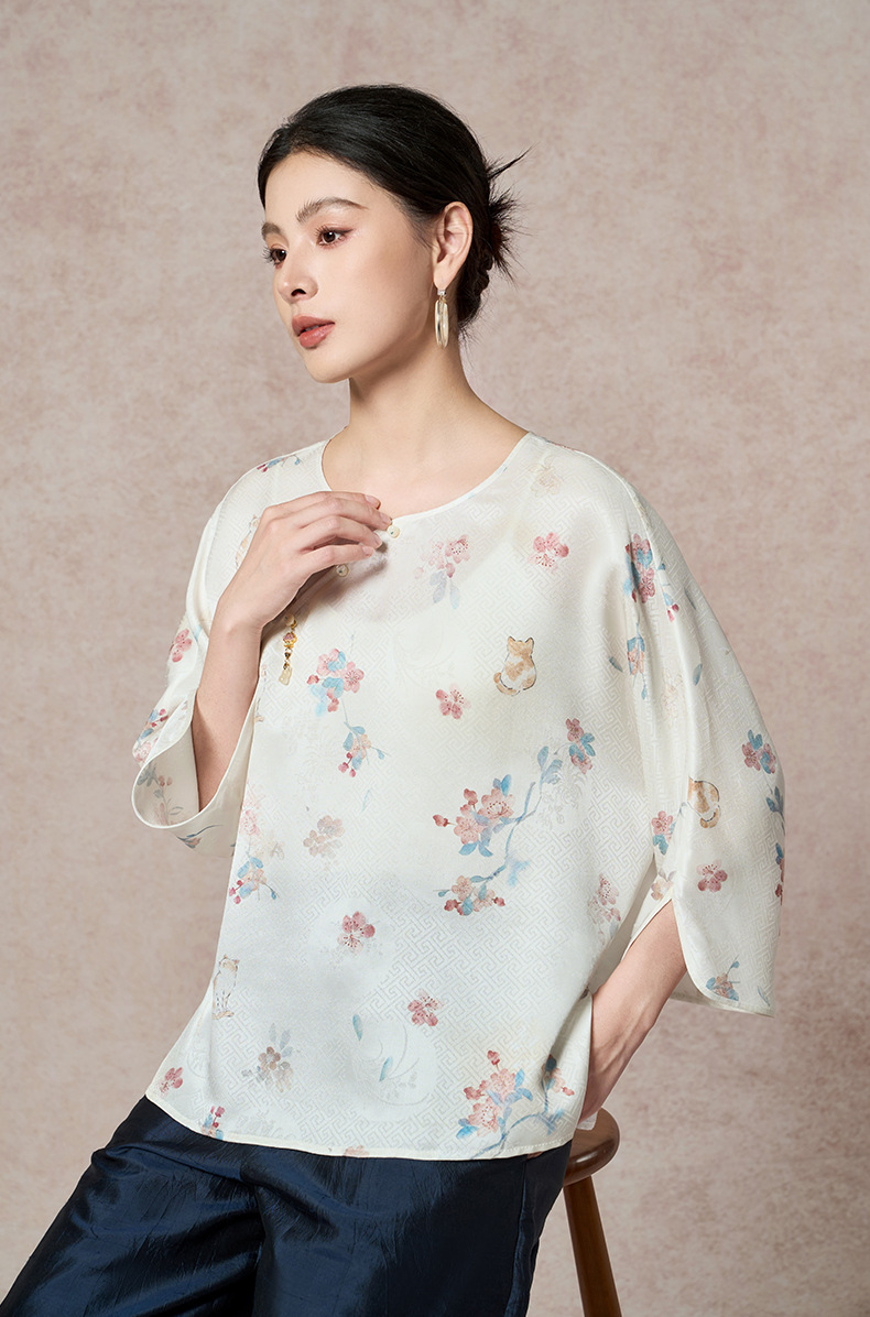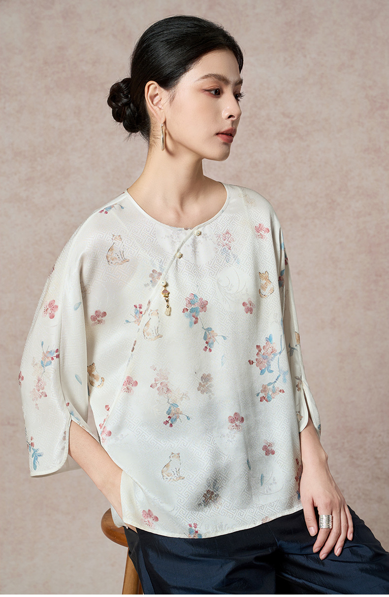 QS100%桑蚕丝26春新中式圆领国风印花上衣女装显瘦衬衫2191