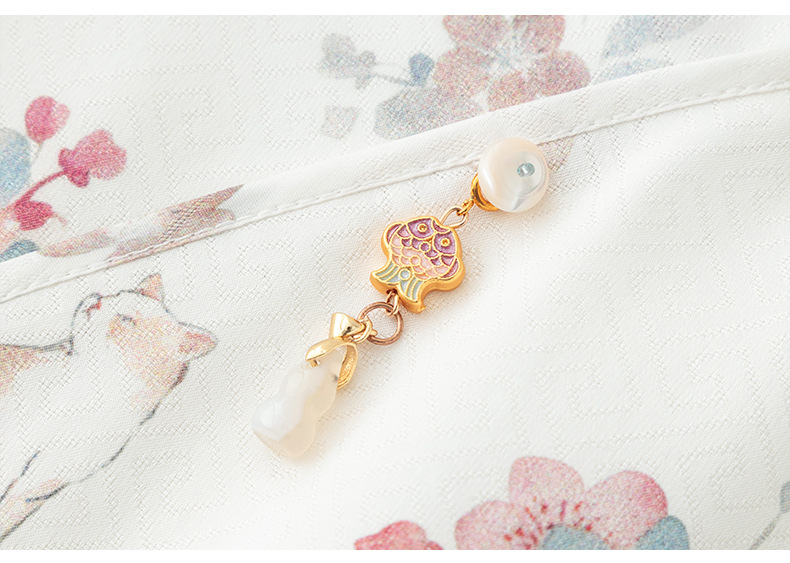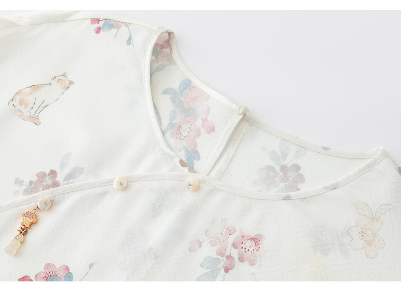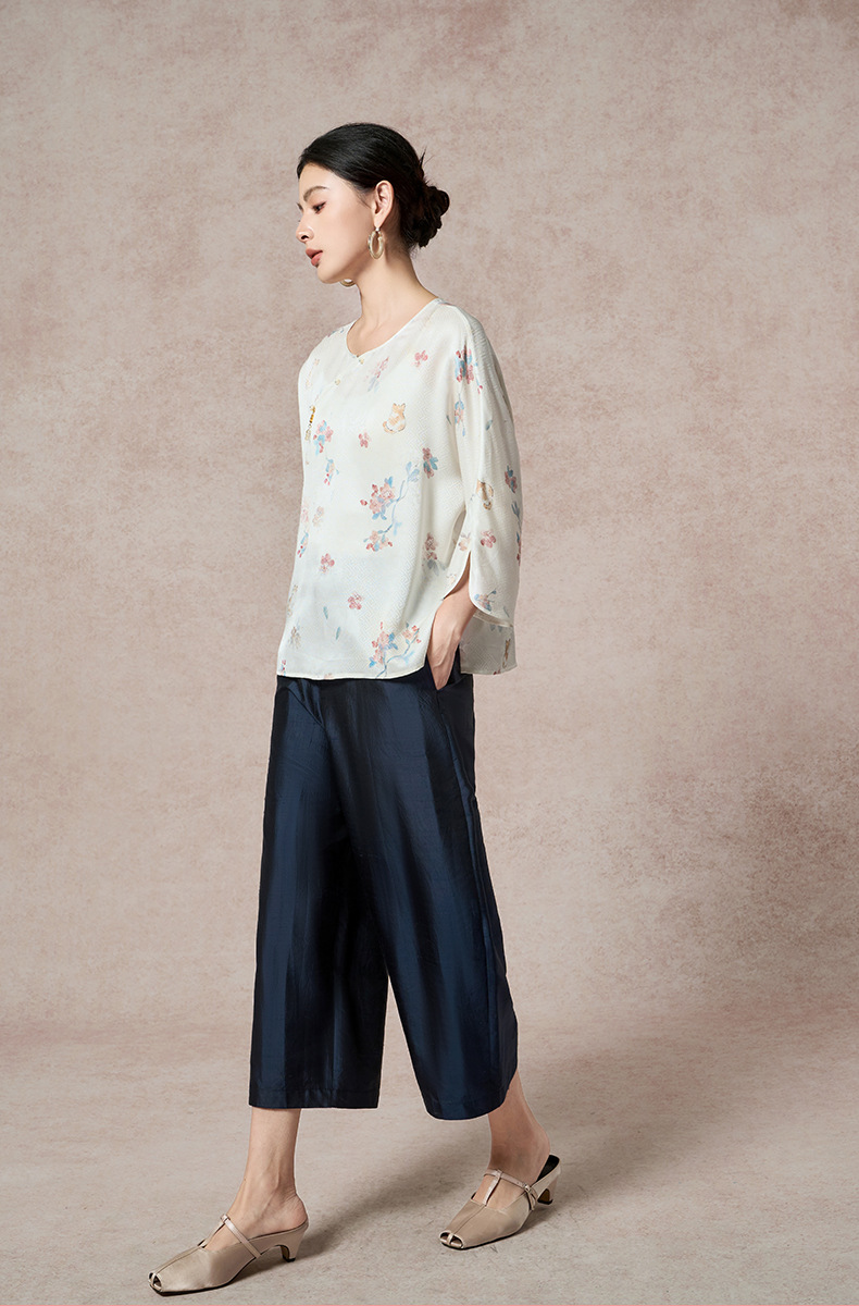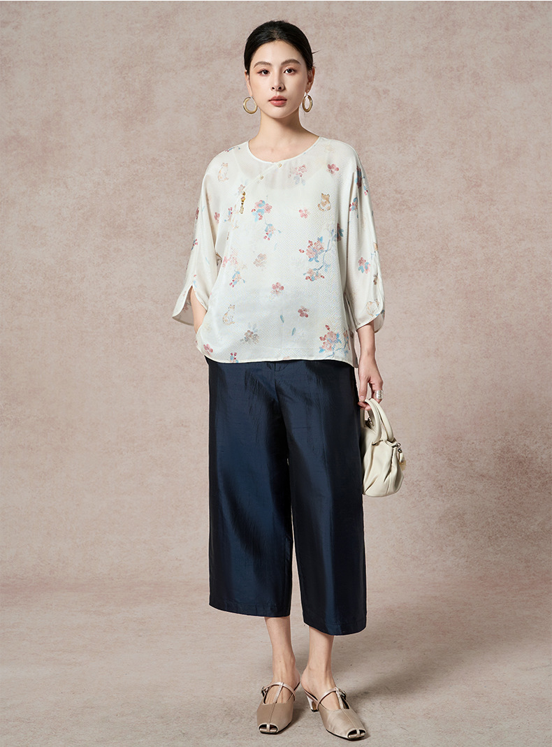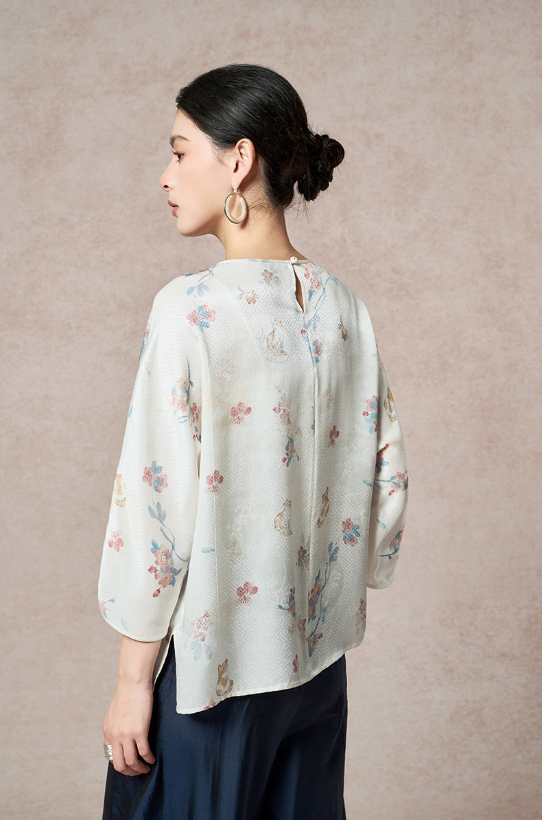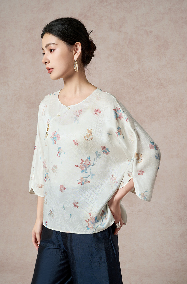 QS100%桑蚕丝26春新中式圆领国风印花上衣女装显瘦衬衫2191