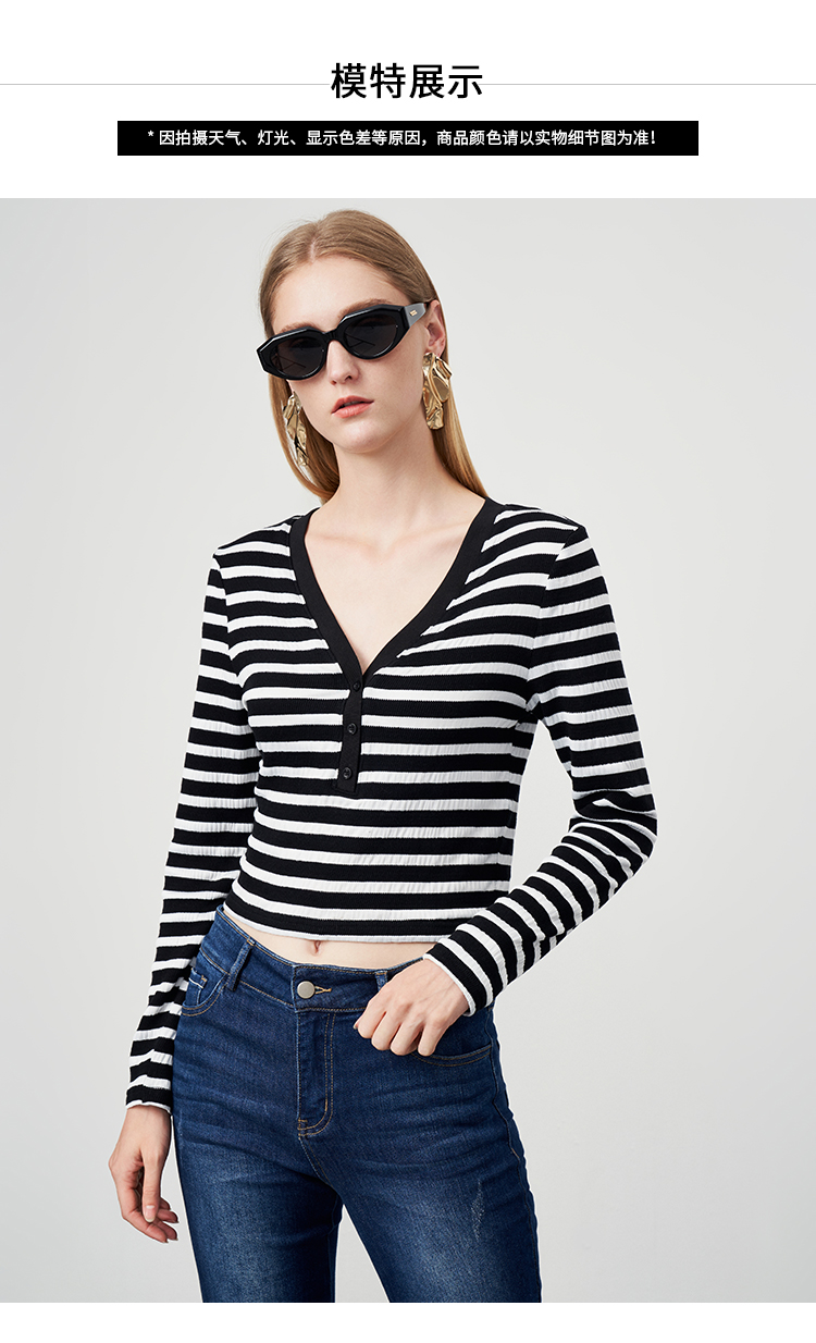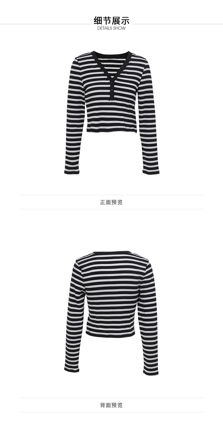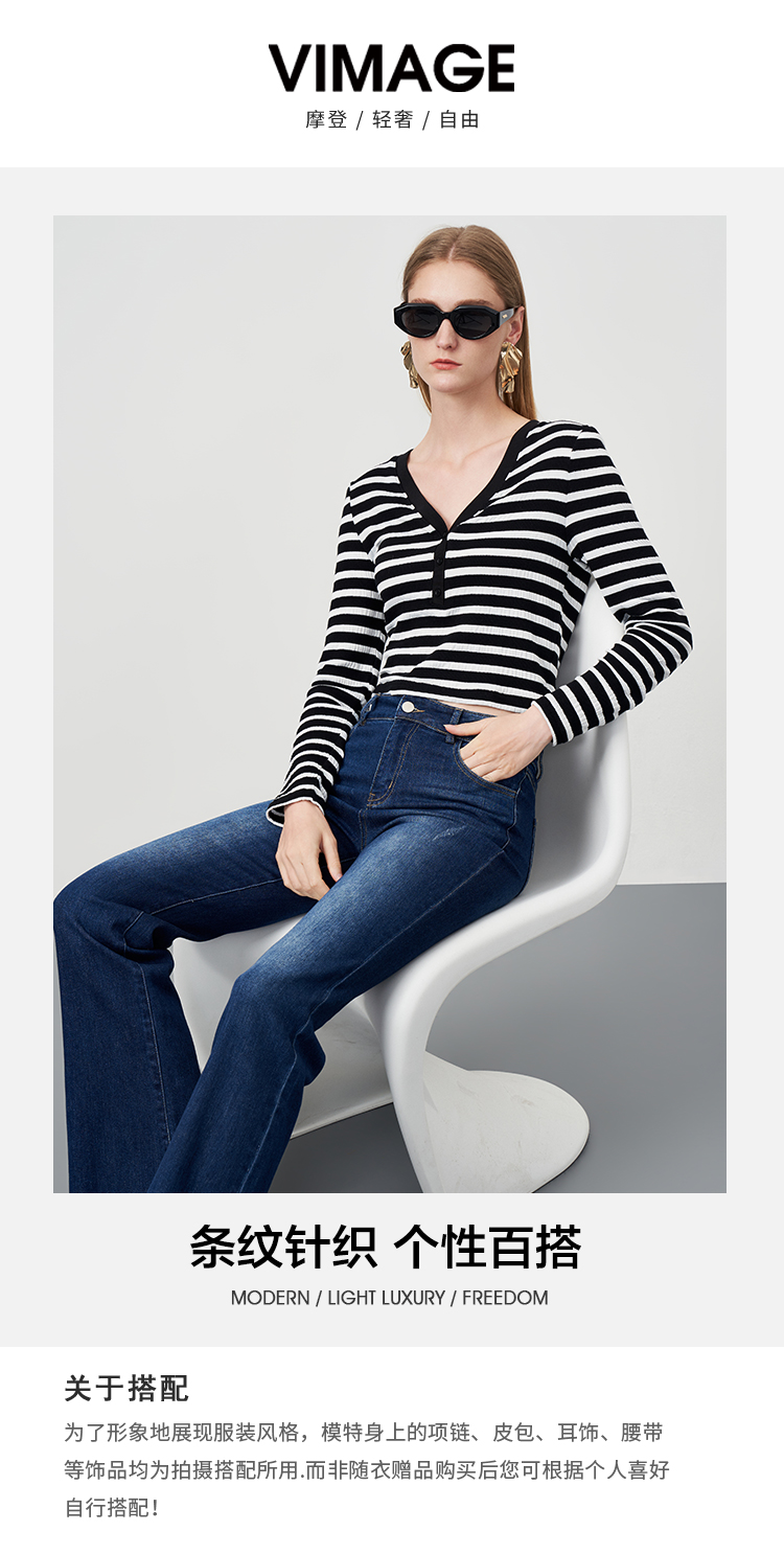 VIMAGE/纬漫纪秋季新款款时尚百搭条纹V领套头针织衫女上衣VC2213008