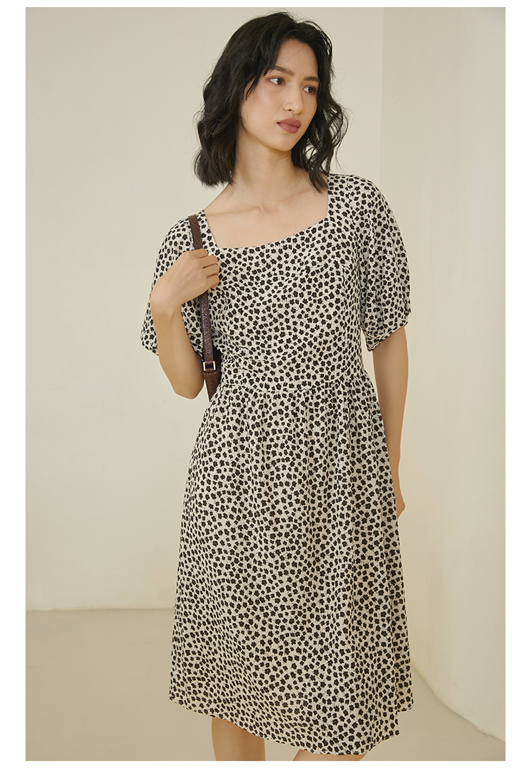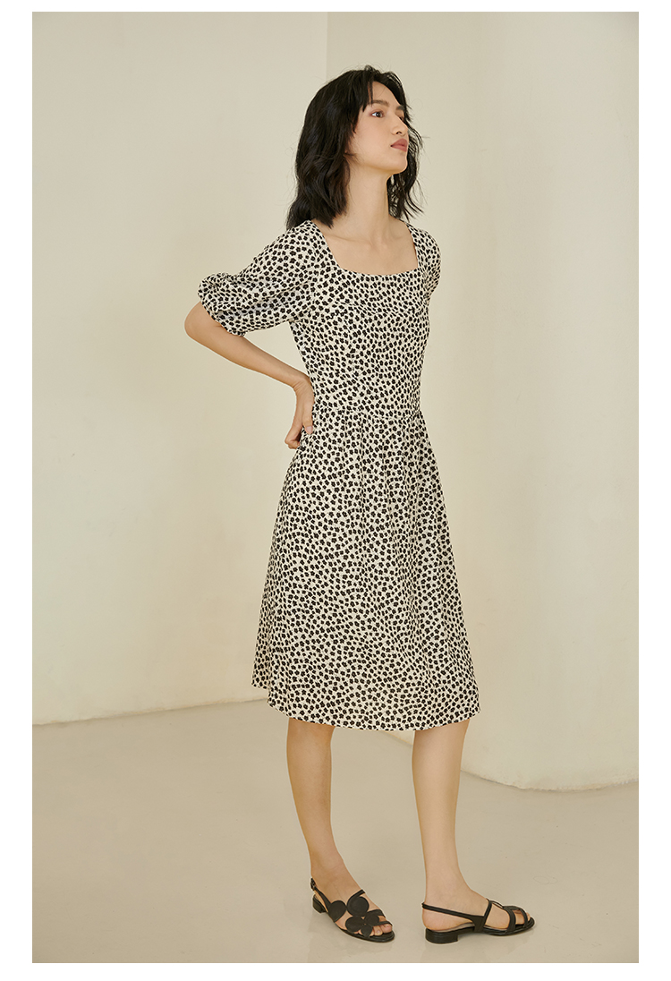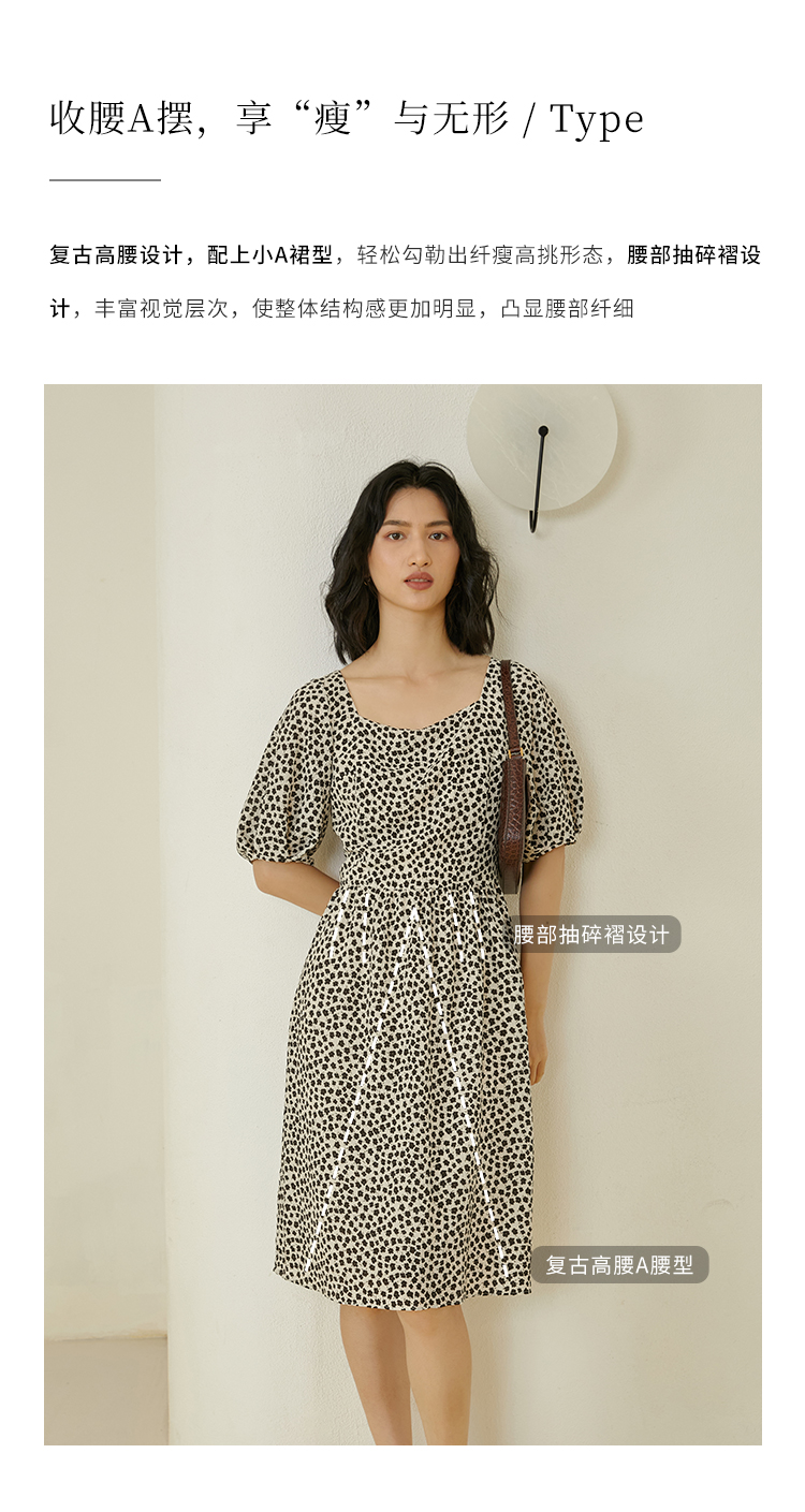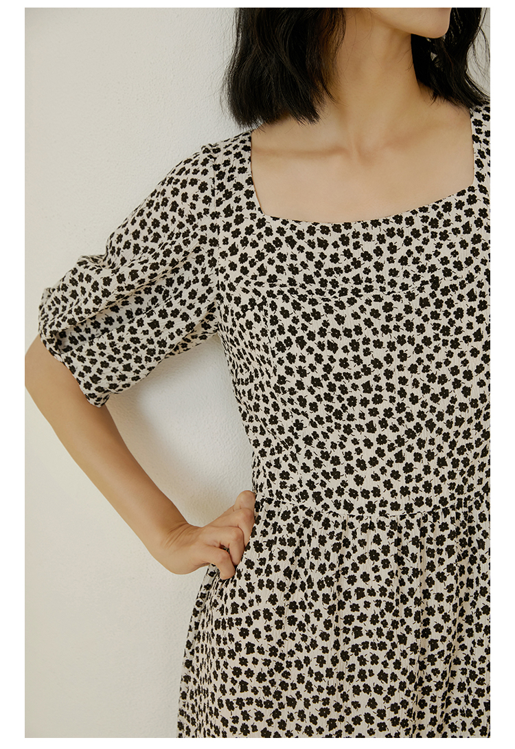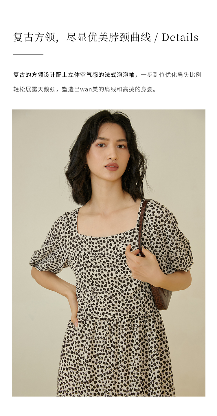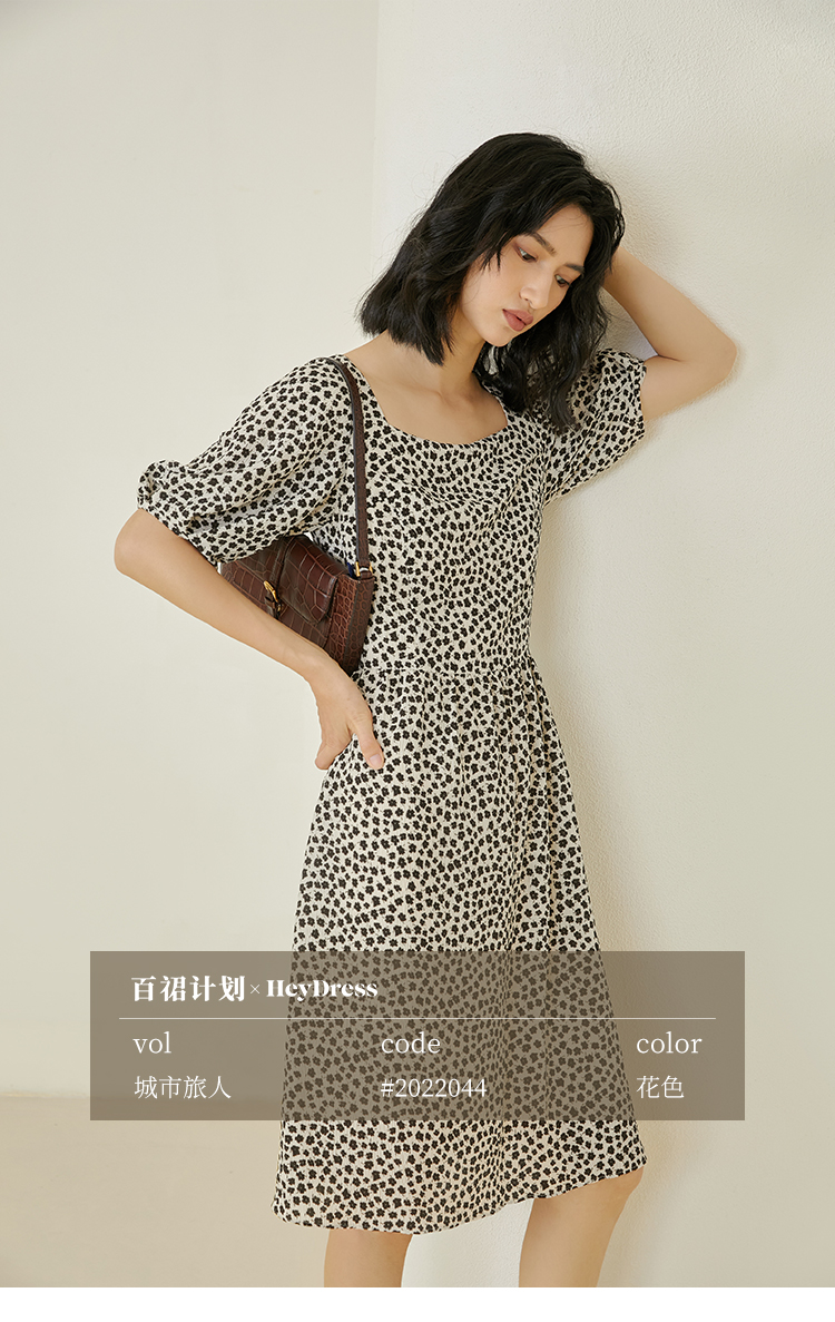 HeyDress法式复古方领碎花连衣裙女夏季高腰泡泡袖优雅气质裙子