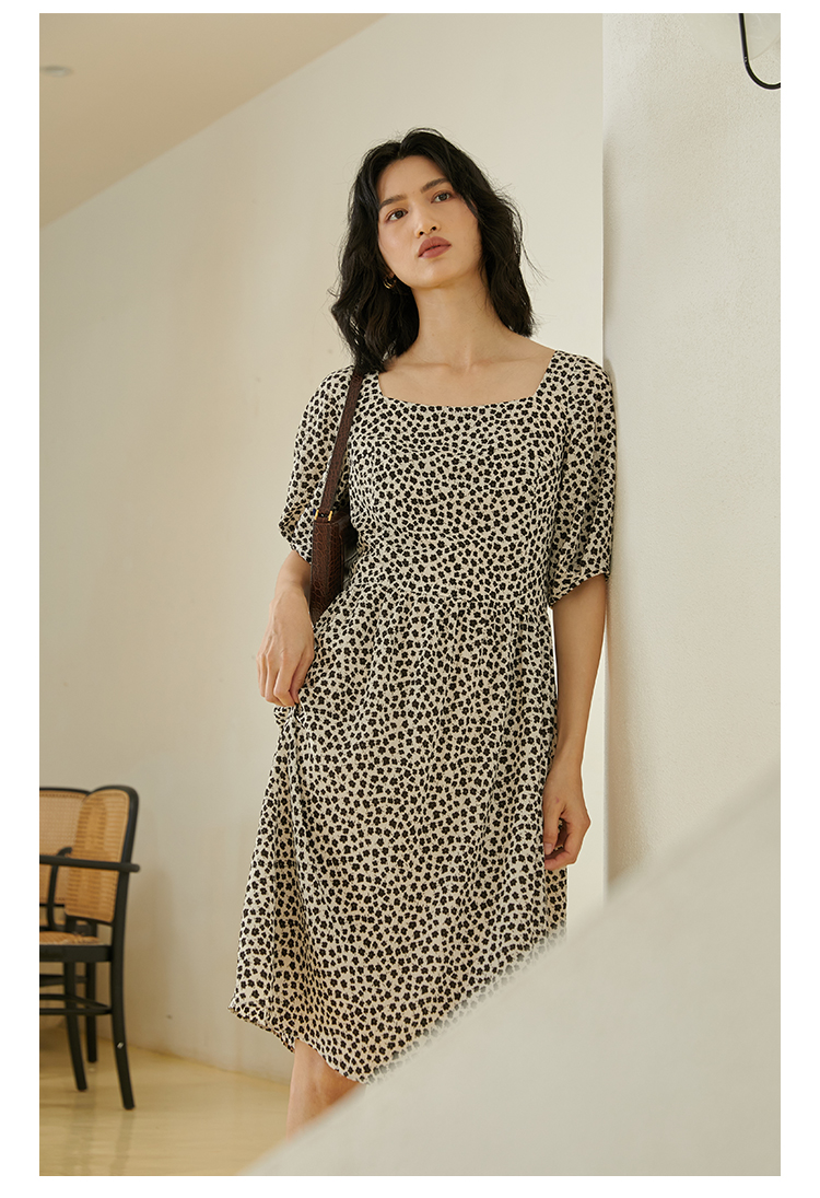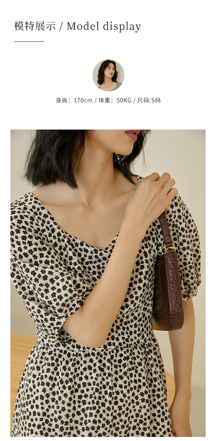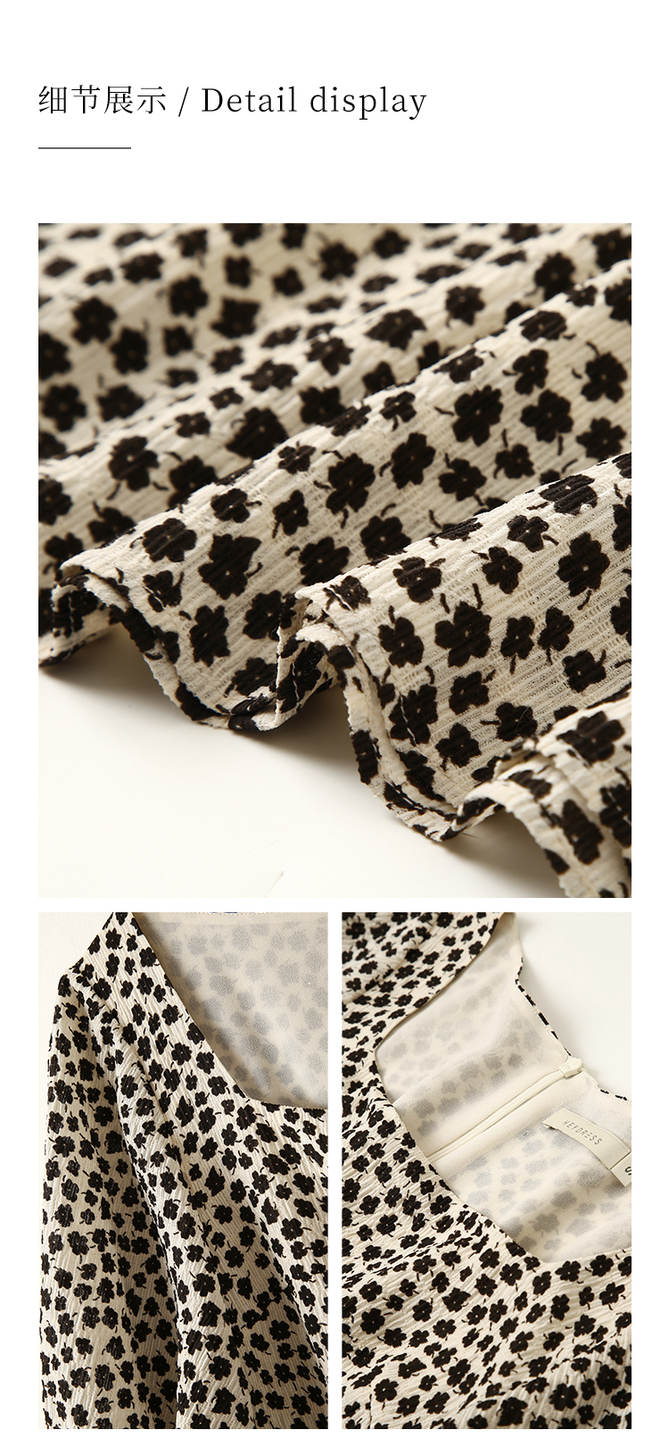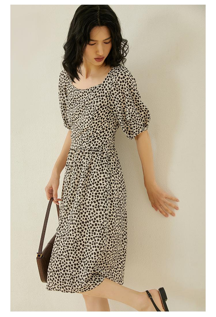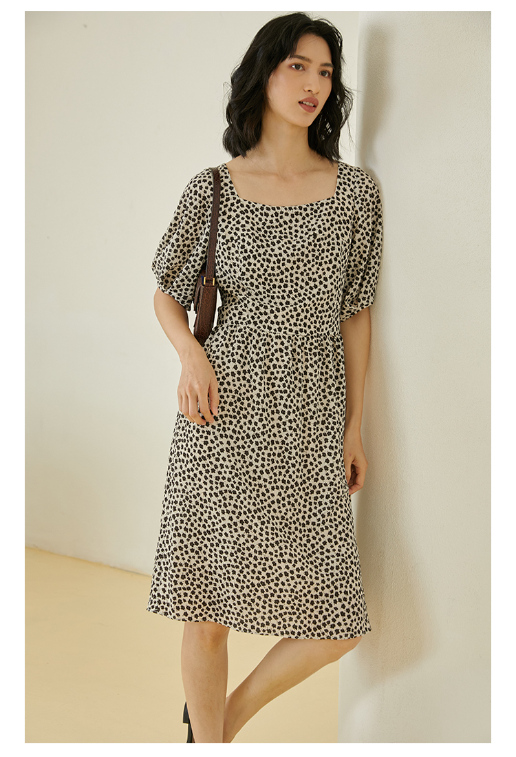 HeyDress法式复古方领碎花连衣裙女夏季高腰泡泡袖优雅气质裙子
