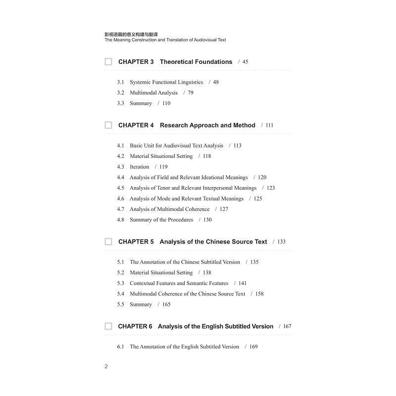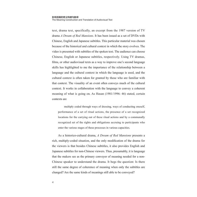本书主要探讨影视语篇的字幕对语篇整体意义构建的影响,尤其是对意义衔接与连贯的影响。本书以一部中国电视剧的字幕英、日译为例,立足于视听翻译,运用系统功能语言学理论及多模态语篇分析贯彻研究过程。本书则以情景语境系统网络框架以及衔接连贯概念为基础,提出了一个适合影视语篇中文字和非文字符号系统意义构建分析的研究方法,具有一定的学术价值。