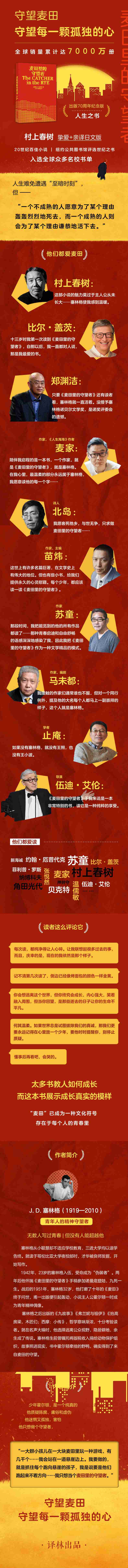 海明威、纳博科夫、约翰?厄普代克、菲利普?罗斯、苏童、麦家、郑渊洁、北岛、苗炜……历代写作者对塞林格和他的《麦田里的守望者》赞誉有加;村上春树更是亲自翻译塞林格的作品;写下《人生海海》的麦家,因本书走上创作之路。本书也出现在各类文艺作品中,如《杏仁》《挪威的森林》……新海诚的《天气之子》、押井守的《攻壳机动队》、《海街日记》作者吉田秋生的《战栗杀机》等,众多二次元名作向塞林格和他的《麦田》致敬。