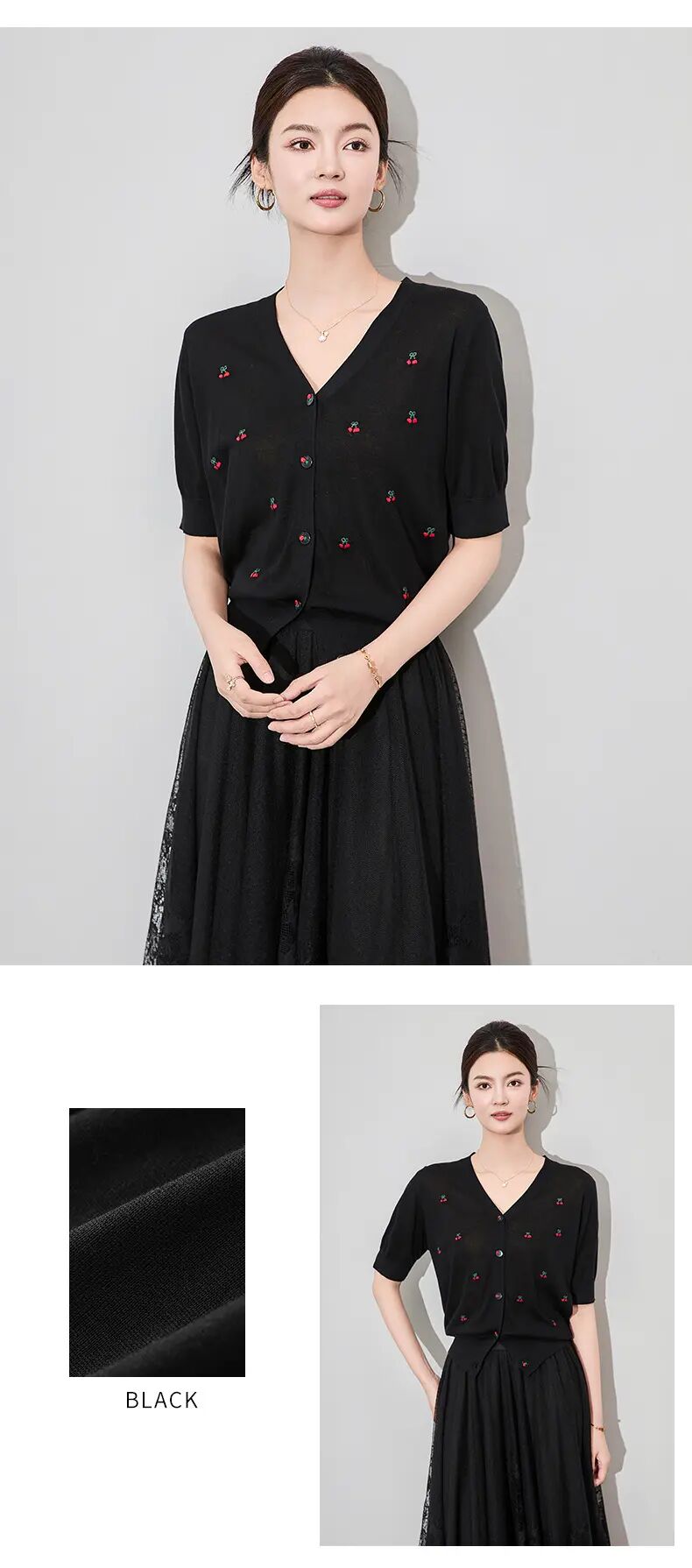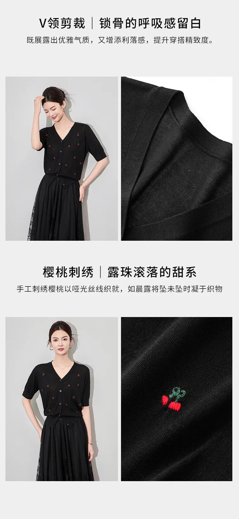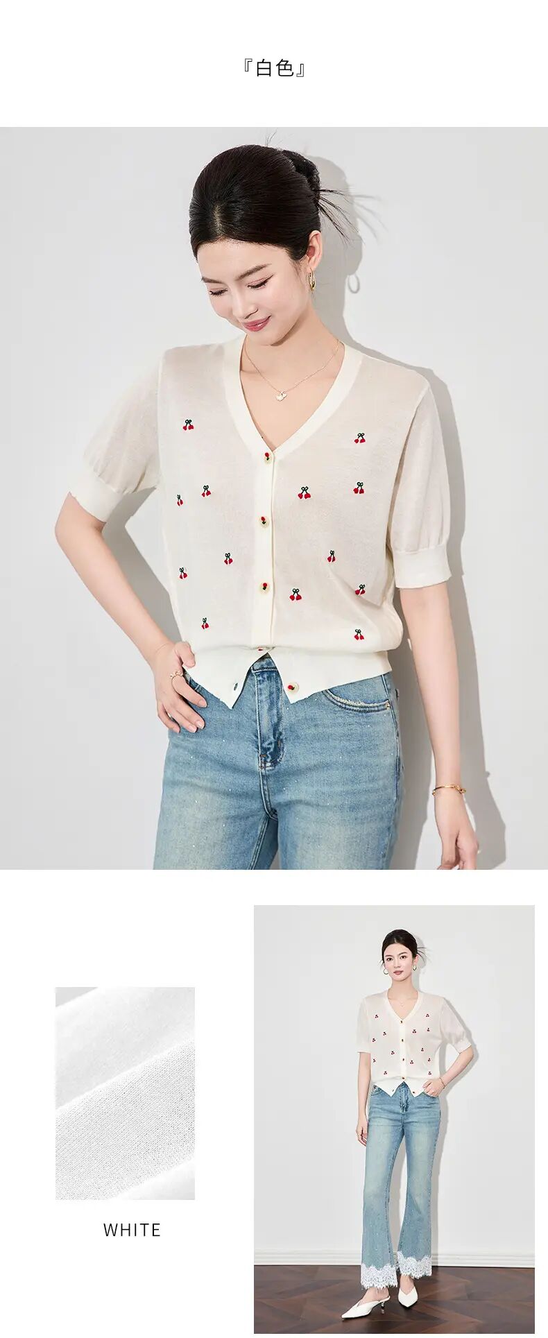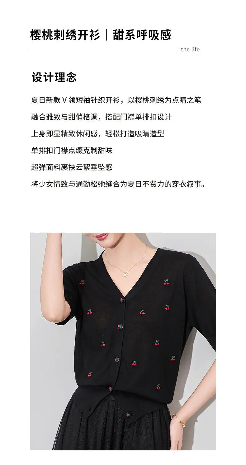 【高货wl】全新升级【铂金会员165/天猫219/差价54】(00354) 洛诗琳雅致甜俏樱桃刺绣天丝V领针织开衫精致休闲新款上衣