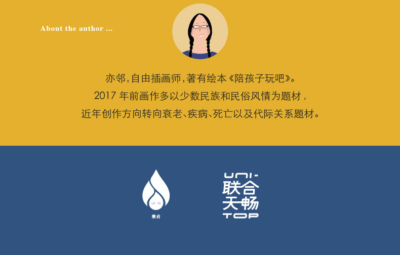 亦邻,自由插画师,著有绘本《陪孩子玩吧》。 2017年前画作多以少数民族和民俗风情为题材,近年创作方向转向衰老、疾病死亡以及代际关系题材。