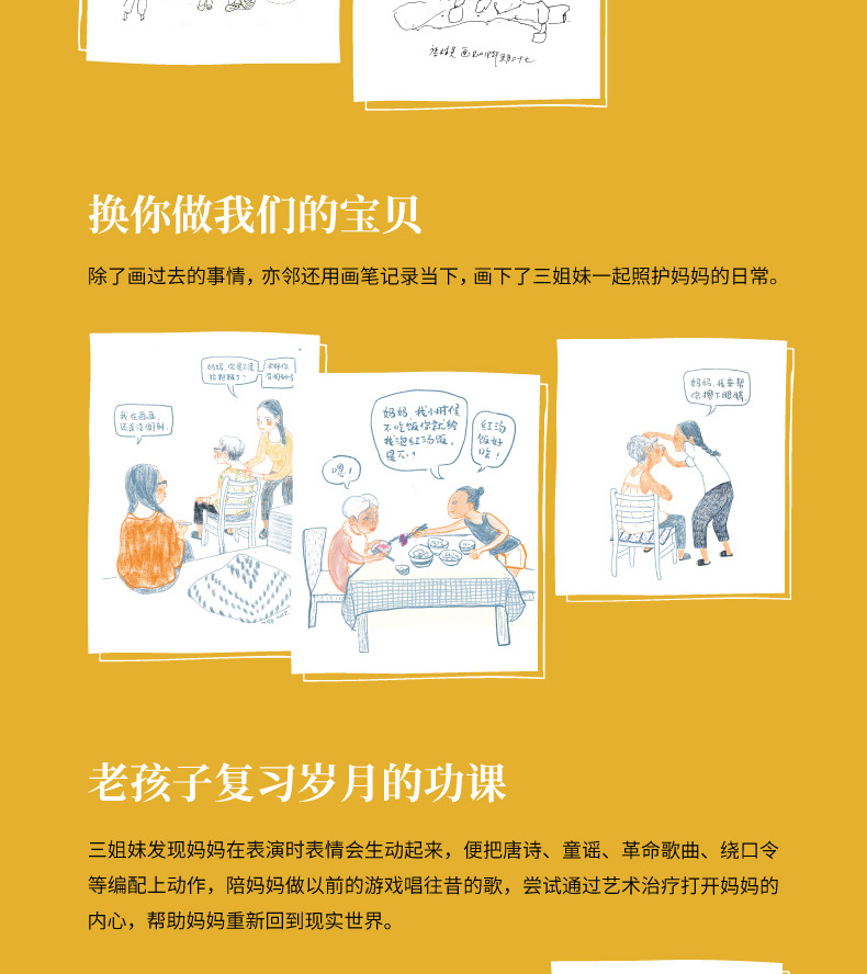 除了画过去的事,帮助妈妈找回记忆,亦邻也用画笔记录当下,画下了三姐妹照护妈妈的日常:姐姐负责照顾妈妈的饮食起居,把妈妈当成大宝宝,对待妈妈的耐心无边无际。妹妹发现妈妈在表演时表情会变得生动起来,便把唐诗、儿歌、绕口令编配上动作,三姐妹陪妈妈玩以前的游戏,唱以前的歌,想尽办法帮助妈妈锻炼头脑。亦邻则用“和老二一起画一本书”诱惑妈妈坚持画画,用画笔备份妈妈终将被阿尔茨海病默粗暴擦除的记忆。