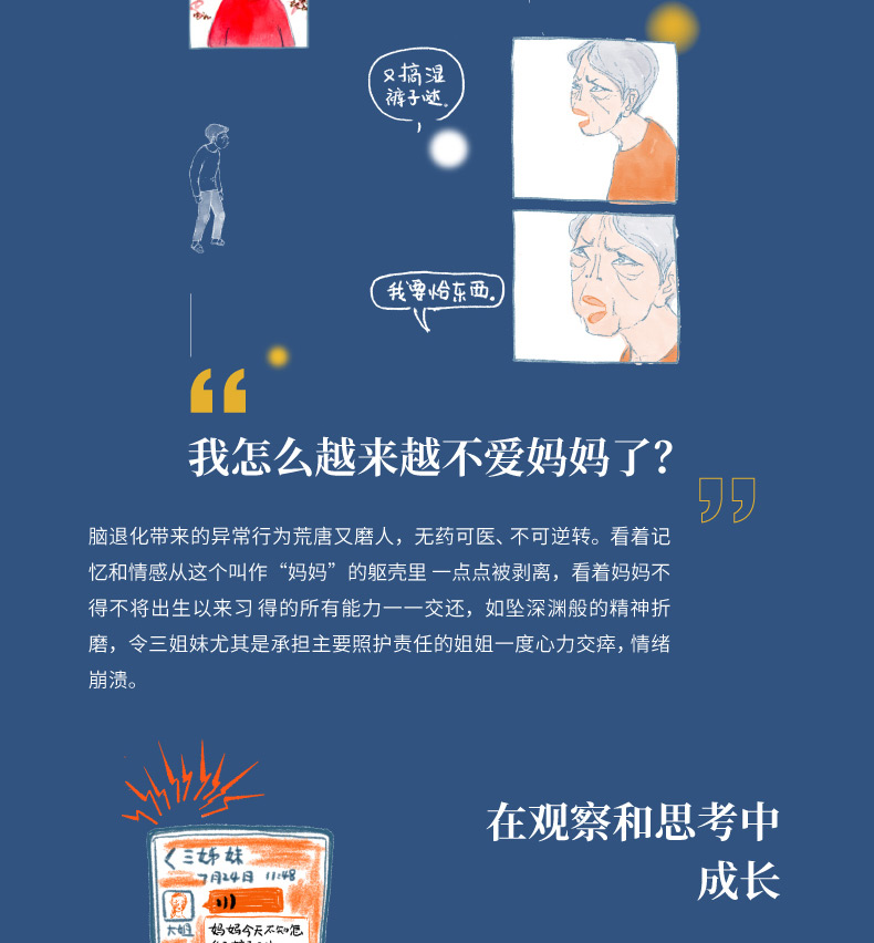 妈妈的健康状况毫无悬念地一路下滑。脑退化带来的异常行为荒唐又磨人,无药可医、不可逆转。如坠深渊般的精神折磨,一度令三姐妹心力交瘁,情绪崩溃。直面阿尔茨海默病人的家庭照护困境和病人家属的心理压力问题,亦邻也用文字记录了自己的观察和思考。