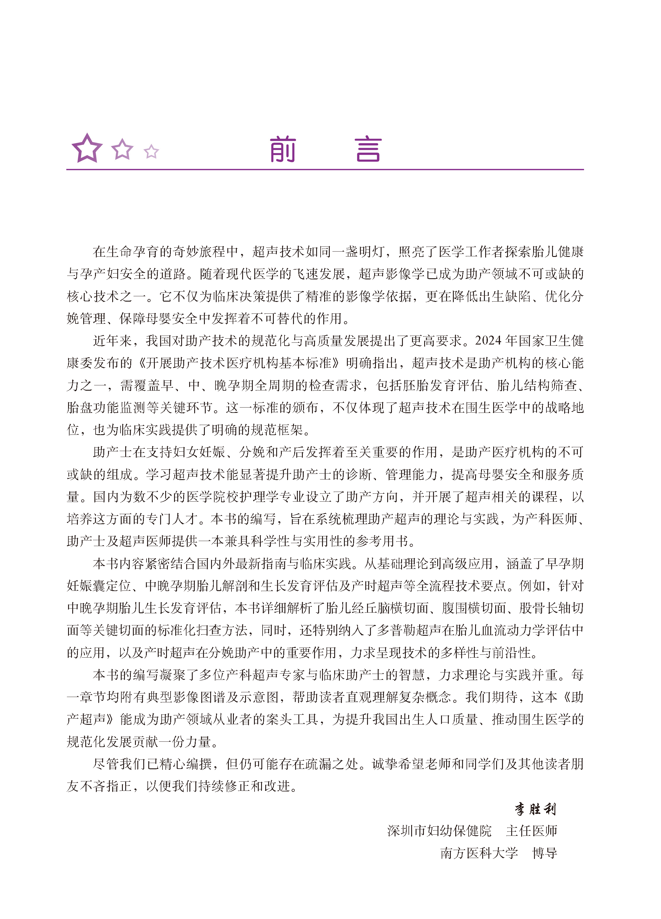 本书系统阐述了助产超声的理论和临床相关知识,全书分为7章,包括超声物理基础与超声仪器原理;产科超声检查概论;正常胎儿超声解剖与测量;多普勒技术在产前诊断和临床处理的应用;胎儿生长异常与母胎血流监护;胎盘、脐带与羊水异常;产时超声。本书既有实用的助产超声相关理论,又有丰富的临床实践经验,讲解系统,图文并茂,实用性强,能够帮助读者切实提高超声诊断水平,适于各级医院超声科医师、助产士、产科医师、产科护士等阅读参考。