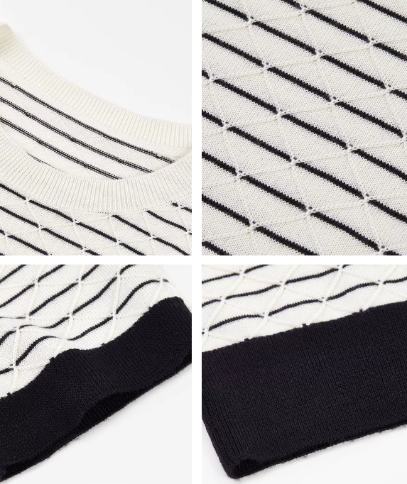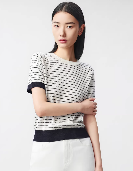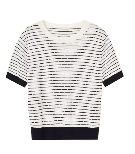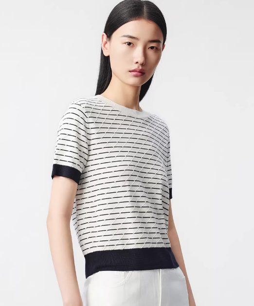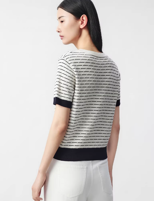 朗姿 气质丝绵条纹半袖针织衫女秋简约菱格短上衣LCJH01KPR472