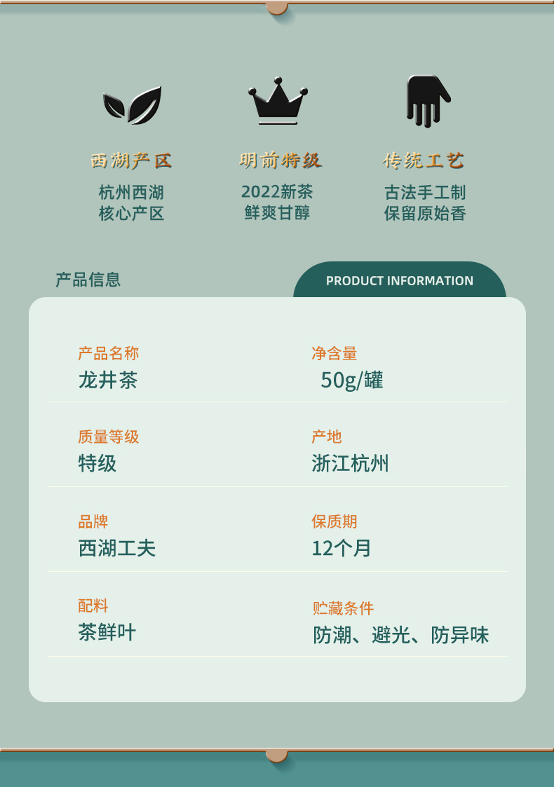 西湖工夫2022新茶龙井明前特级50g杭州味道瓷罐