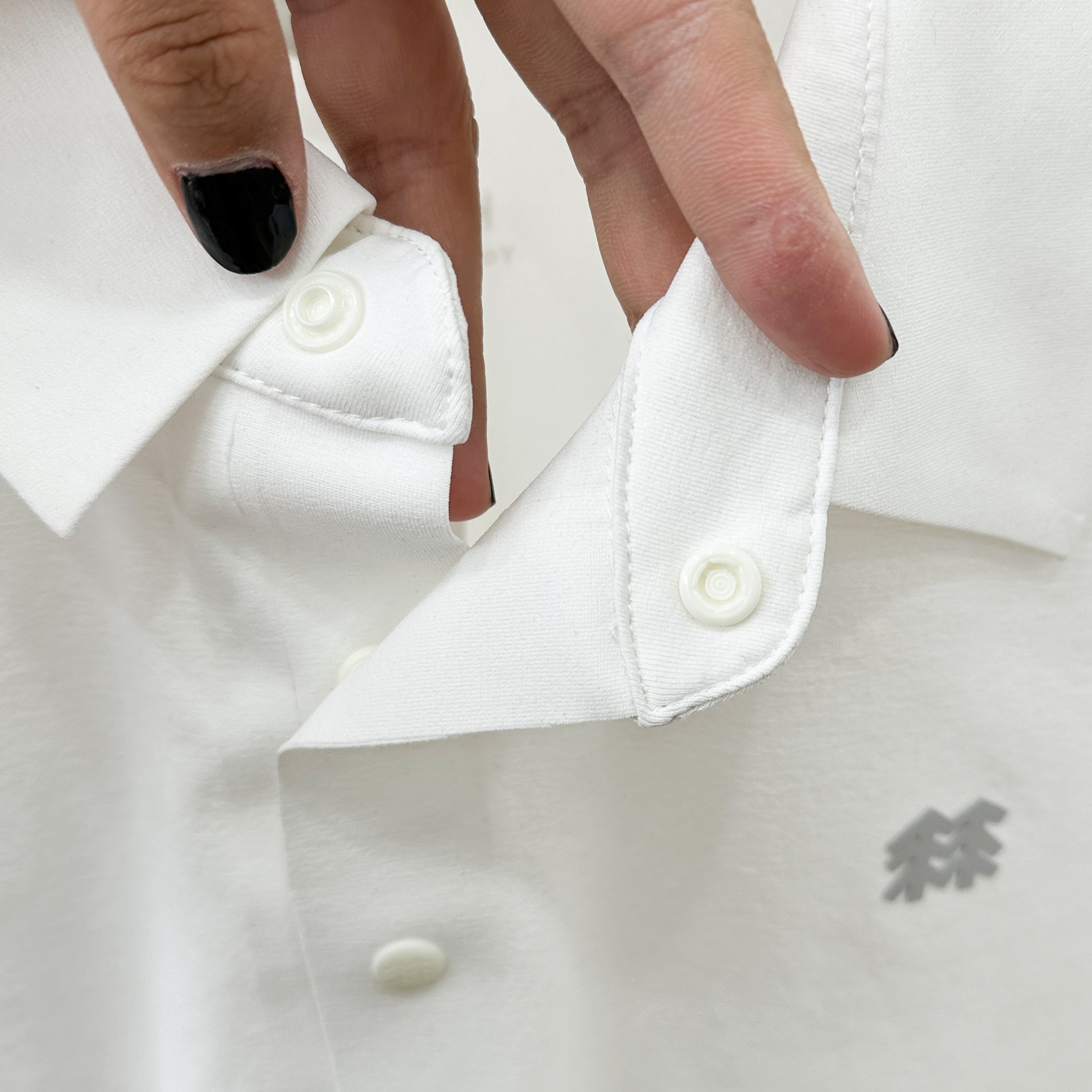 纯净无瑕的白色,宛如春日初雪,散发着清新、雅致的气息,无需过多修饰,便能轻松驾驭各种场合。简洁的翻领设计,是对经典的致敬,恰到好处地勾勒出颈部线条,为穿着者增添一份利落与干练。领口处精致排列的纽扣,不仅是实用的点缀,更在不经意间彰显出低调的奢华质感。