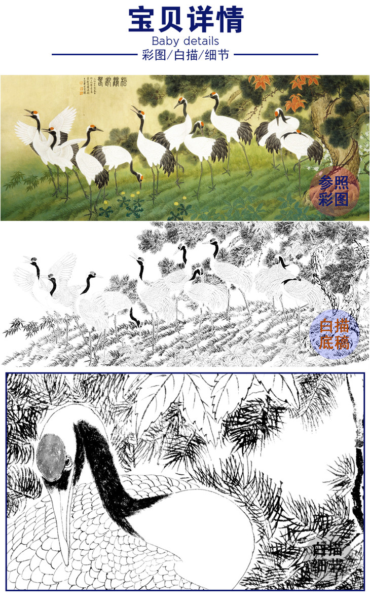 横幅工笔花鸟白描底稿-金鸿钧《松鹤迎春》-多种白描尺寸可选-QA03