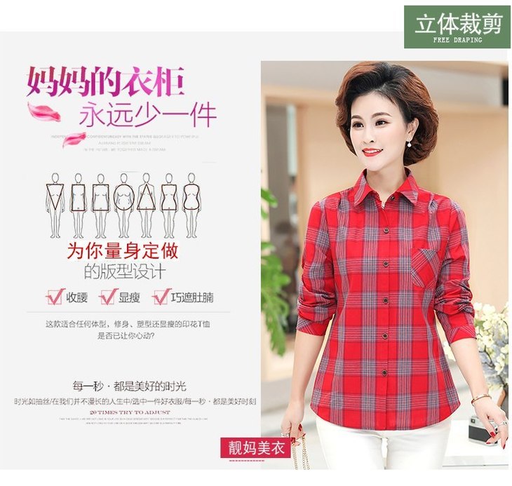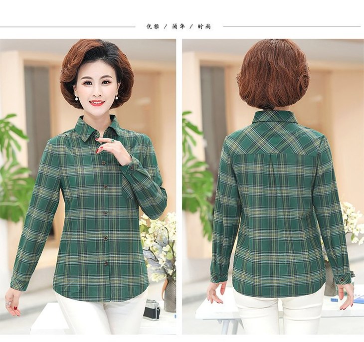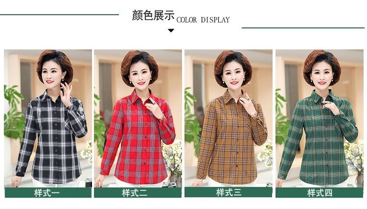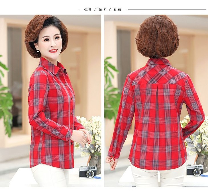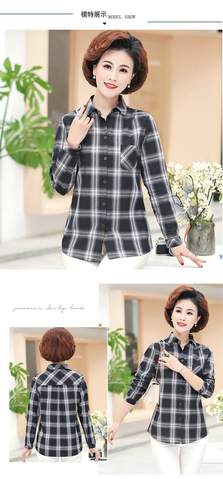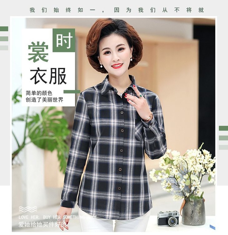 NP 春秋薄款上衣妈妈磨毛棉格子衬衫宽松显瘦休闲衬衣
