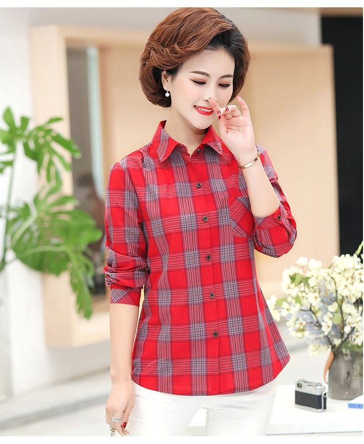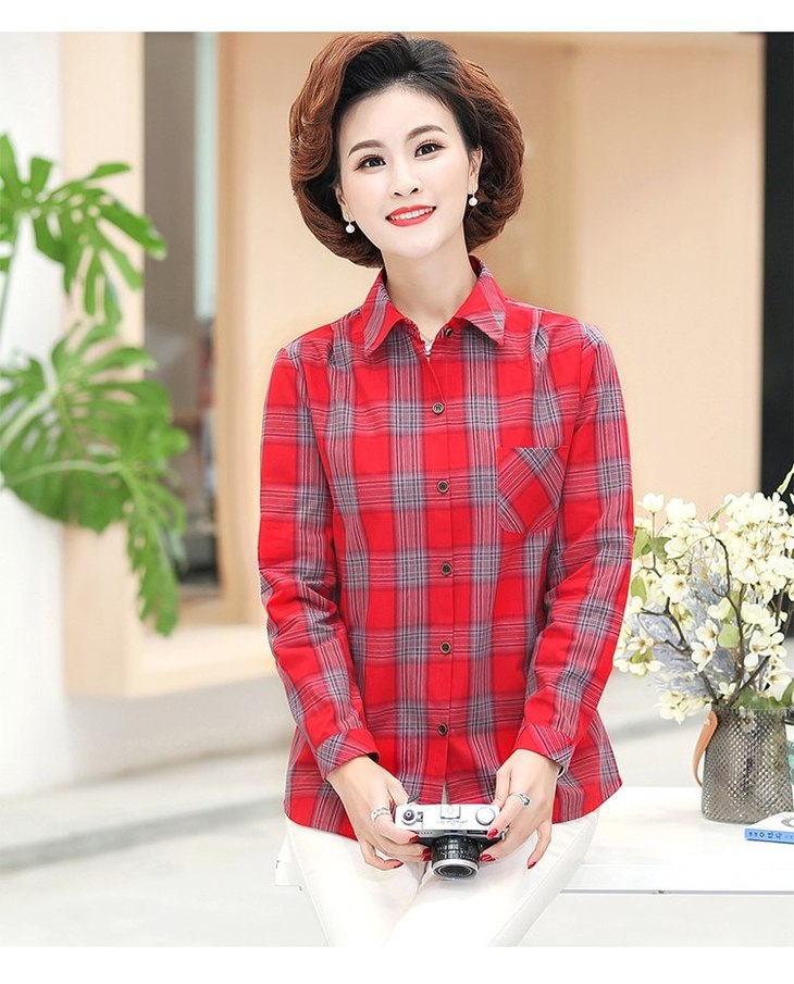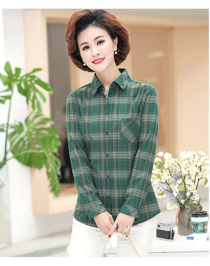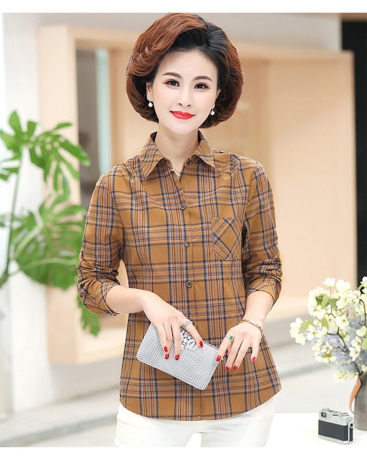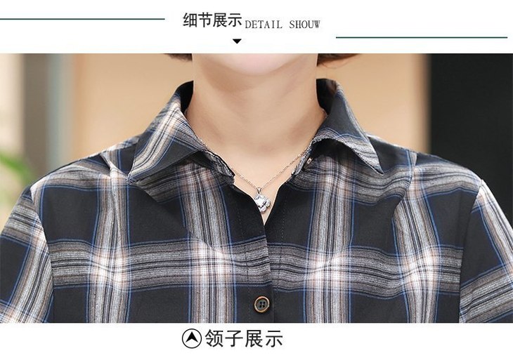 NP 春秋薄款上衣妈妈磨毛棉格子衬衫宽松显瘦休闲衬衣