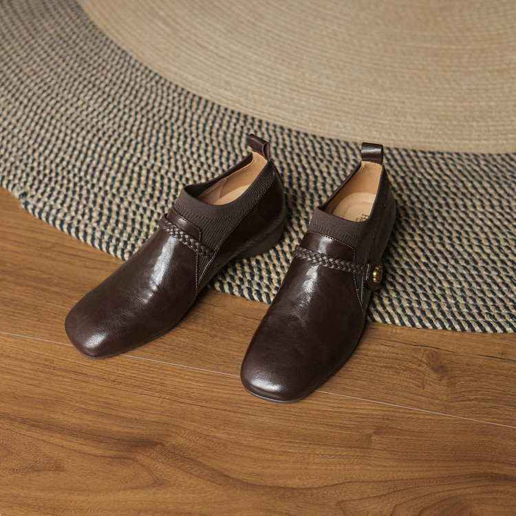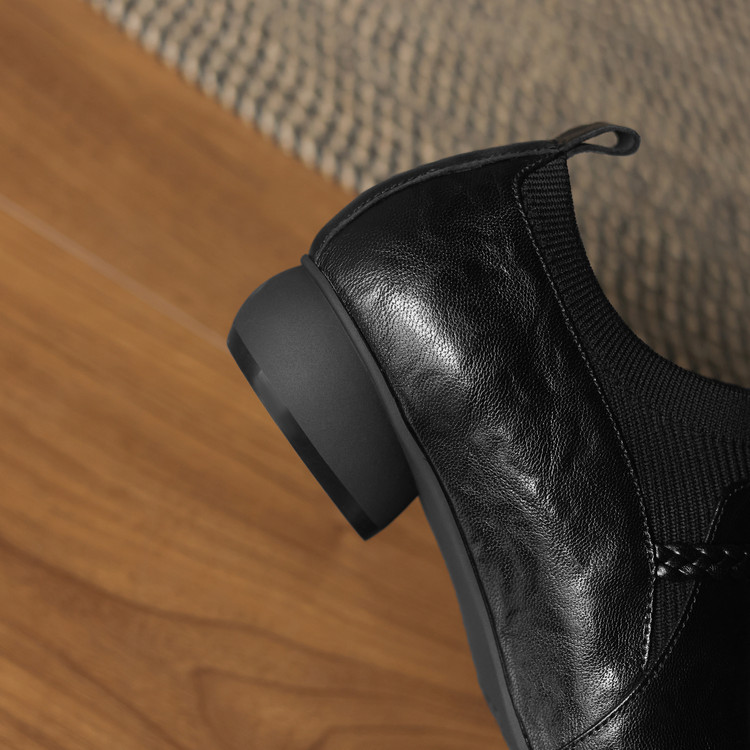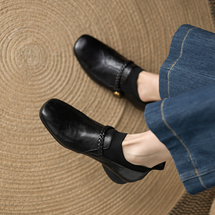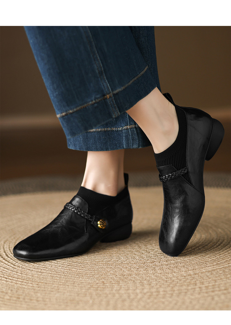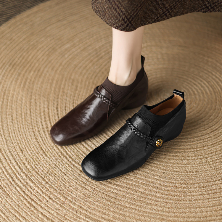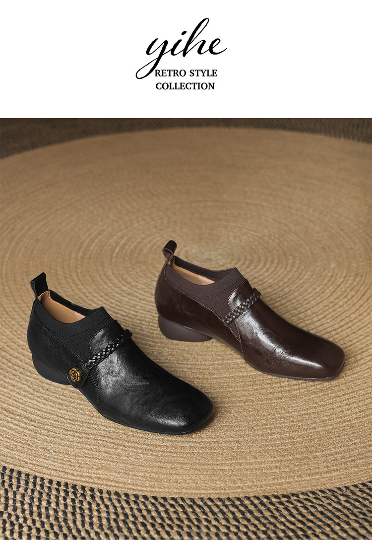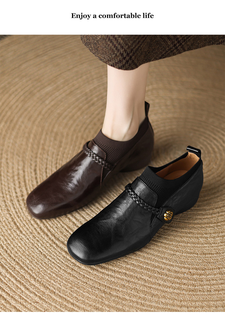【预售5天】真皮针织深口高跟鞋中跟粗跟软羊皮方头乐福小皮鞋复古单鞋女LD&7441