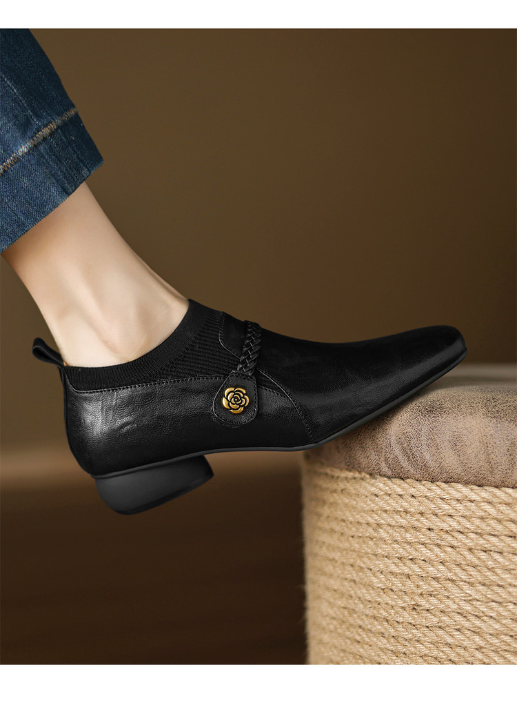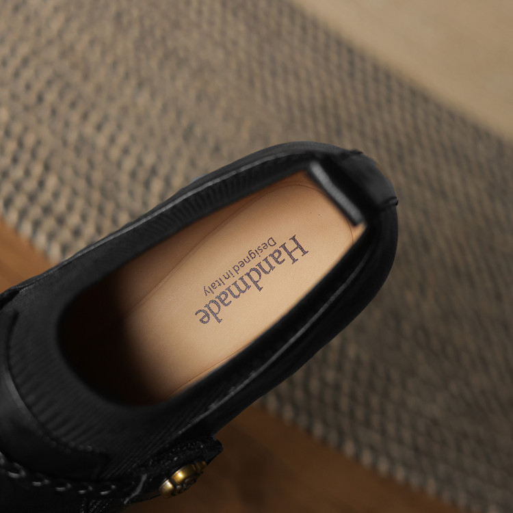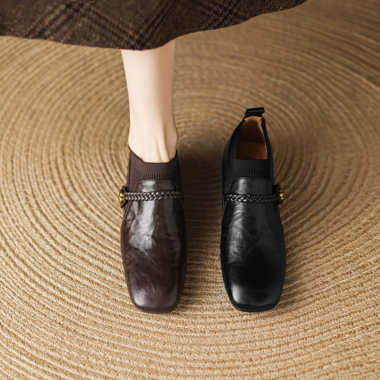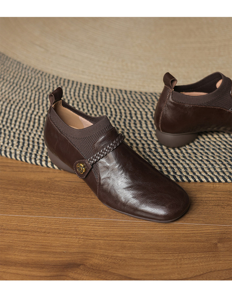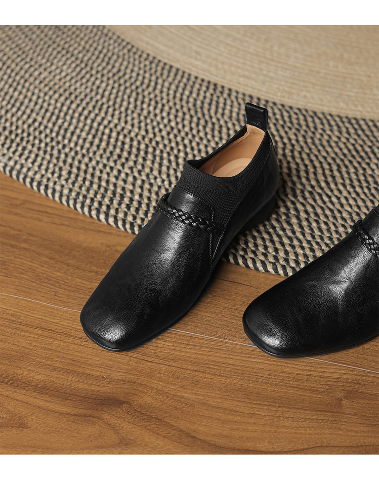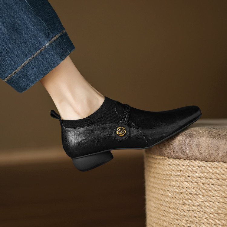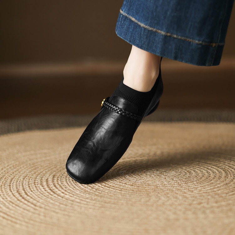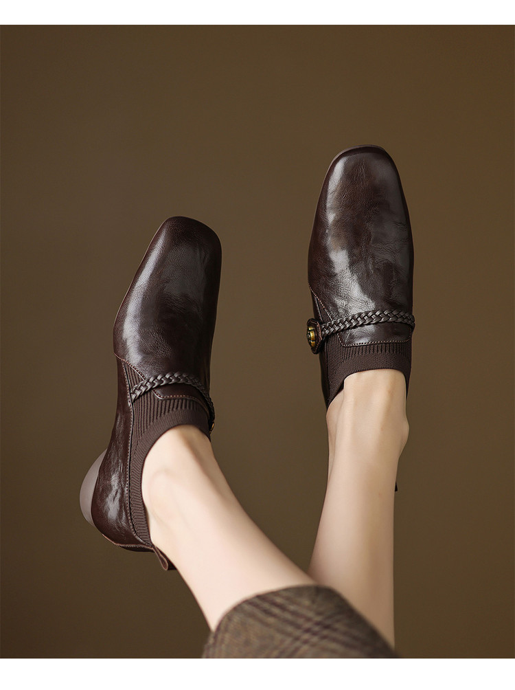【预售5天】真皮针织深口高跟鞋中跟粗跟软羊皮方头乐福小皮鞋复古单鞋女LD&7441