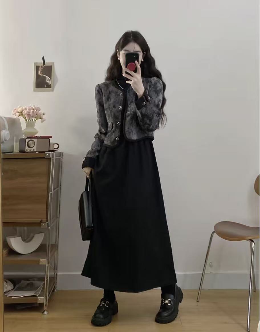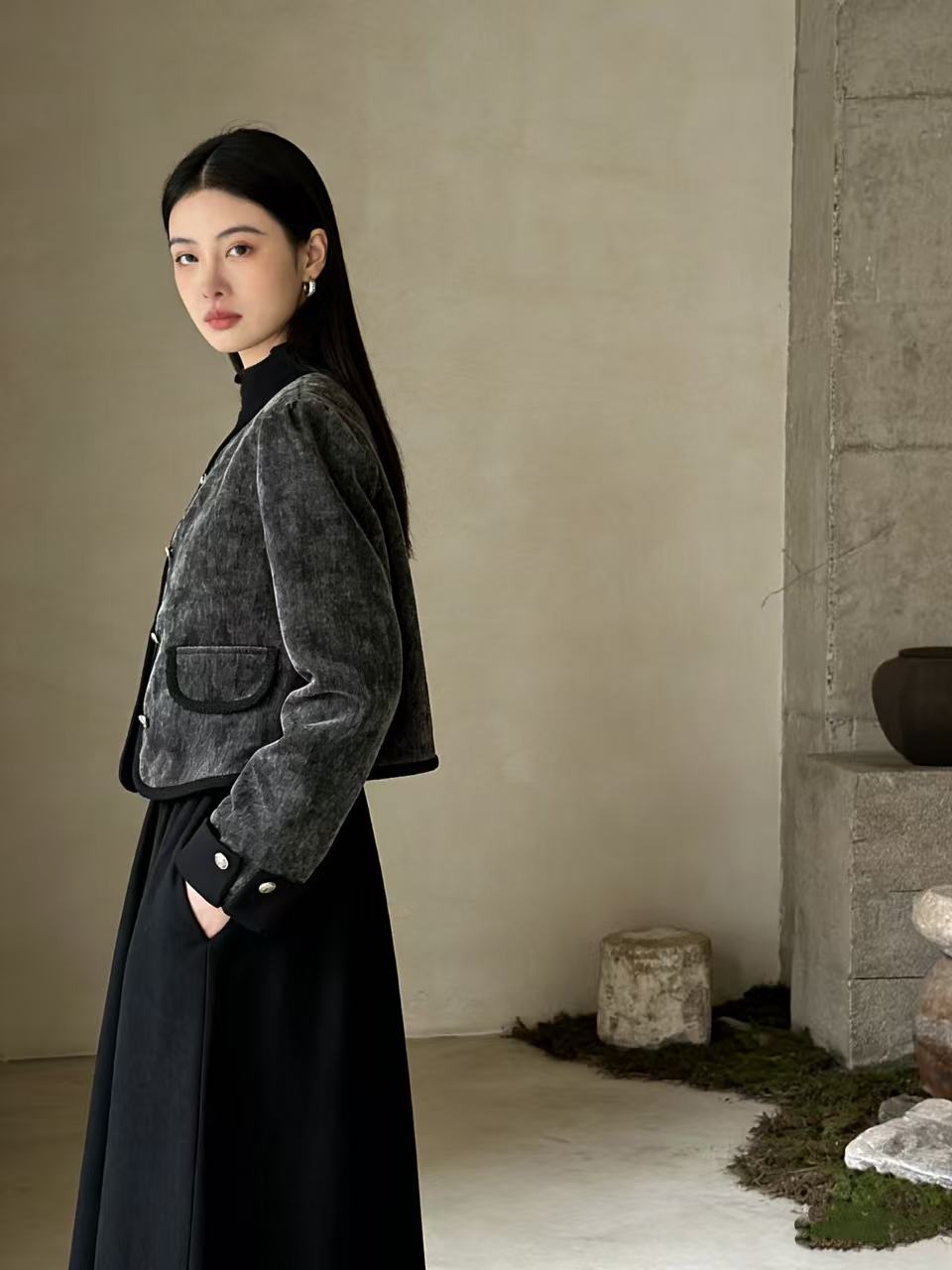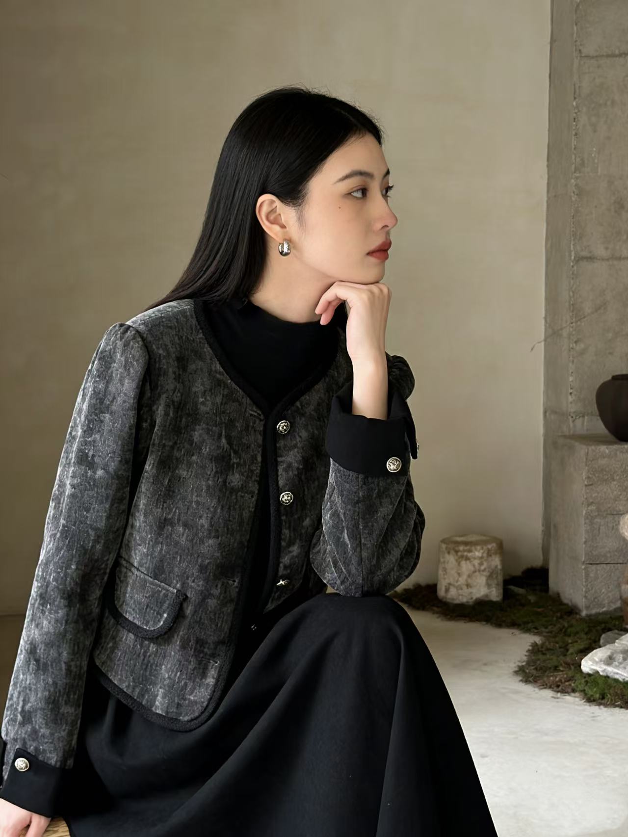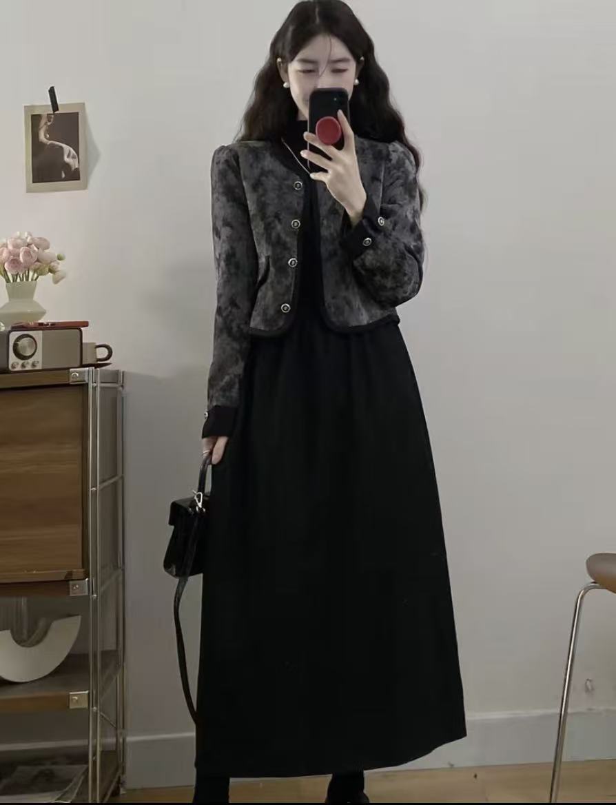 活动爆款~【自营】衣周期~(二件套)Q88小香风复古丝绒外套➕黑色打底连衣裙套装-喜出