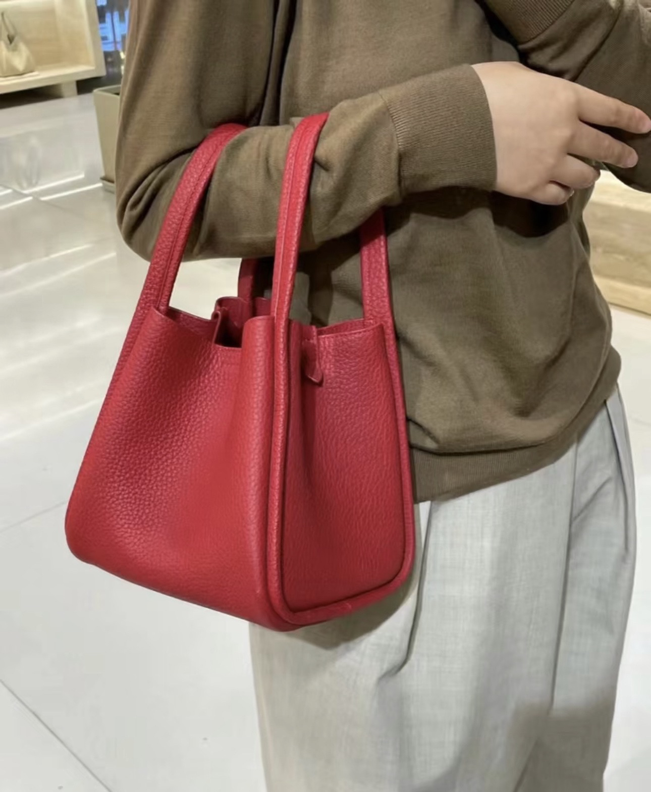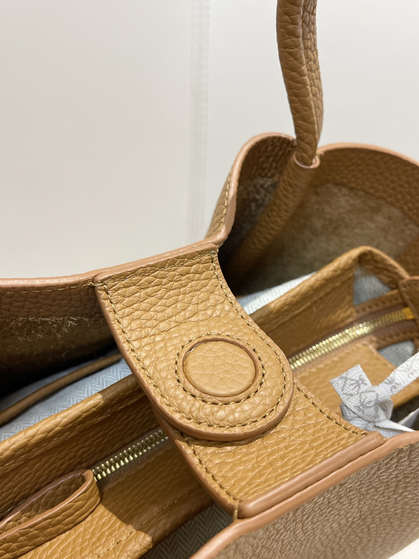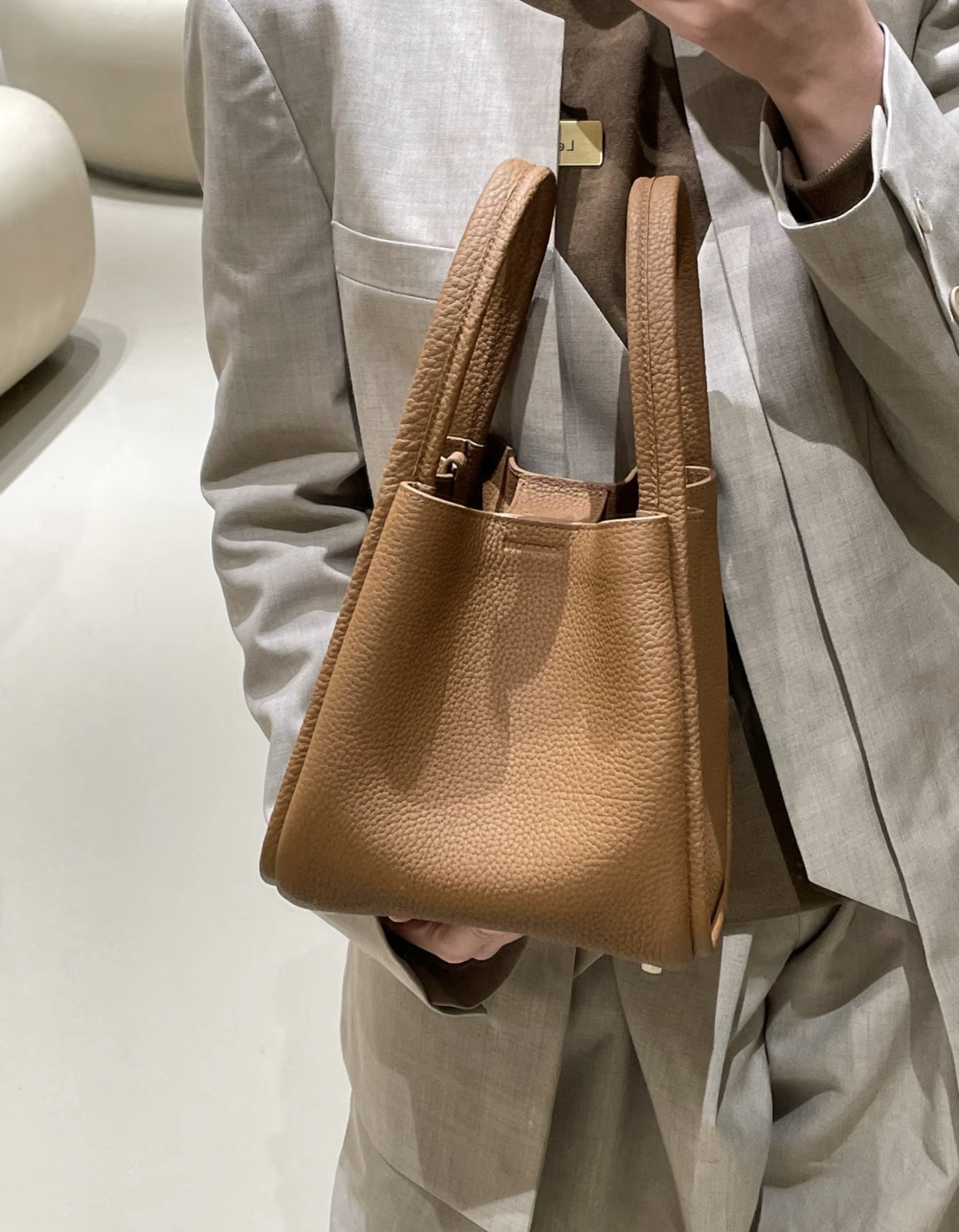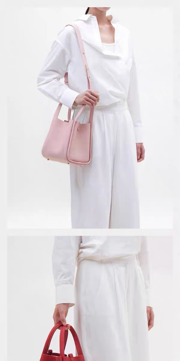 甄选优质全粒面头层牛皮,手感柔软细腻有韧性,自带的荔枝纹纹路清晰细腻 使用后日益油润有光泽度,越背越有味道,包型挺括不软塌 内里底部支撑不易变形 搭载“菜篮子”的独特造型 优雅低调,水桶廓形勾勒利落的线条,不加以过多修饰却高级感满满~