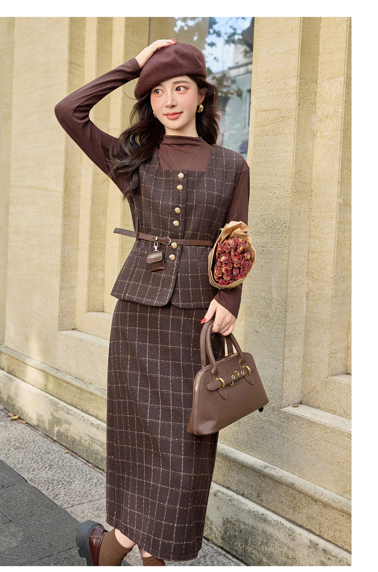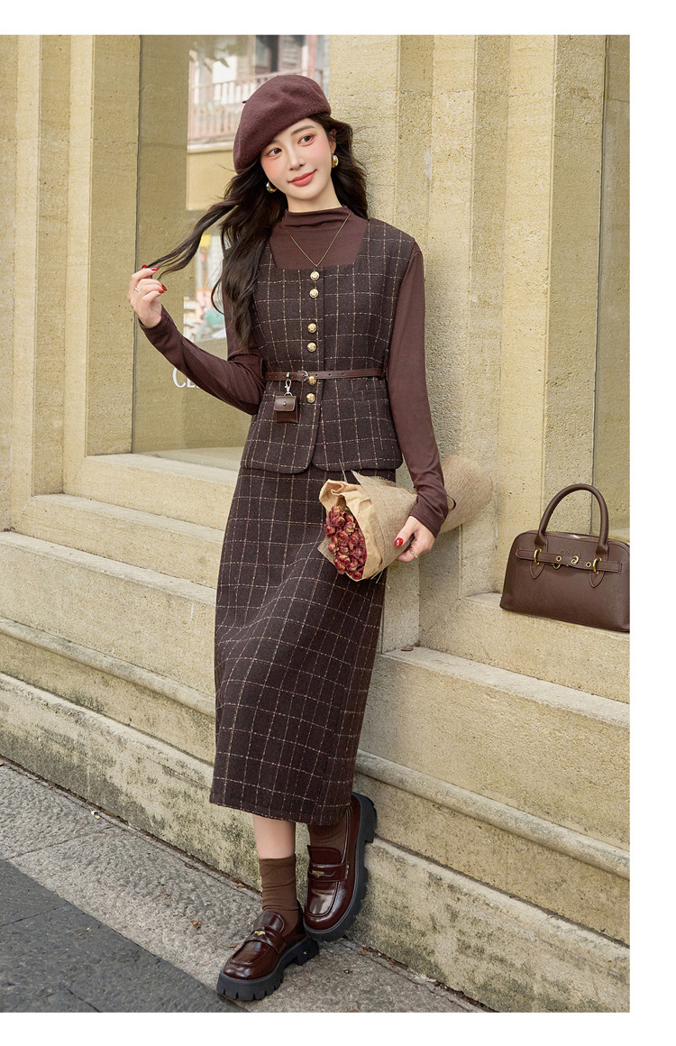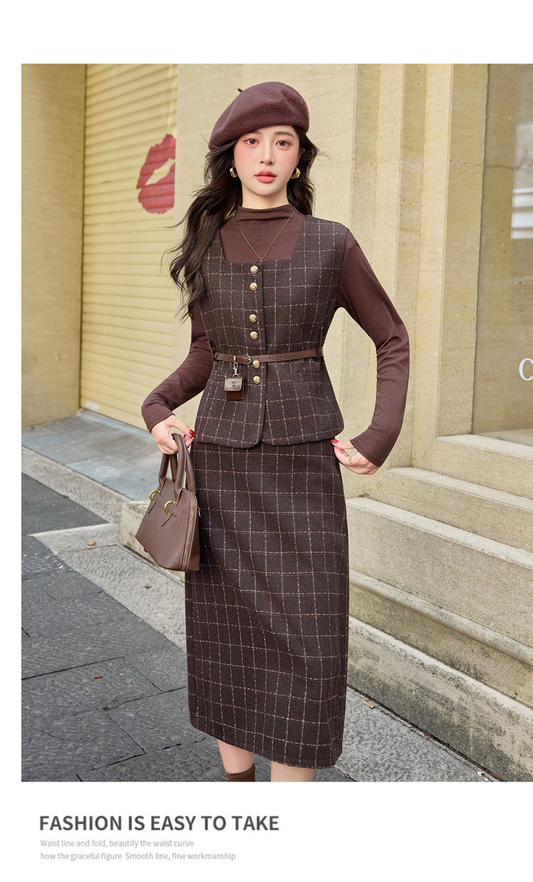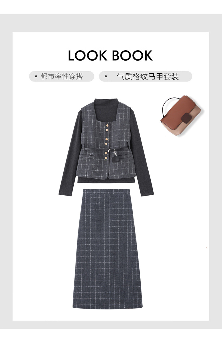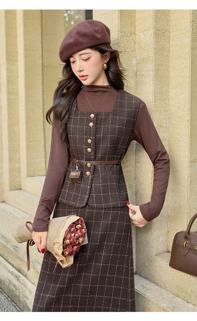 HR YJLY8673百搭气质格纹三件套裙配腰带