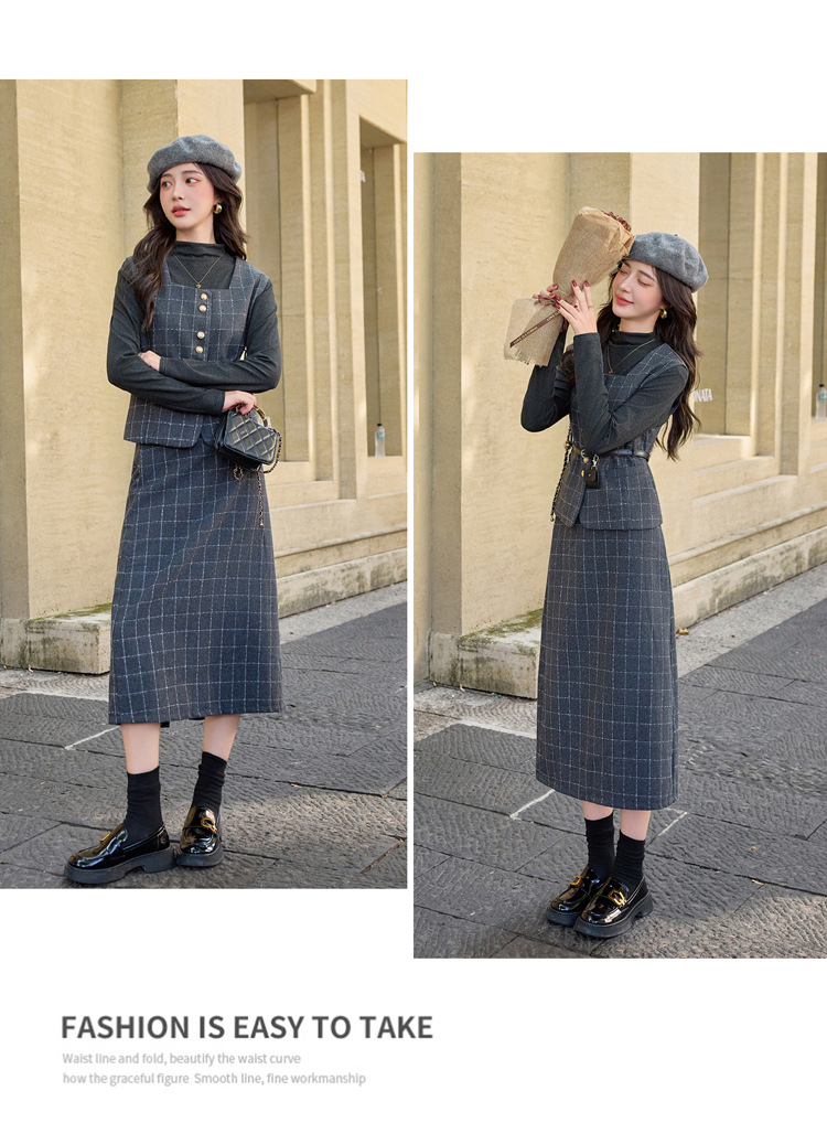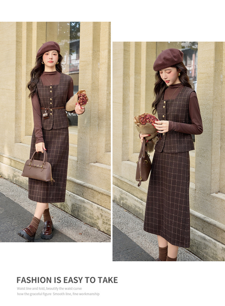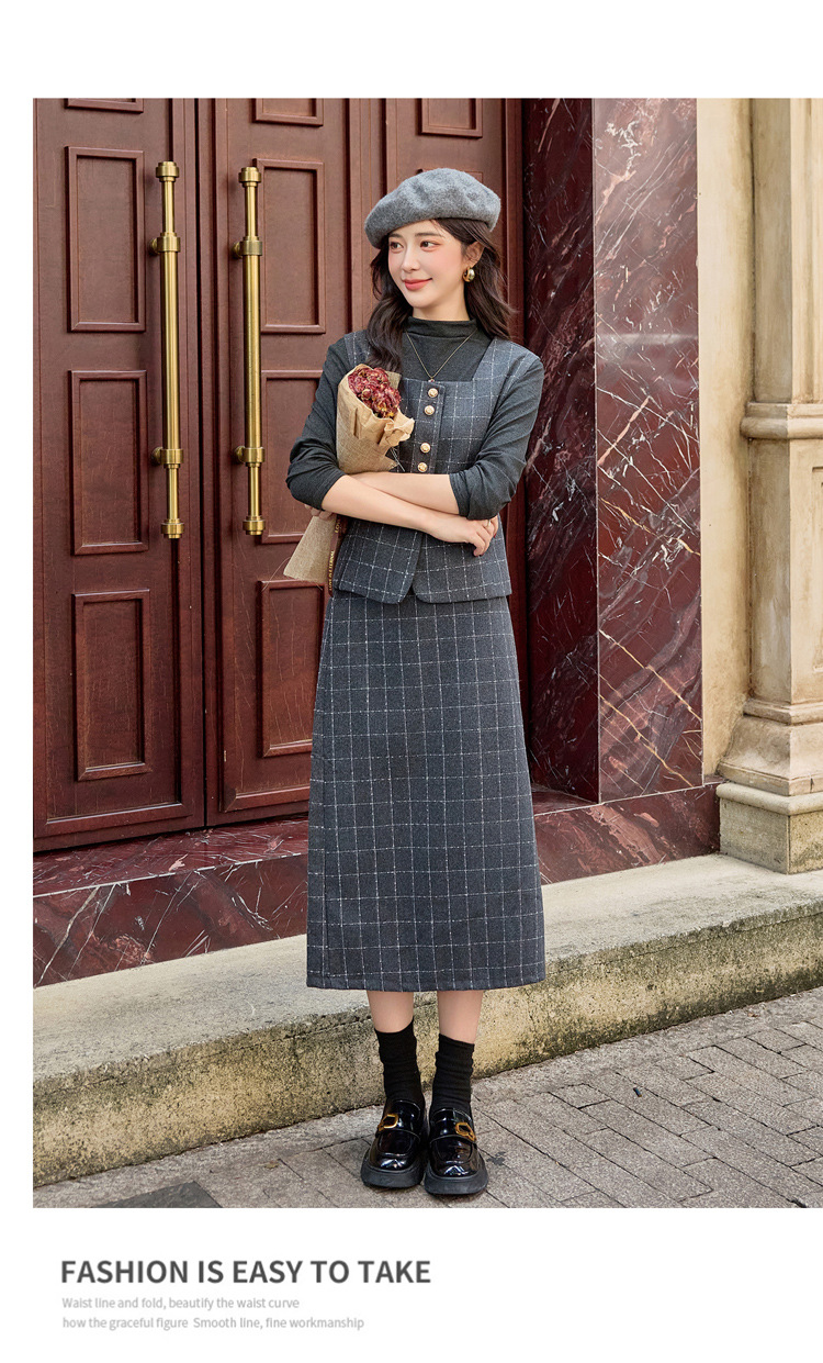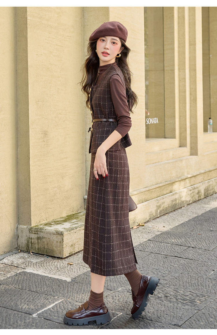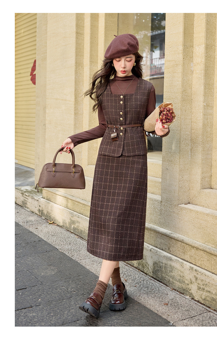 HR YJLY8673百搭气质格纹三件套裙配腰带