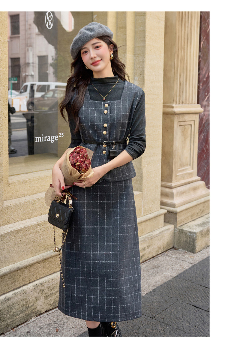 HR YJLY8673百搭气质格纹三件套裙配腰带 商品图0