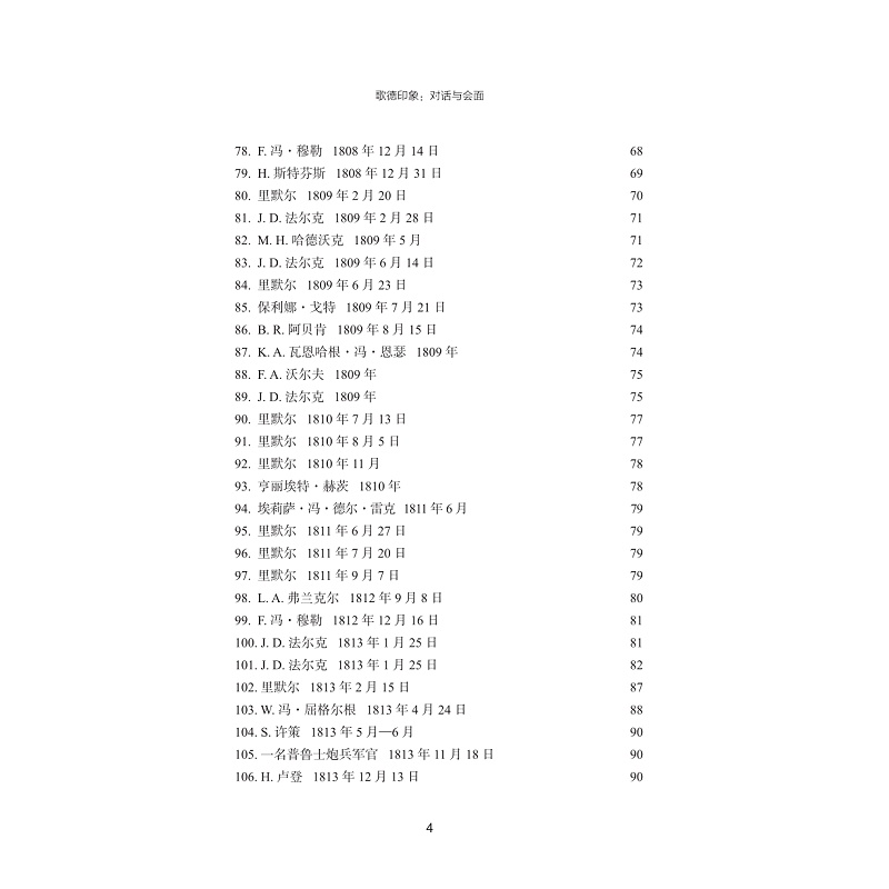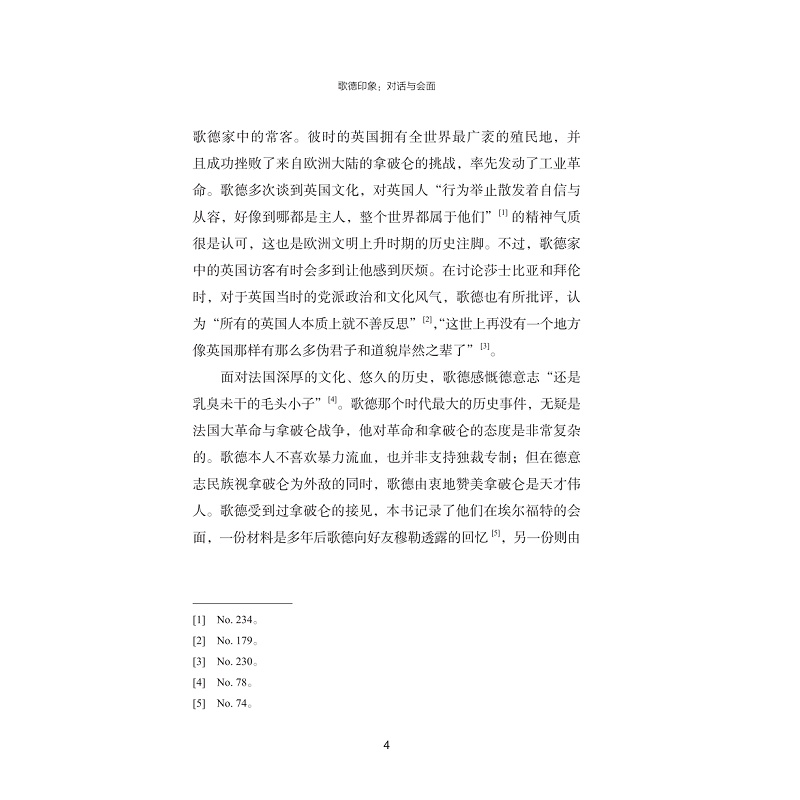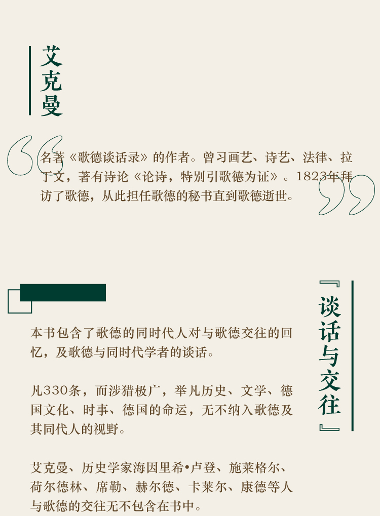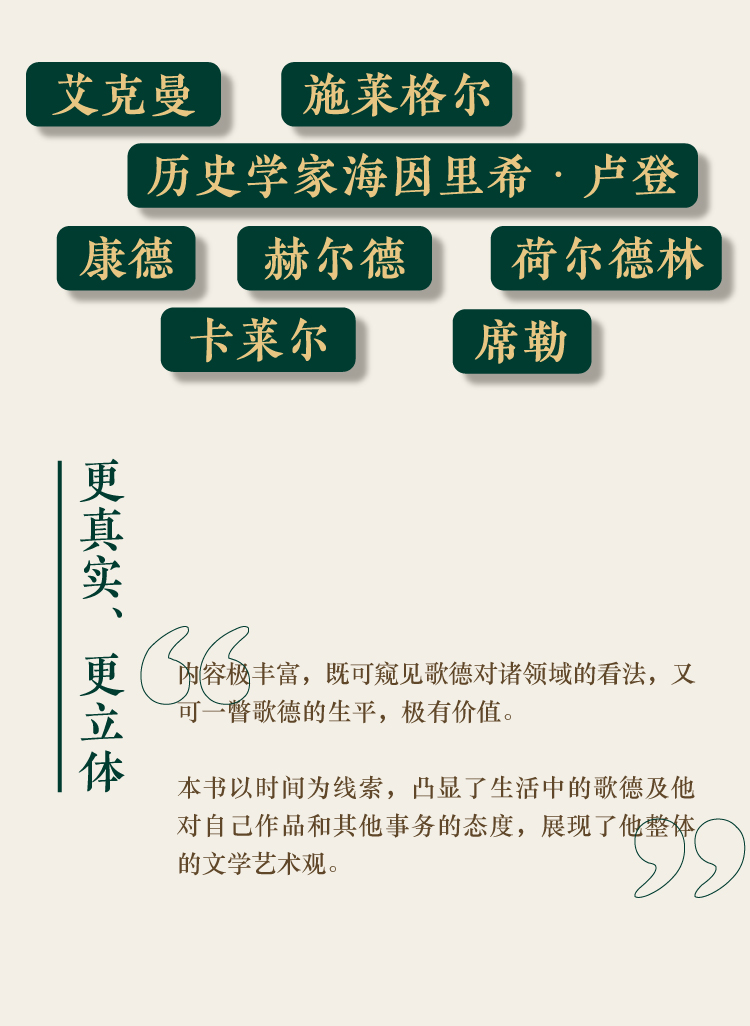 本书包含了歌德的同时代人对与歌德交往的回忆,及歌德与同时代学者的谈话。凡330条,而涉猎极广,举凡历史、文学、德国文化、时事、德国的命运,无不纳入歌德及其同代人的视野。艾克曼、历史学家海因里希?卢登、施莱格尔、荷尔德林、席勒、赫尔德、卡莱尔、康德等人与歌德的交往无不包含在书中。内容极丰富,既可窥见歌德对诸领域的看法,又可一瞥歌德的生平,极有价值。本书以时间为线索,凸显了生活中的歌德及他对自己作品和其他事务的态度,展现了他整体的文学艺术观。