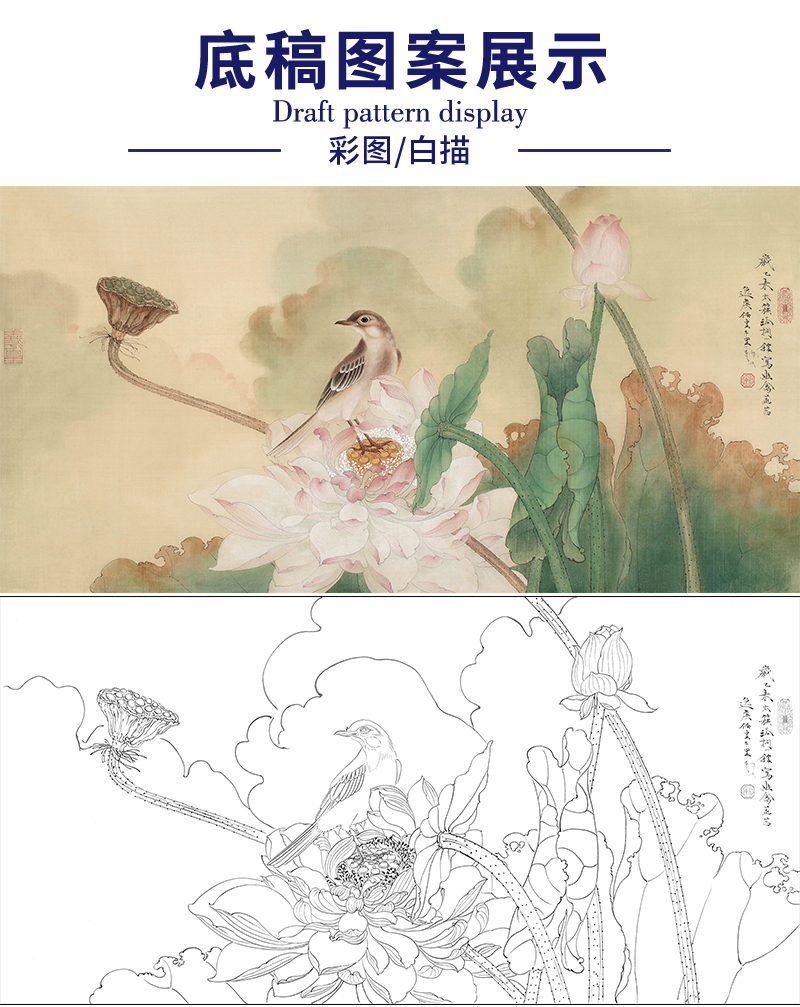 任重花鸟荷花工笔画白描底稿《幽禽菡萏》临摹勾线高清打印稿RD18