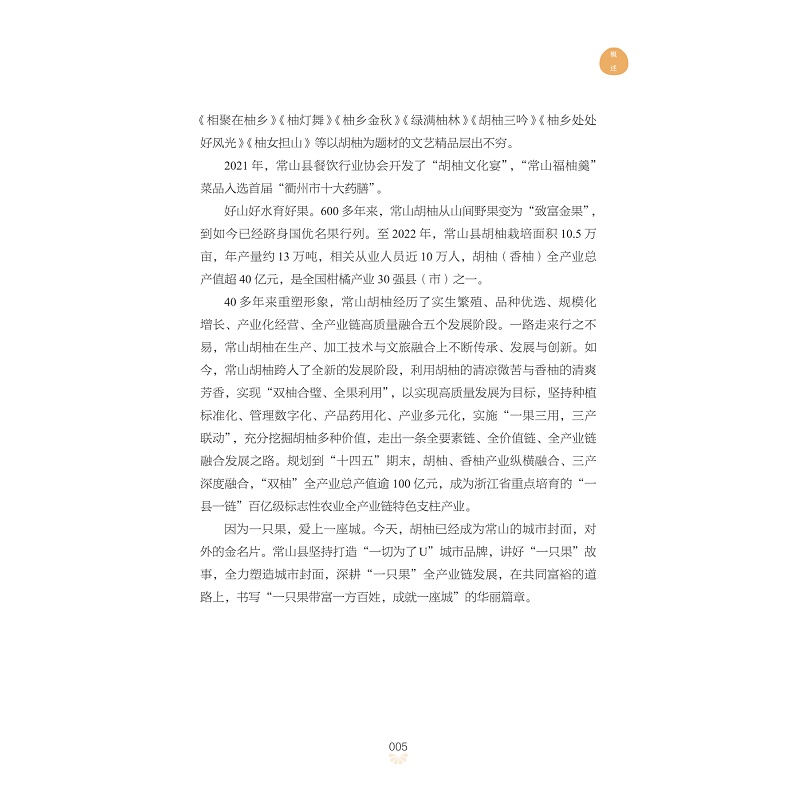 本书以地方特色资源品种常山胡柚的产业发展历程为主,记录了常山胡柚产业的初级发展、快速发展、产业化经营、全产链高质量发展的整个过程。具体从起源历史、品种特性、营养功效、品种选育、栽培管理、科技研究、产品开发、媒体宣传、节庆活动、文化发展、三产融合、历史人物、企业经营、政策支持等方面详细记述常山胡柚的发展历程。本书对研究地方特色产业发展,培育富民产业,实现共同富裕具有借鉴意义;对农业种植户、科技人员及农业农村产业管理人员具有生产实践指导意义。